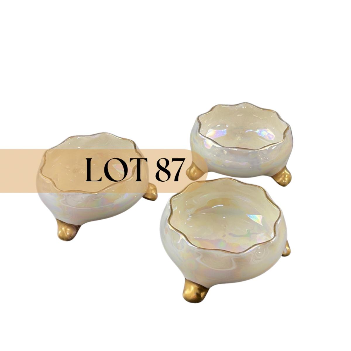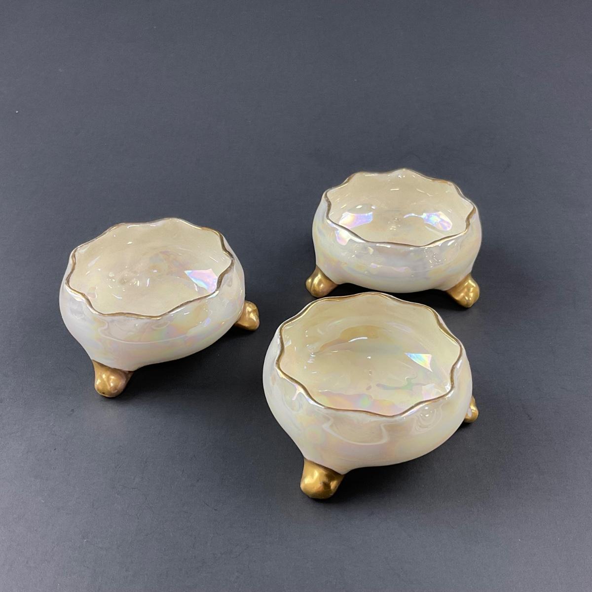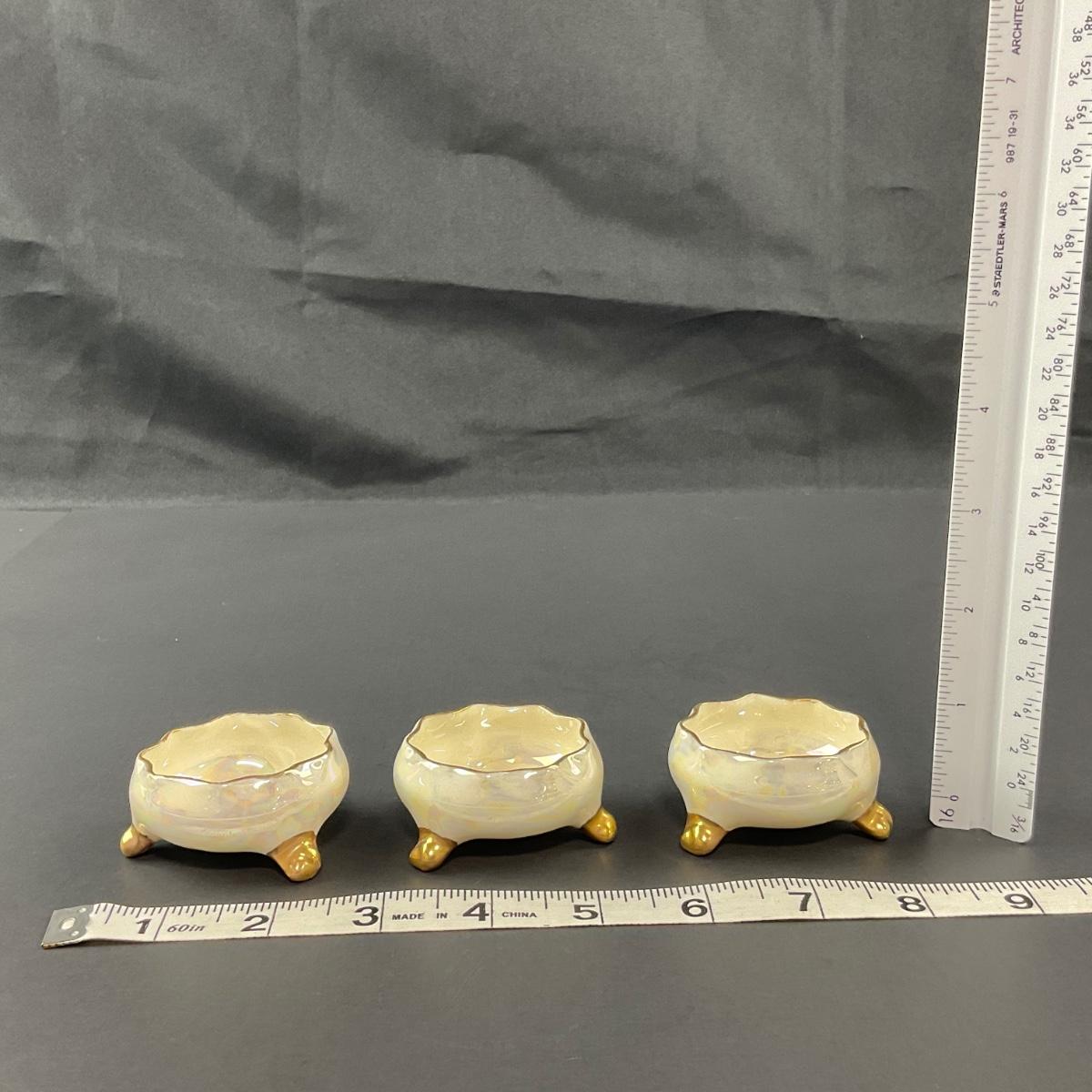 Three Lenox Belleek luster salt cellars marked. This piece has no damage, and appears to be in great shape with no visable chips, cracks, or broken pieces. Please see photos for details and condition. Any condition statement is given as a courtesy to a client, is an opinion, and should not be treated as a statement of fact. Reference to condition written, oral or within a condition report shall not be regarded as a full account of condition and may not include all defects, alterations, or restorations. Absence of a condition report does not imply a lot is flawless or lacking imperfections or damage. Katherine’s Auction & Appraisal Service shall have no responsibility for any error or omission. Returns shall not be accepted on the basis of condition. ::: Shipping is available on this lot. If you require shipping you must let us know at the close of the auction. We will coordinate with you after the item has been won. Shipping fees will include insurance up to or exceeding the value of all items being mailed. If you have any questions regarding this lot please contact the auctioneer either via this website, by direct email or by phone. PICK UP TIMES and other important information can be found in the TERMS and DESCRIPTION of the auction. Please take a look for pertinent information. Thanks!