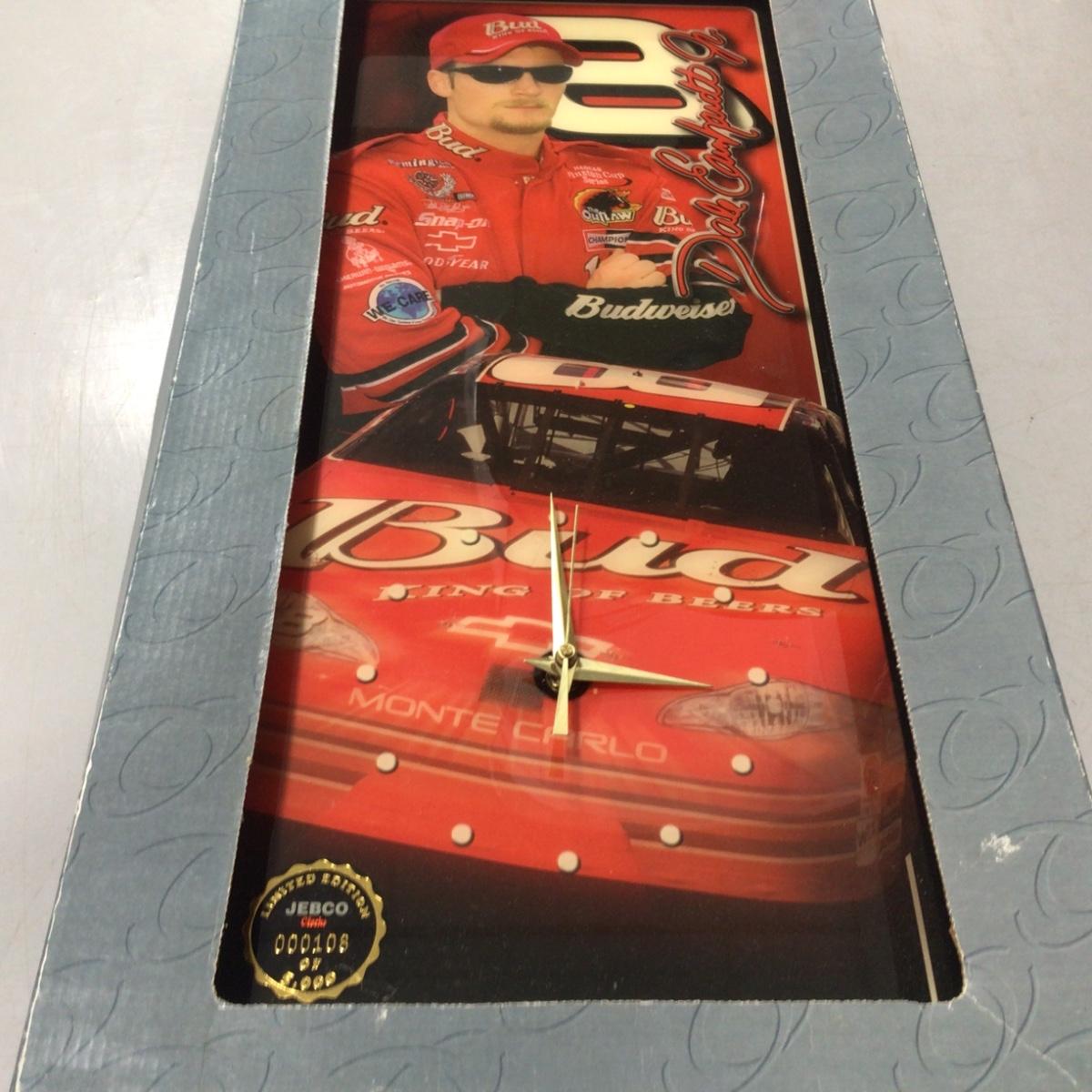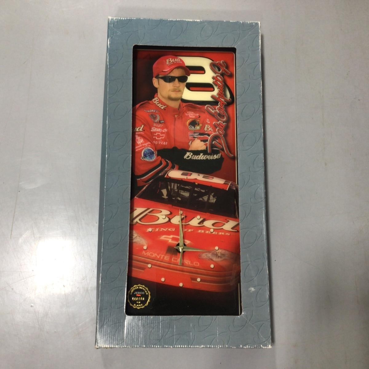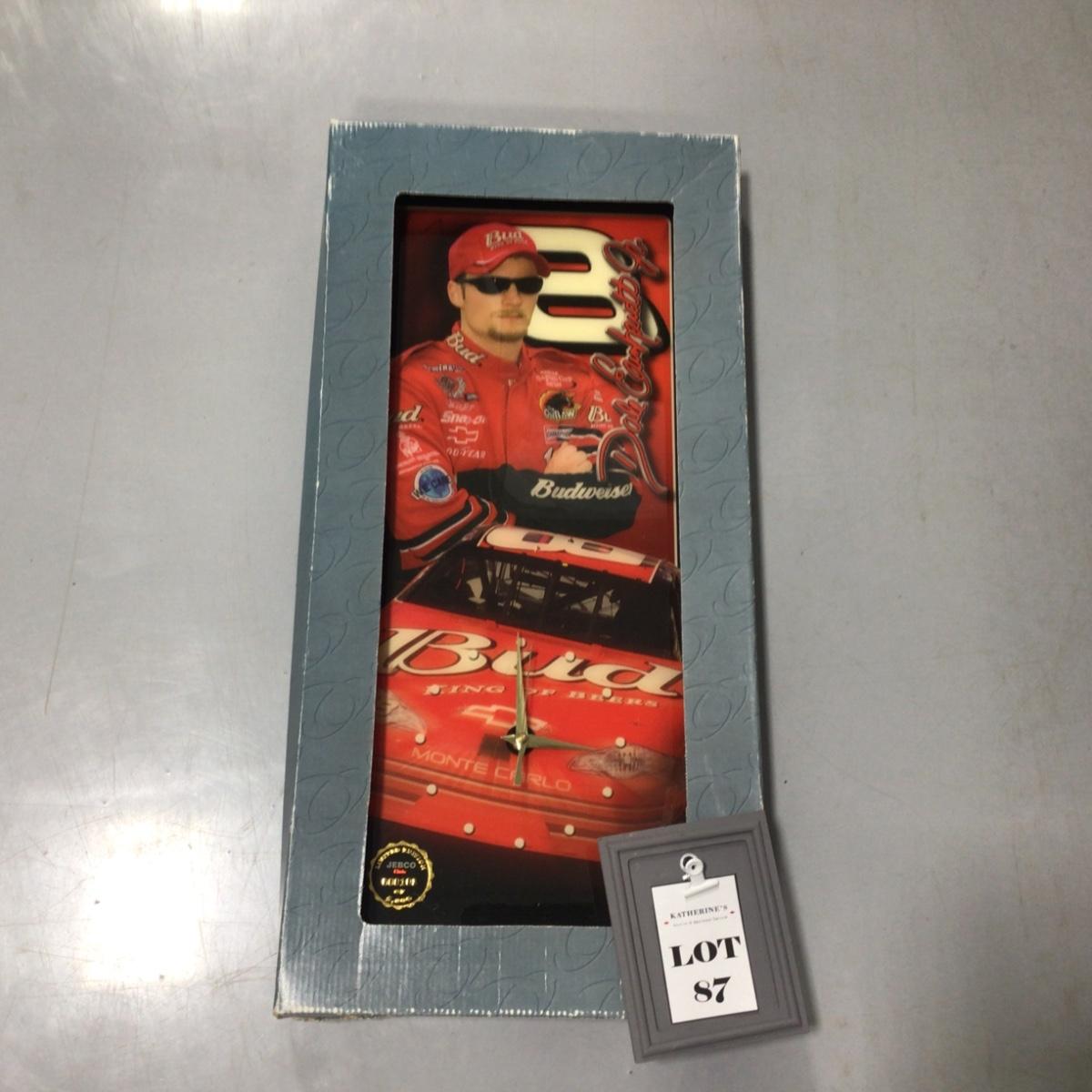 Number 8 Bud driver Dale Earnhardt Jr. collectors clock. 11 inches by 24 inches. Please see photos for details and condition. ::: Shipping is available on this lot. If you require shipping you must let us know at the close of the auction. We will coordinate with you after the item has been won. Shipping fees will include insurance up to or exceeding the value of all items being mailed. If you have any questions regarding this lot please contact the auctioneer either via this website, by direct email or by phone. PICK UP TIMES and other important information can be found in the TERMS and DESCRIPTION of the auction. Please take a look for pertinent information. Thanks!