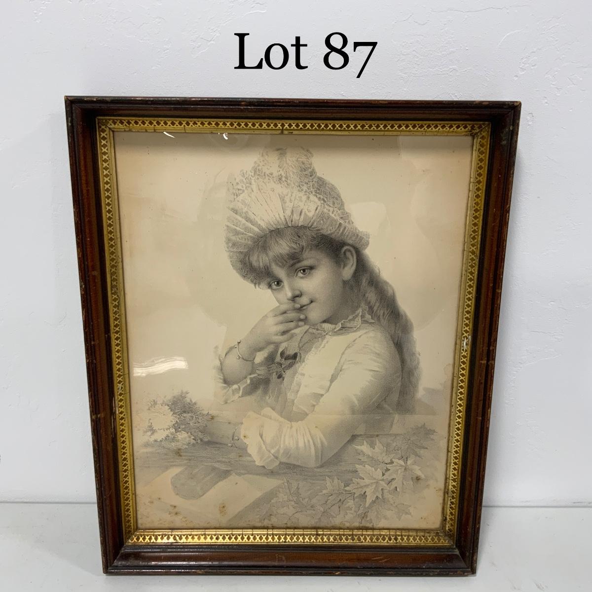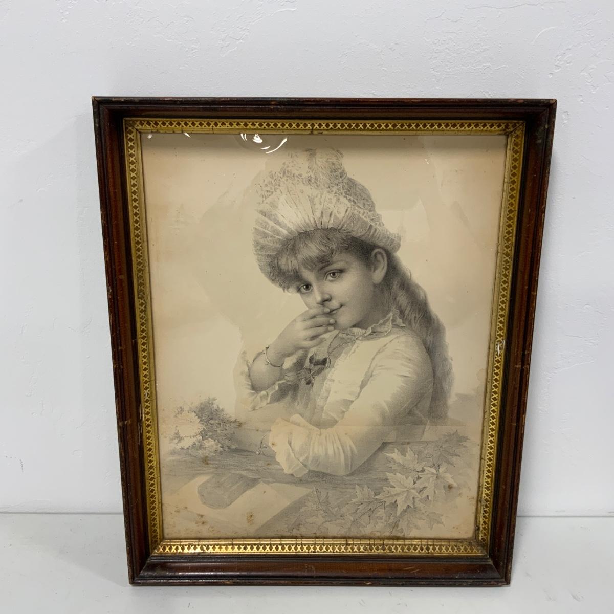 Bashful Victorian Girl Print in Original Frame, circa 1880. Get a load of that hat! The detail in the print is really nice and would be a fine addition to any room in your house. Frame Measures 22” x 18”. Could use a little touch up, but overall a really nice piece. Please see photos for details and condition. ::: Shipping is NOT available on this lot. If you have any questions regarding this lot please contact the auctioneer either via this website, by direct email or by phone. PICK UP TIMES and other important information can be found in the TERMS and DESCRIPTION of the auction. Please take a look for pertinent information. Thanks!