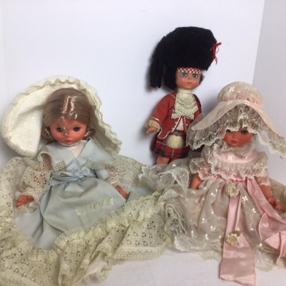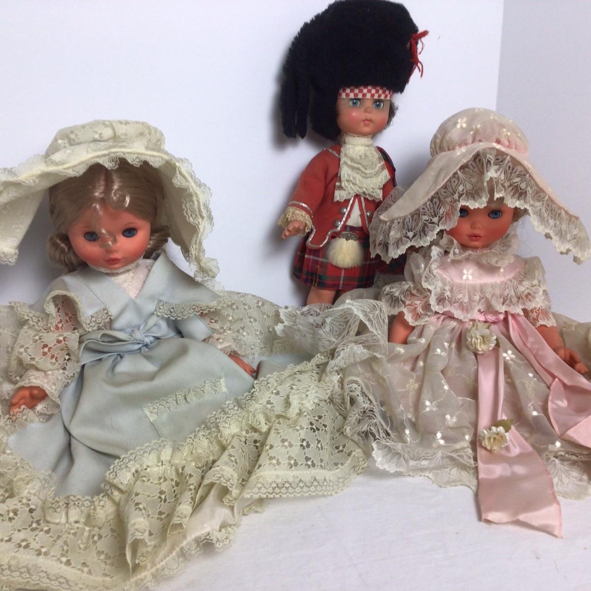 There are 2 victorian dressed plastic dolls and a Beefeater souvenir doll.