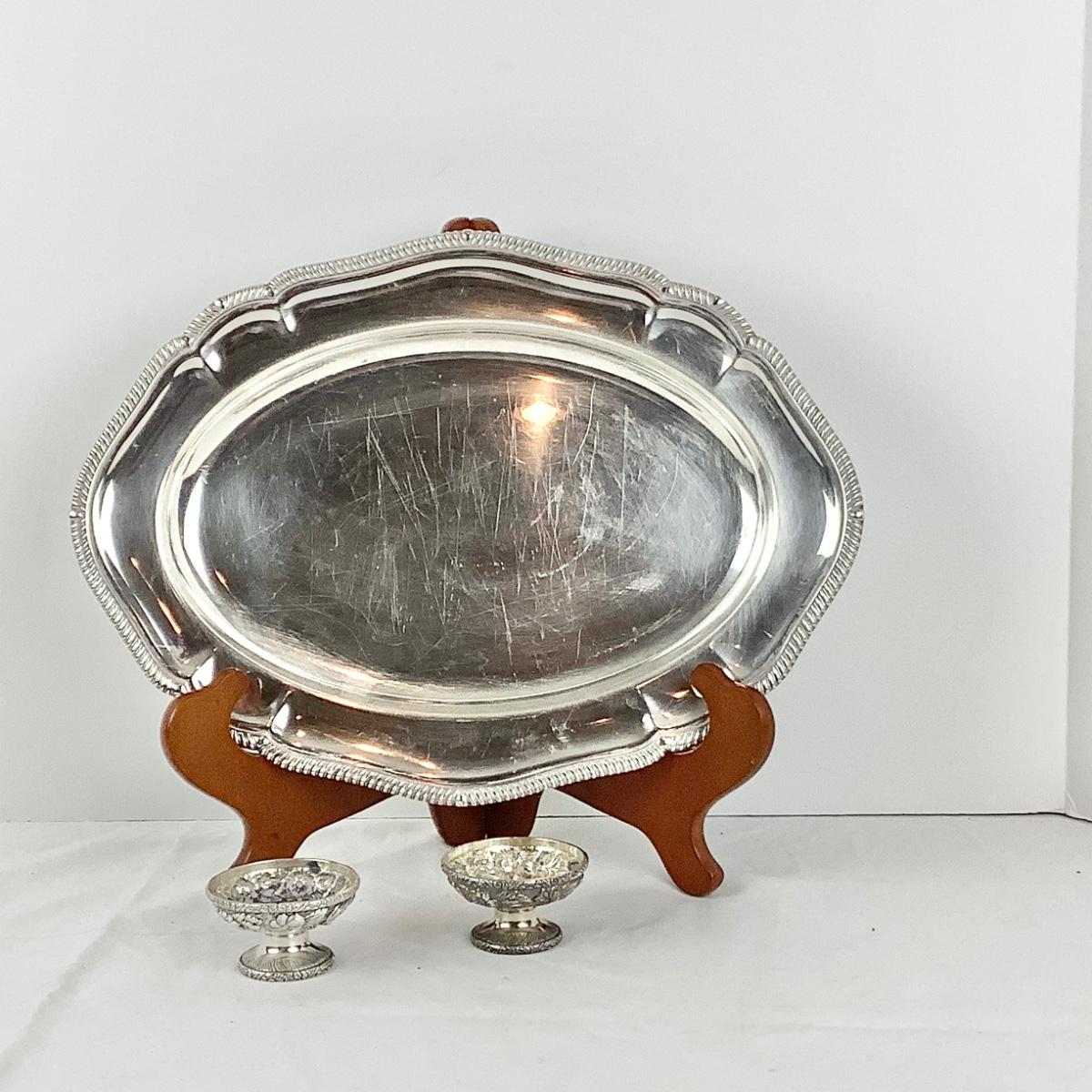 8706 Tiffany & Co. Silver plated Oval Tray with Two Sterling Salts