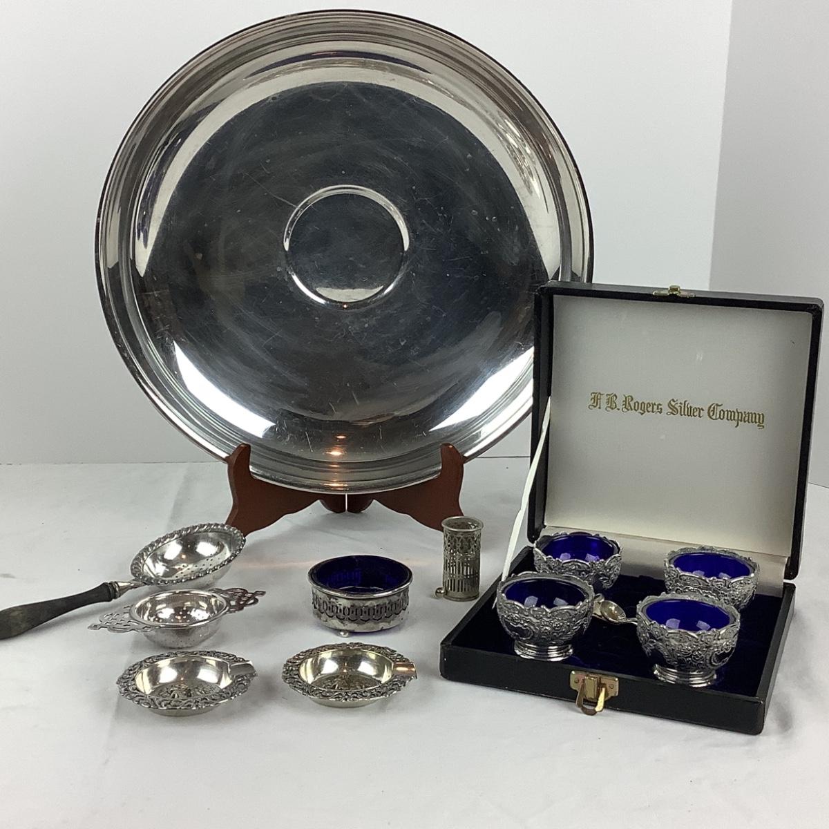 Danish ashtrays, silverplated salts , sterling tea strainer with wooden handle , large round silver plate serving tray