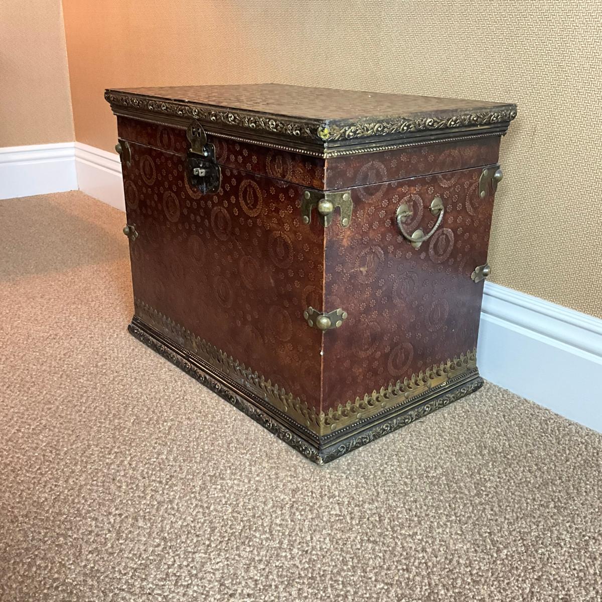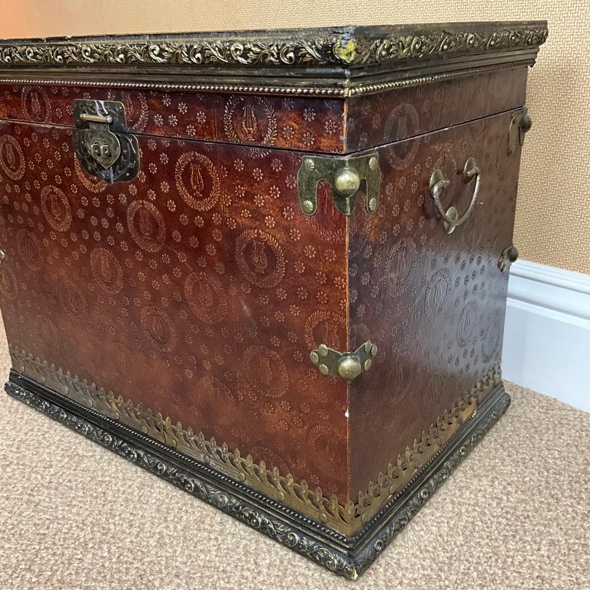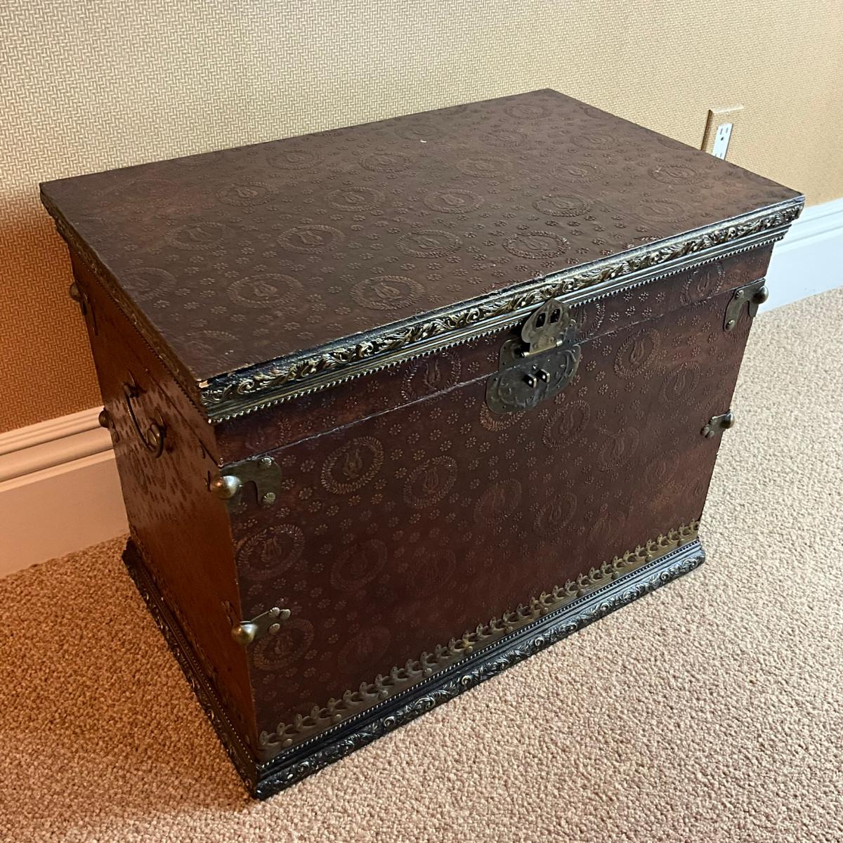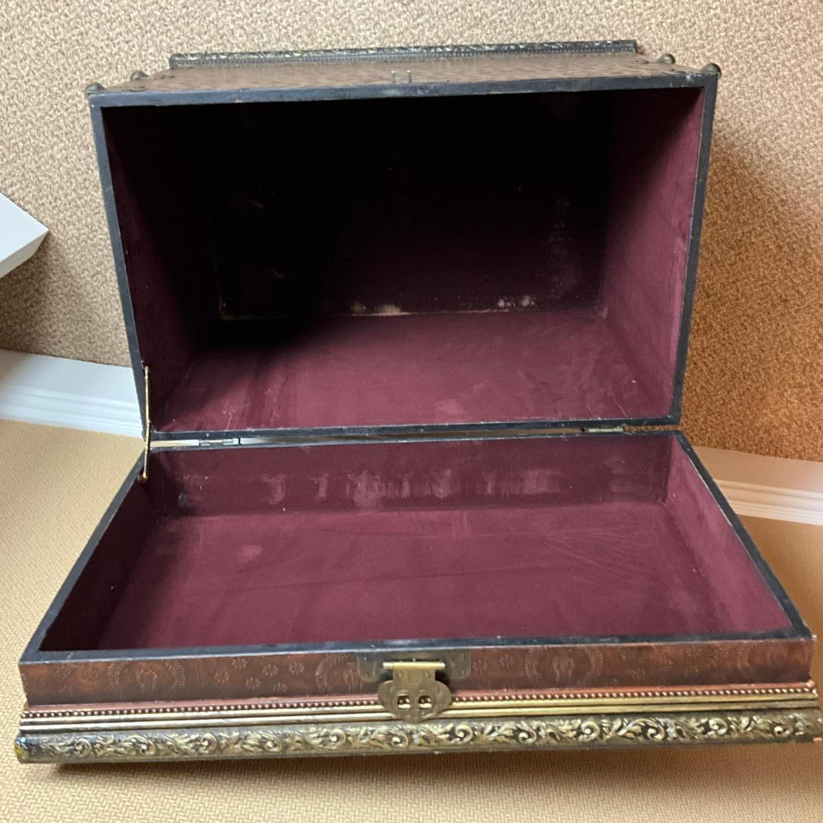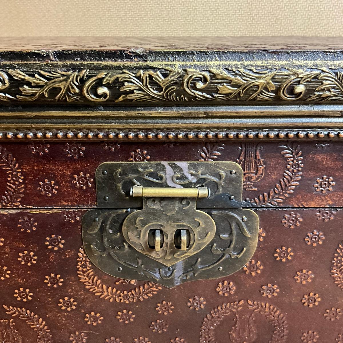 Embossed design covering box with brass accents , latch front and metal decorative trim