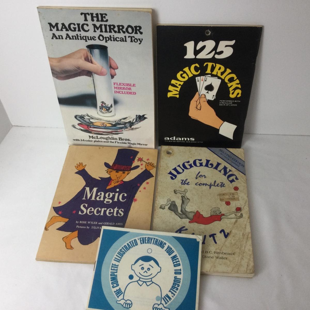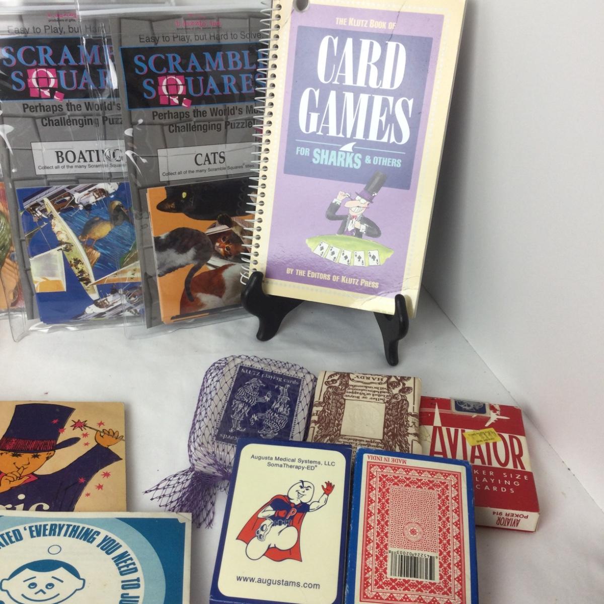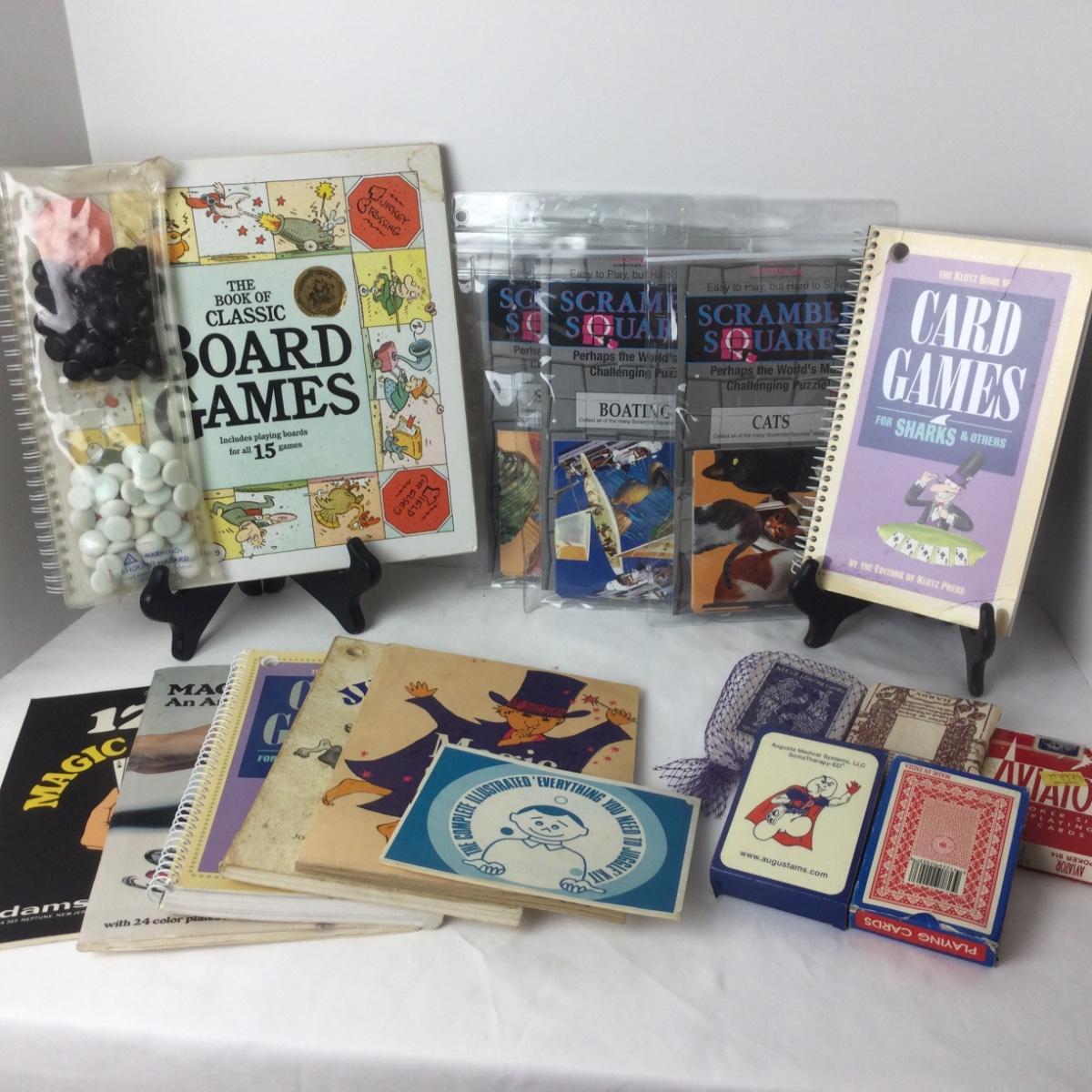 Assorted vintage books on card games, magic tricks and juggling. There are several scramble squares puzzles and travel board game book.