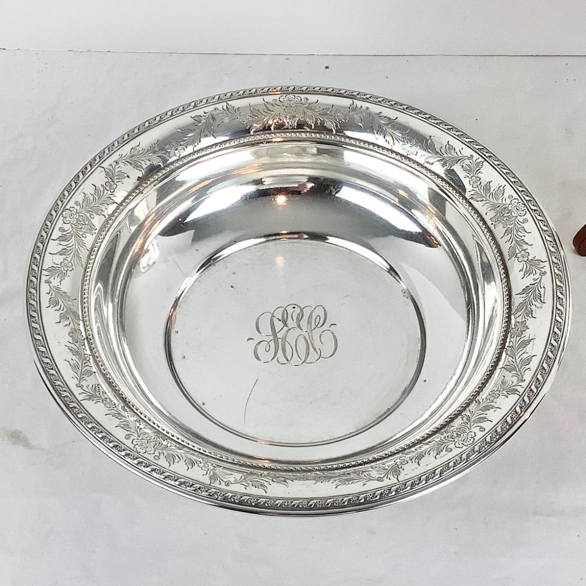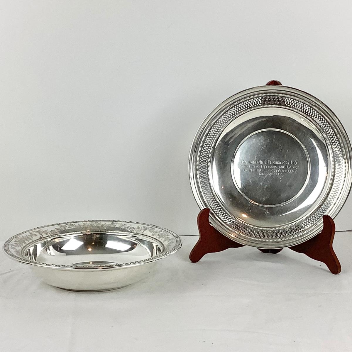 Measuring 9" round with engraving of artillary award, and the deeper bowl is 9" x 2" high both weighing 13.4 troy ounces