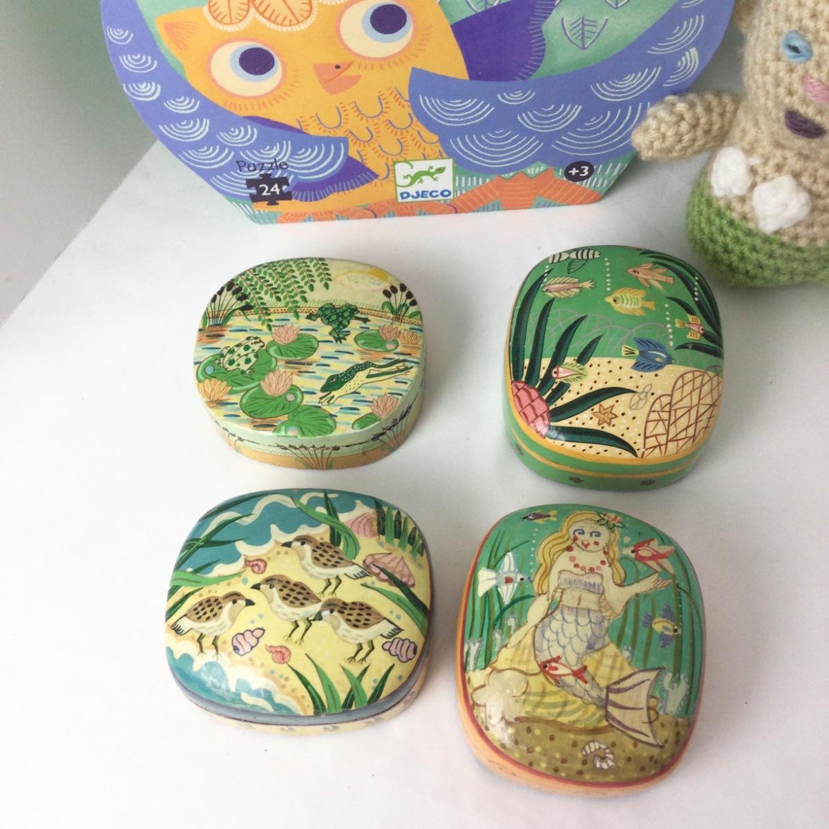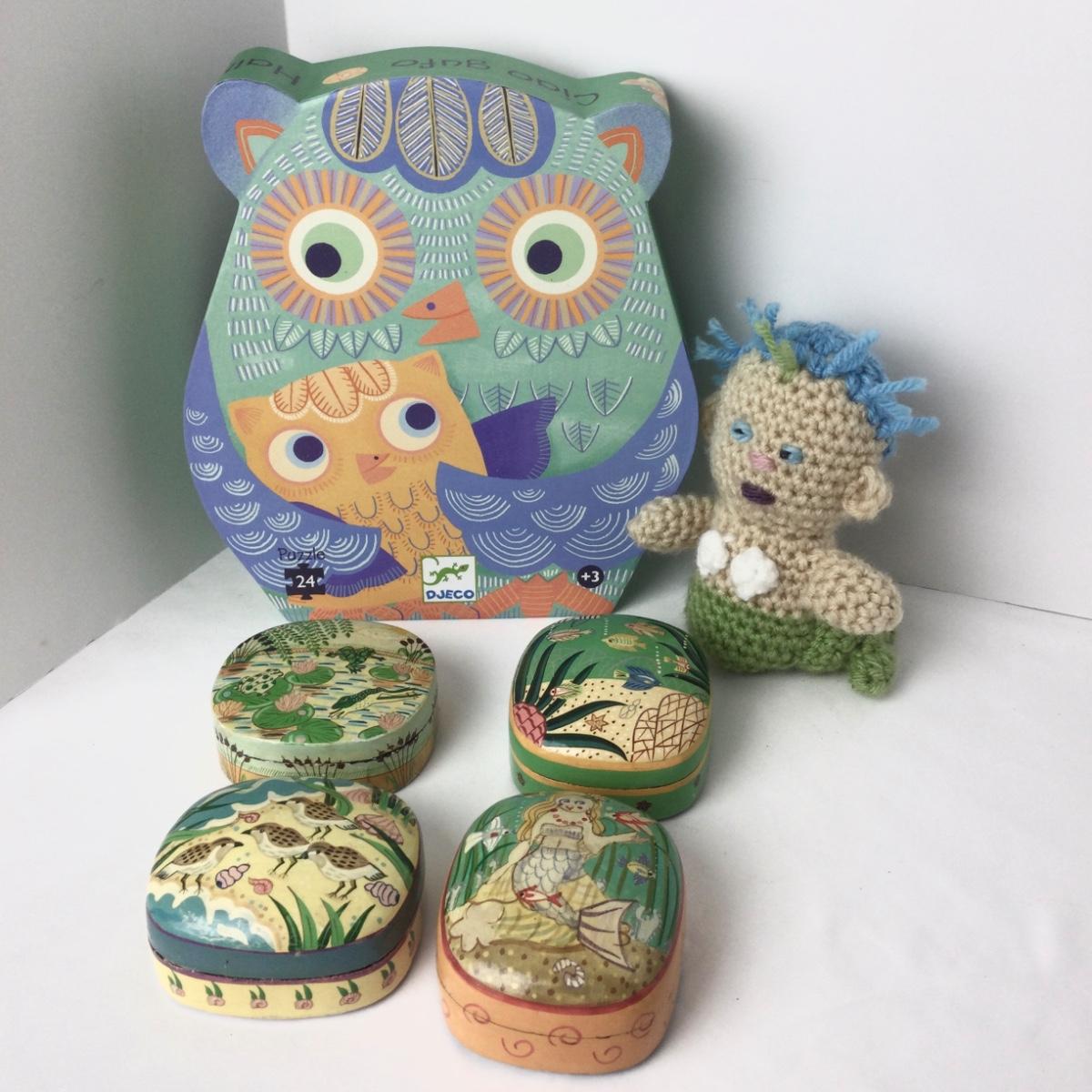Mermaid is hand made, 4 wooden drinker boxes with hand painted nautical scenes, Owl colorful puzzle is included.