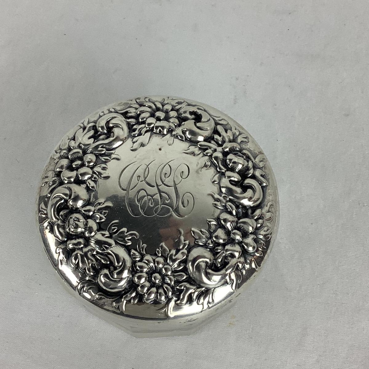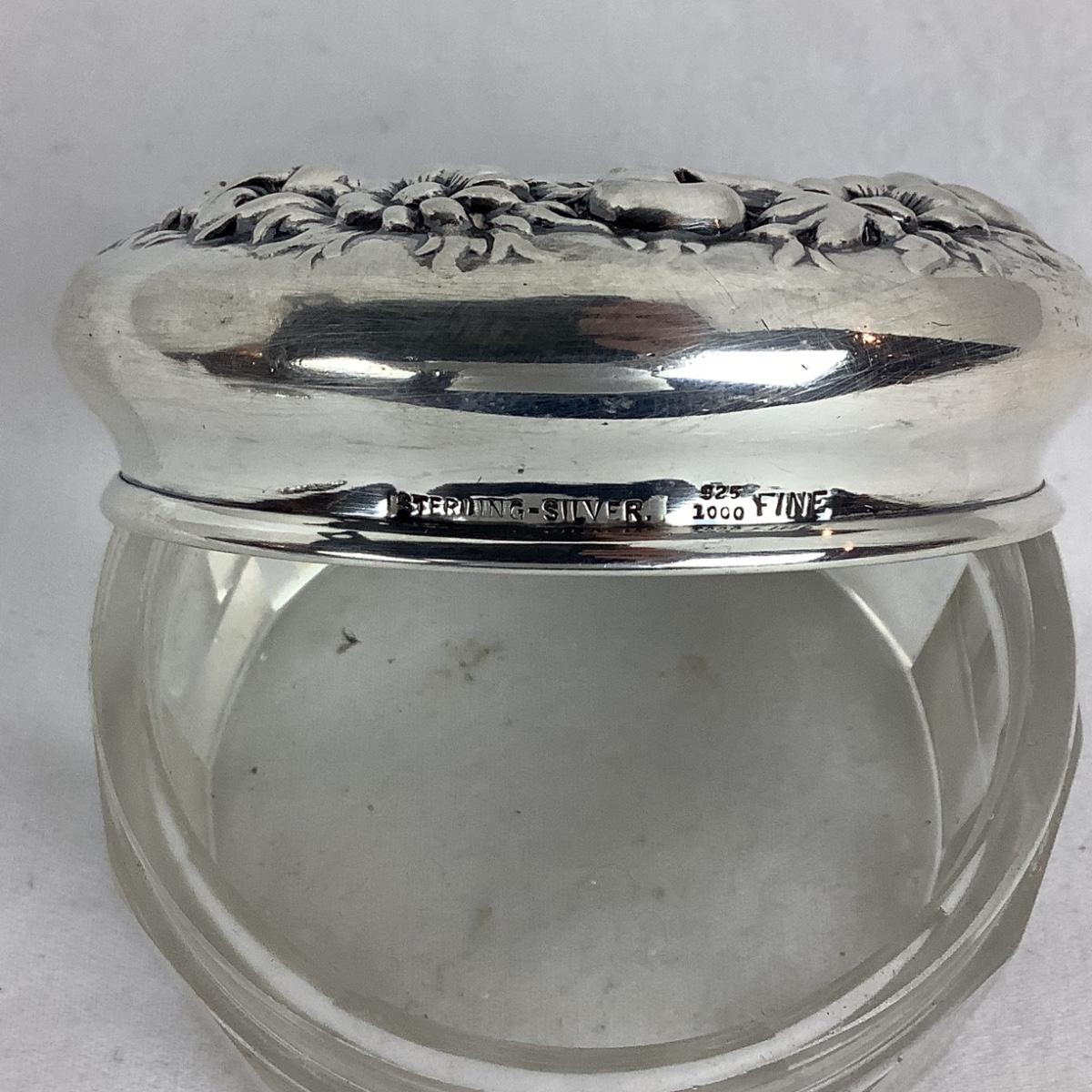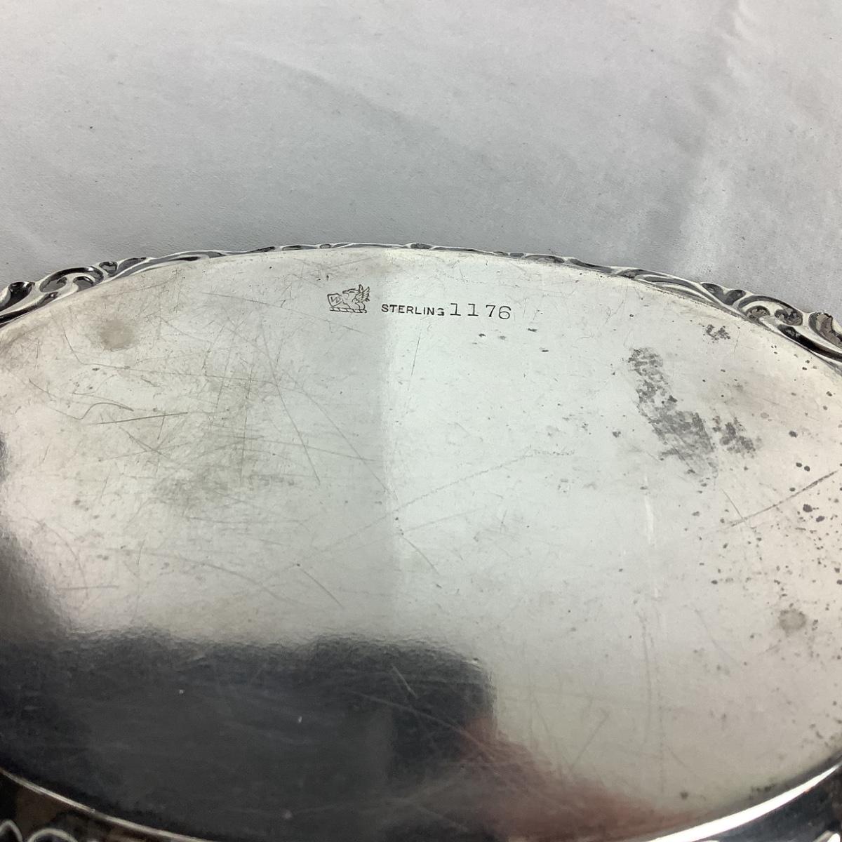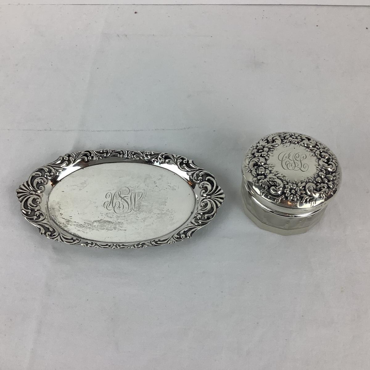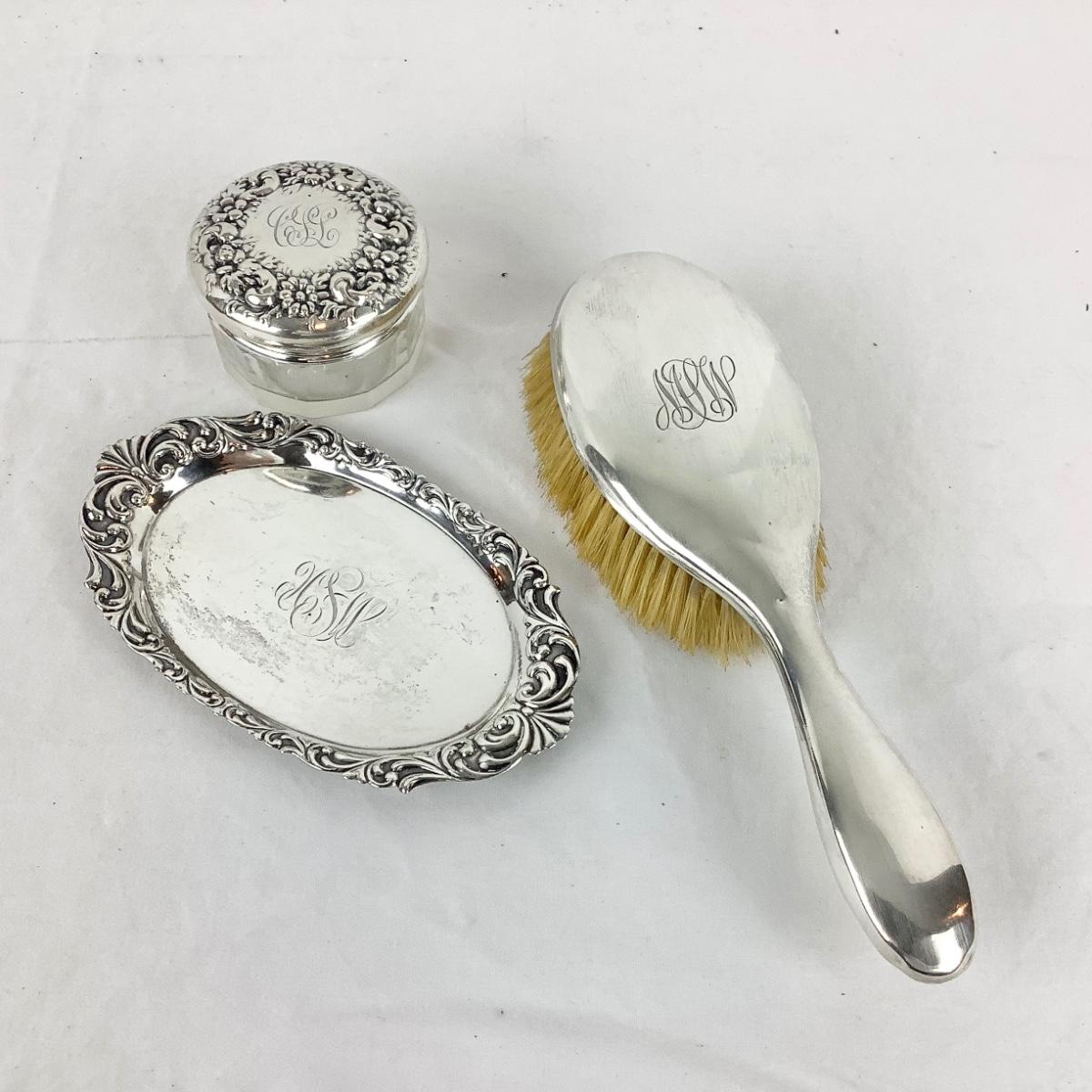 Sterling silver vanity glass jar with monogrammed top measuring 2.75" round and 1.75" high , oval sterling tray with monogram in center measuring 6" x 3.5" and sterling hairbrush with center monogram measuring 8.5"