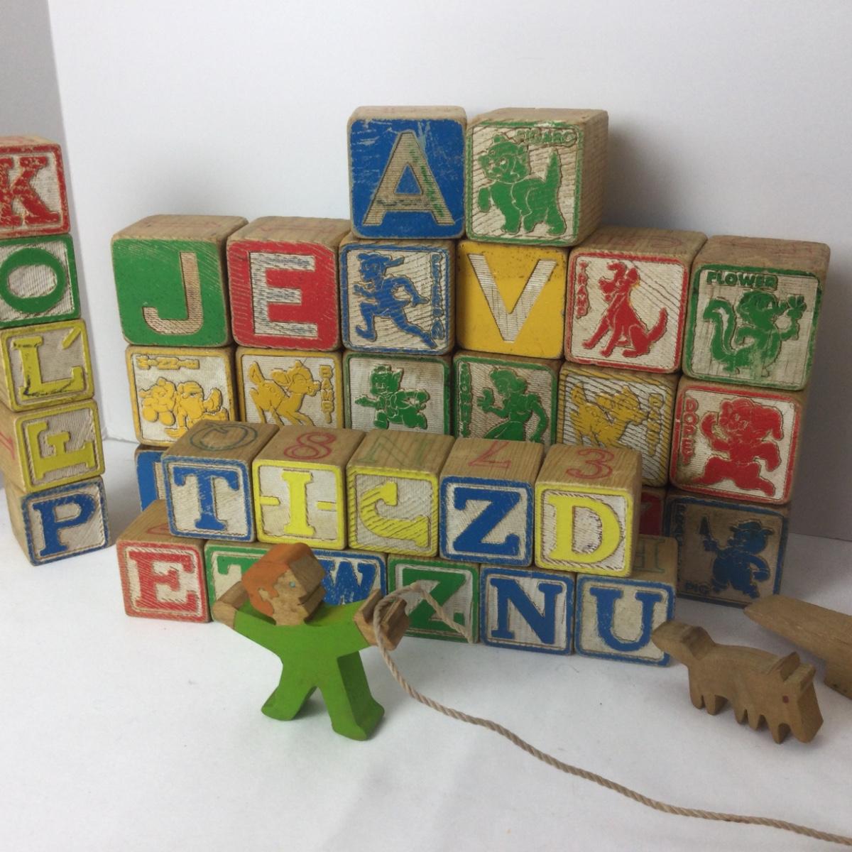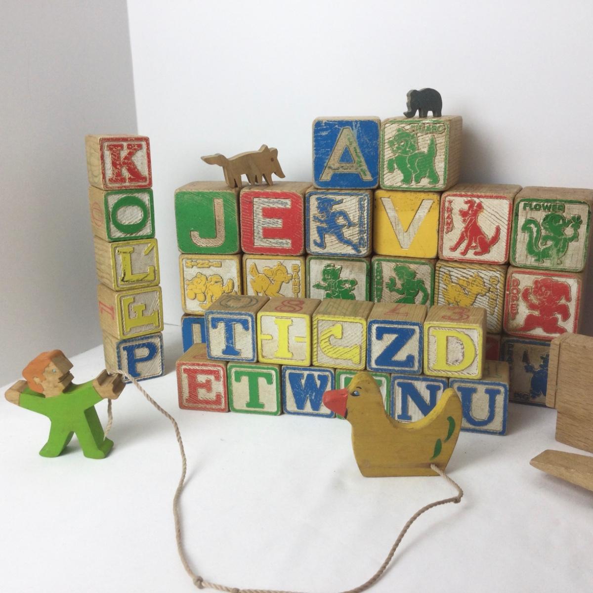 873 Vintage ABC Wooden Blocks & Hand Cut Animals