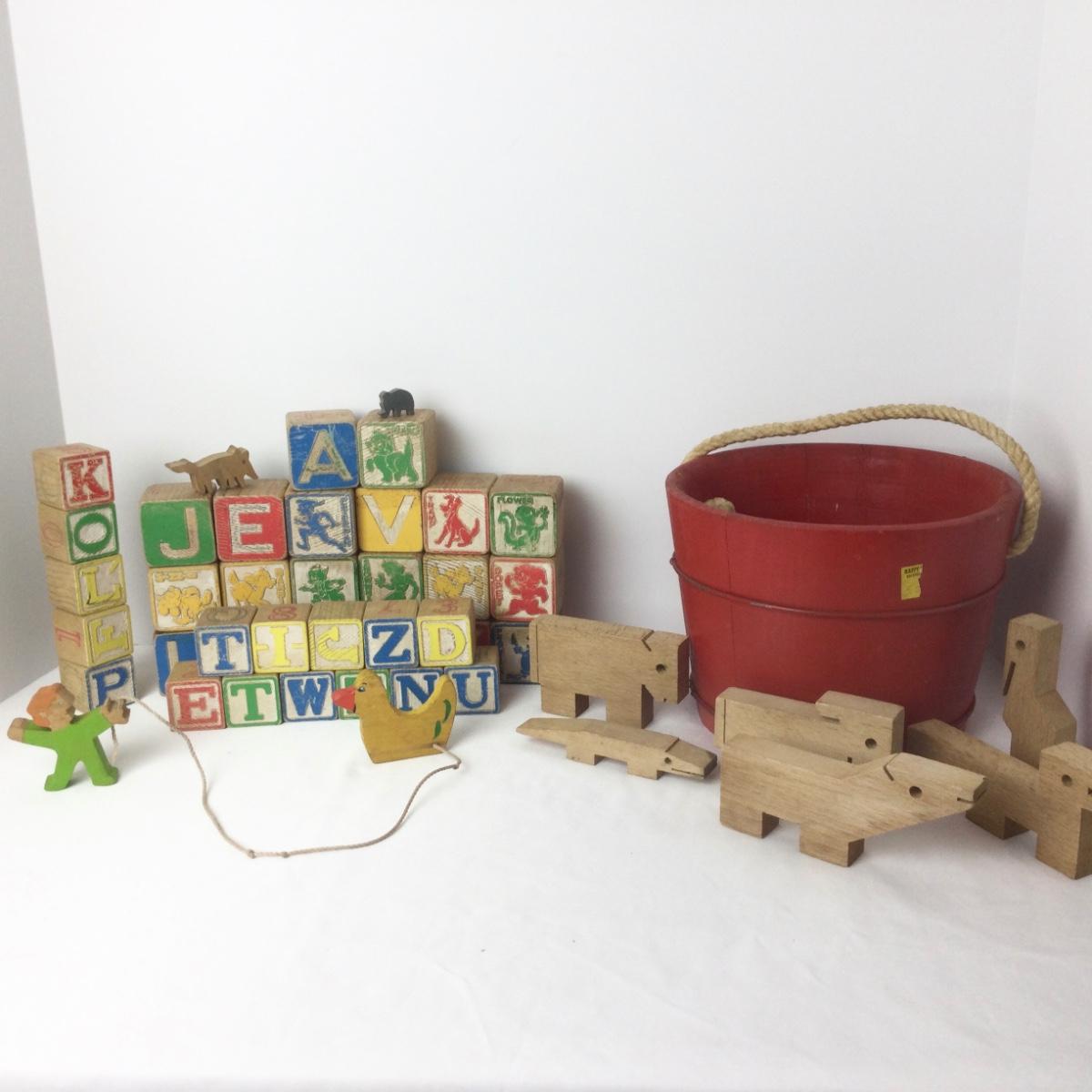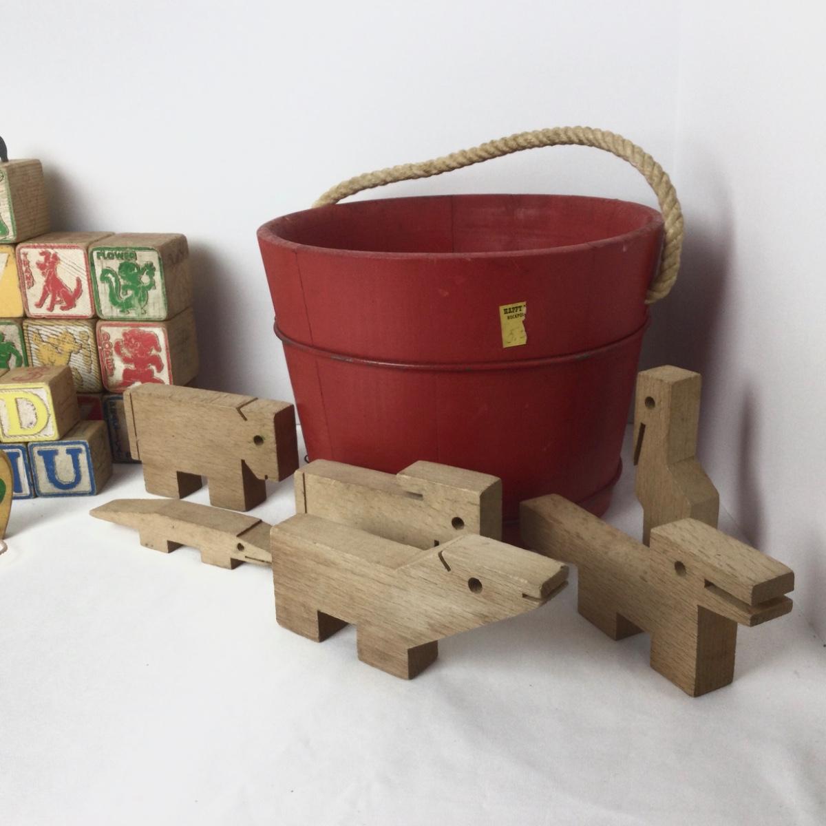 Vintage red wooden pail with wooden alphabet blocks and hand cut wooden animals.