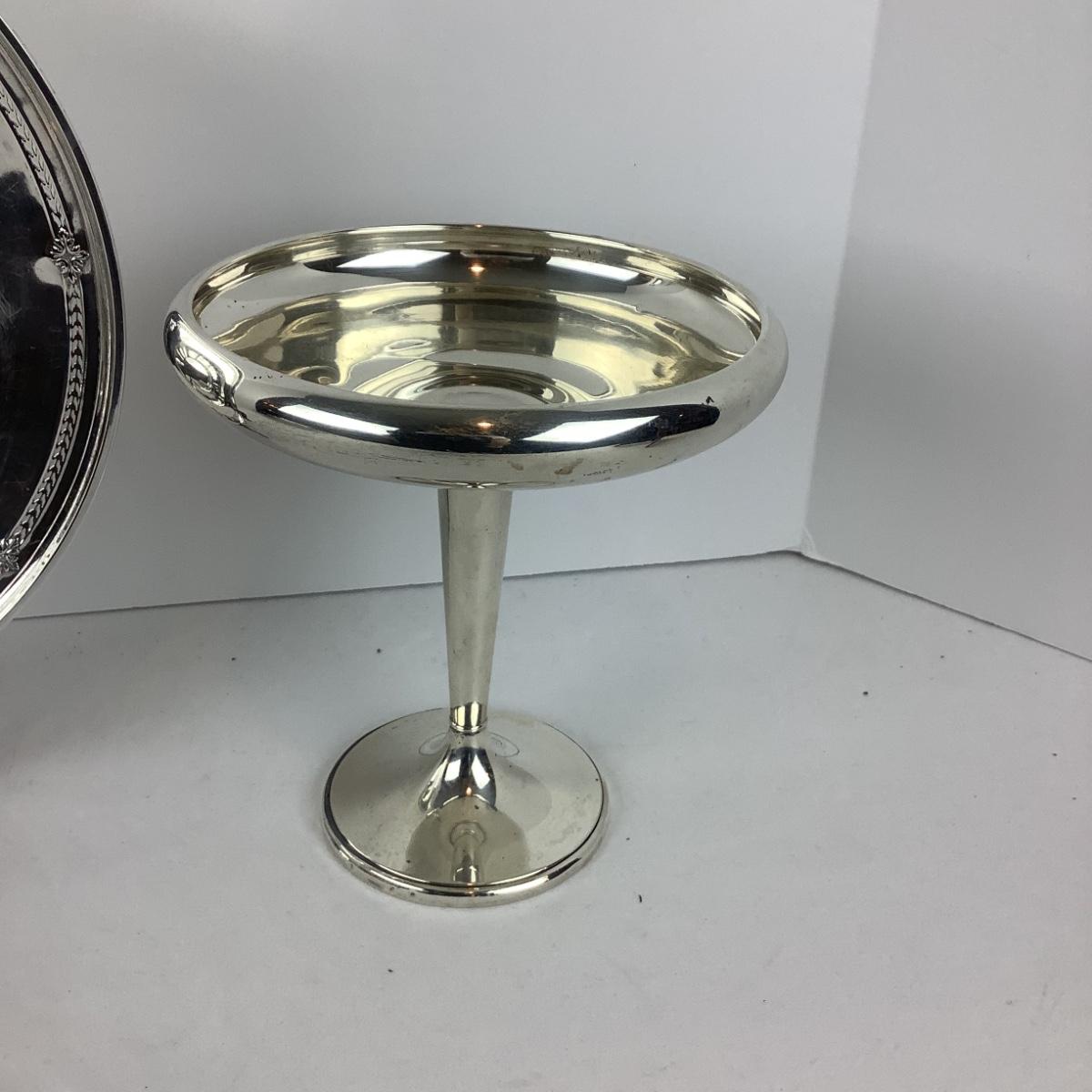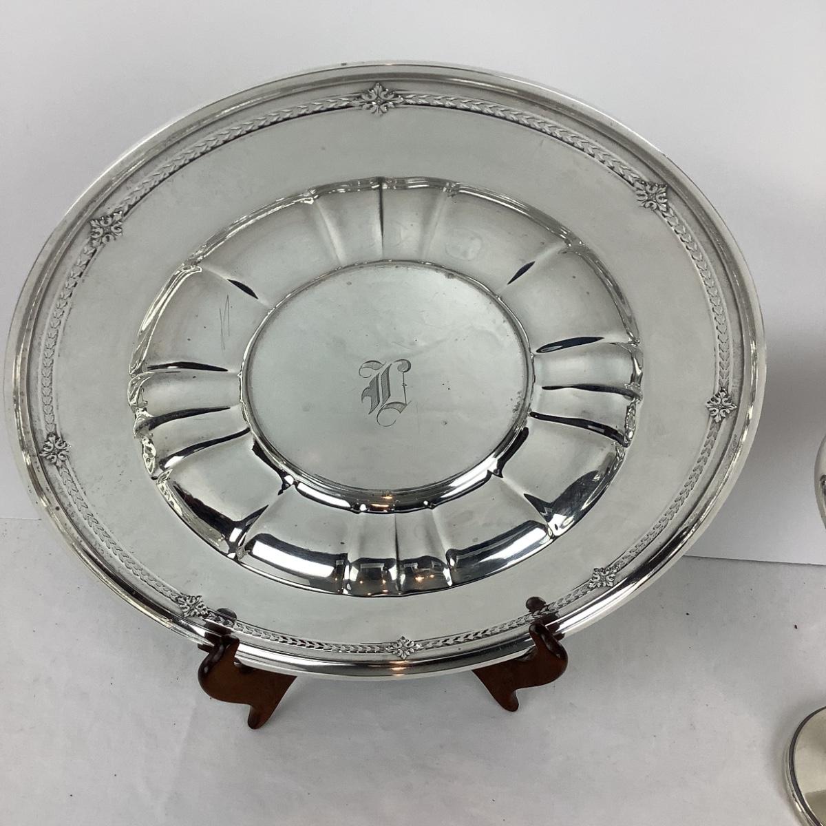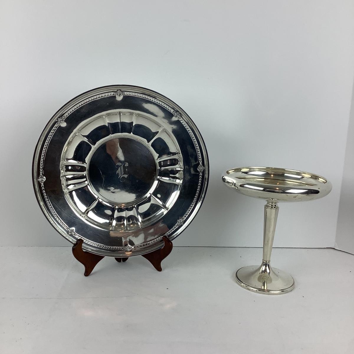 Plate is 10" and monogramed in center, the pedestal is 6" high x 6" round and the plate weighs 7.6 troy ounces.