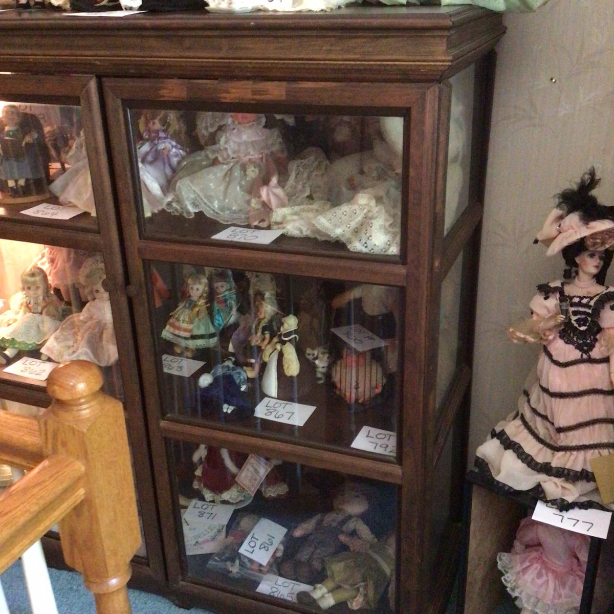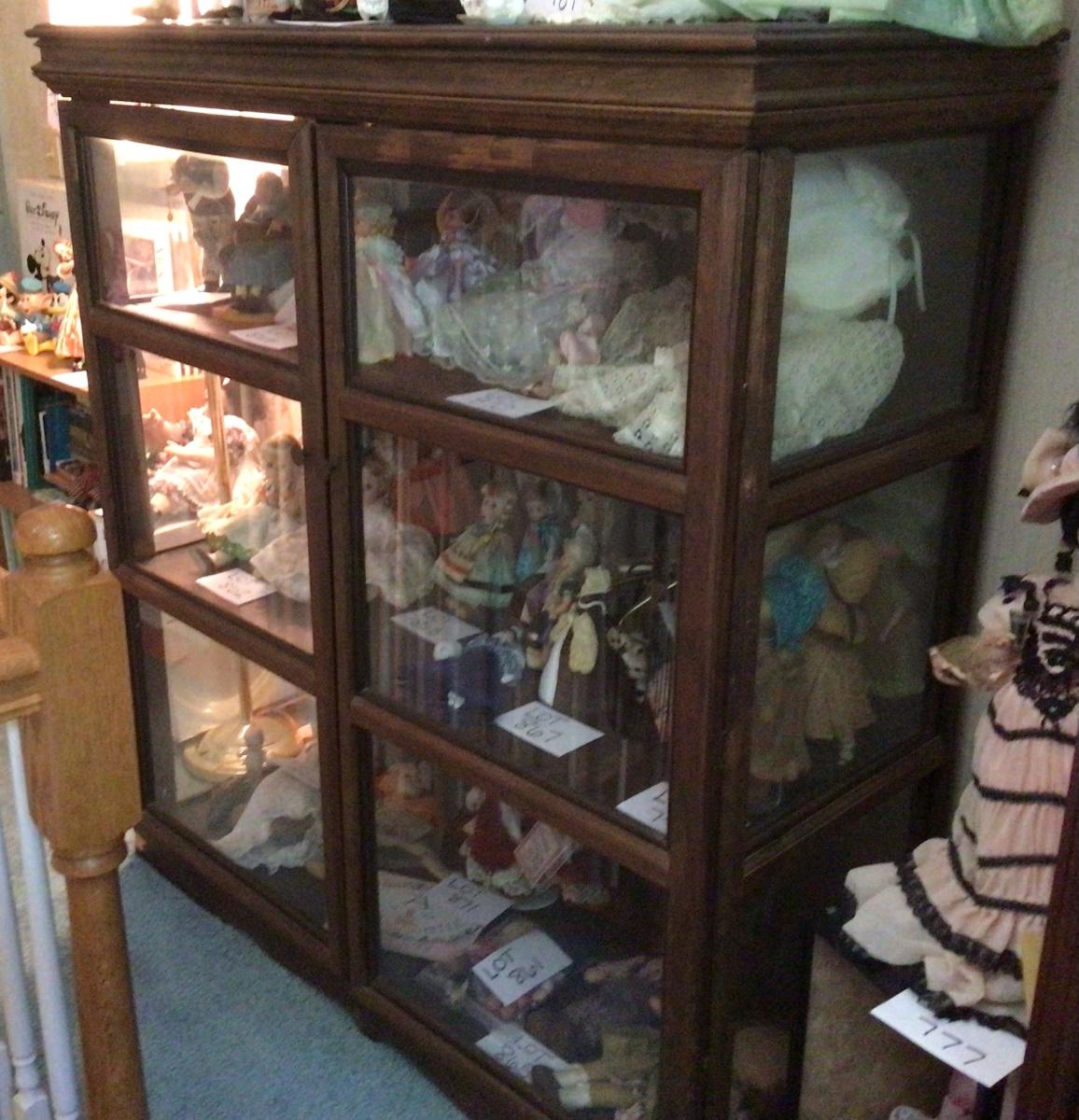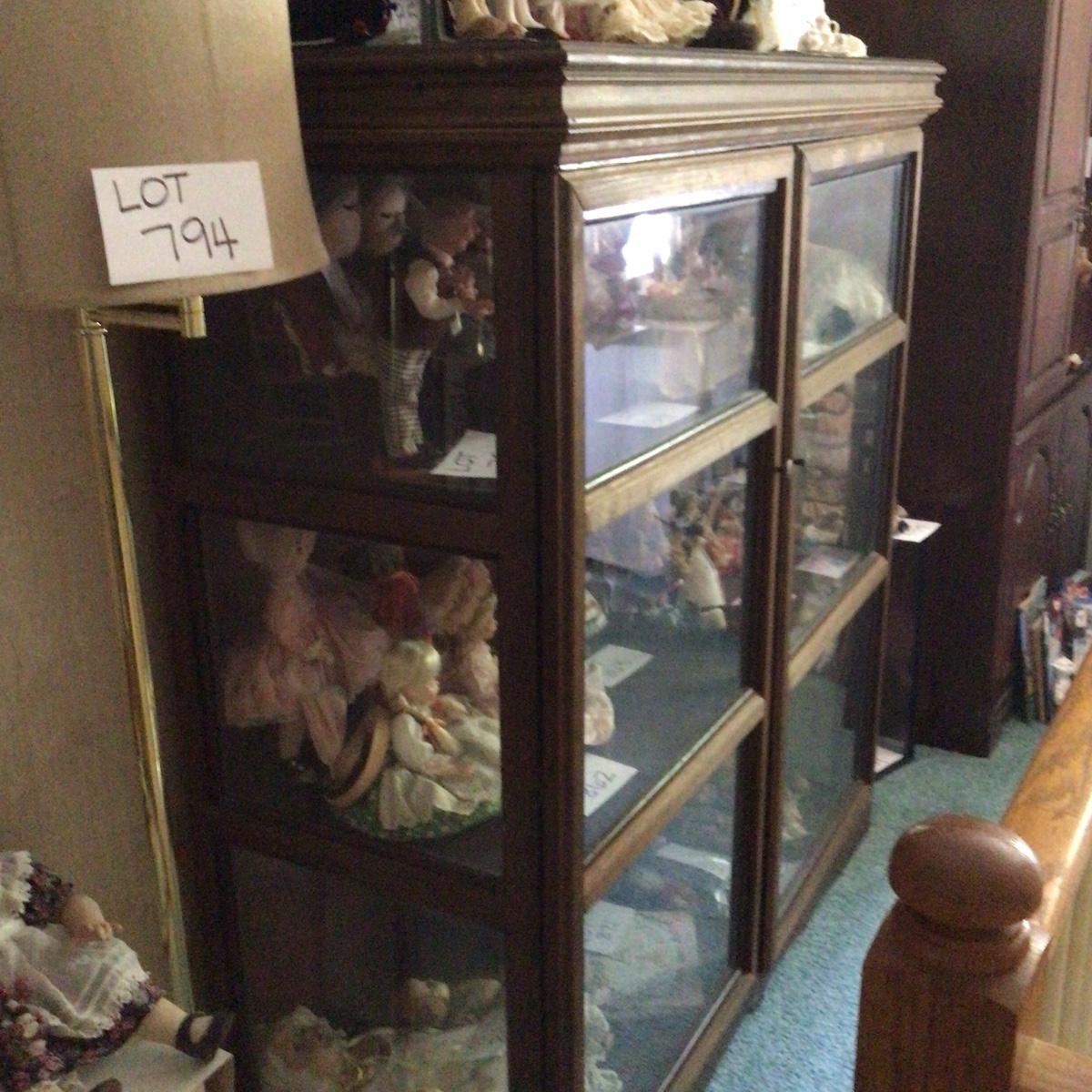 Large wooden cabinet with interior lights. Glass is on all three sides The cabinet is 50” wide x 54” tall and 20” deep. ***THE CONTENTS ARE NOT INCLUDED. This listing is for the cabinet alone.