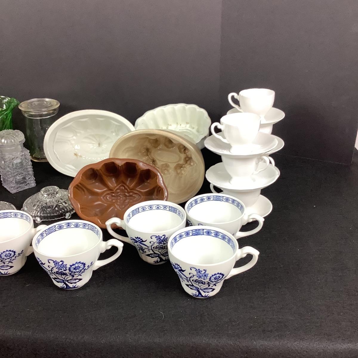 England teacups , 4 ironstone molds , cordials, glass jars, candlesticks and much more