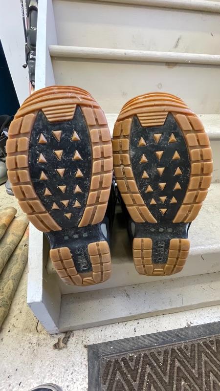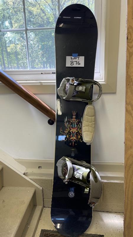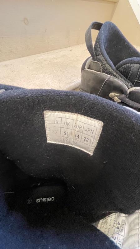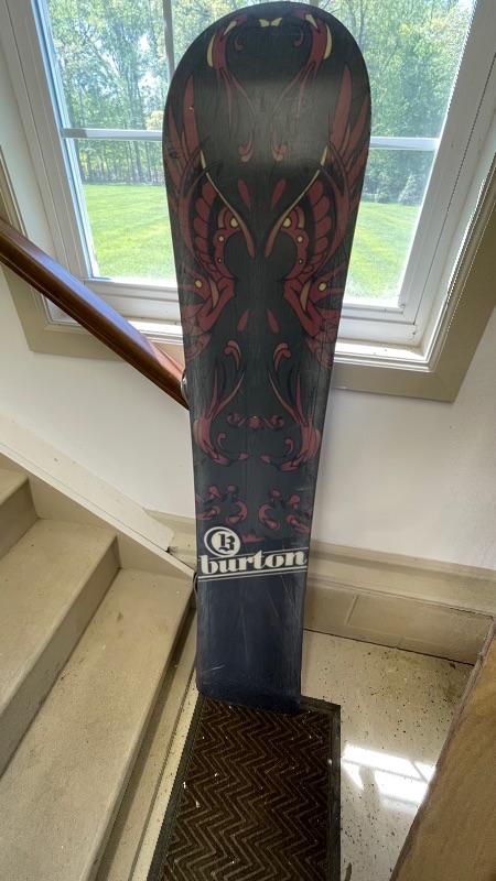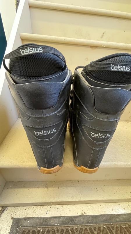 Burton Canyon 63 Snow Board-63”L x 10.5”W. Board has some wear with a slight chip on one edge-see pic. Also included Qty (1) Pair Celsius snow board boots-size 10
