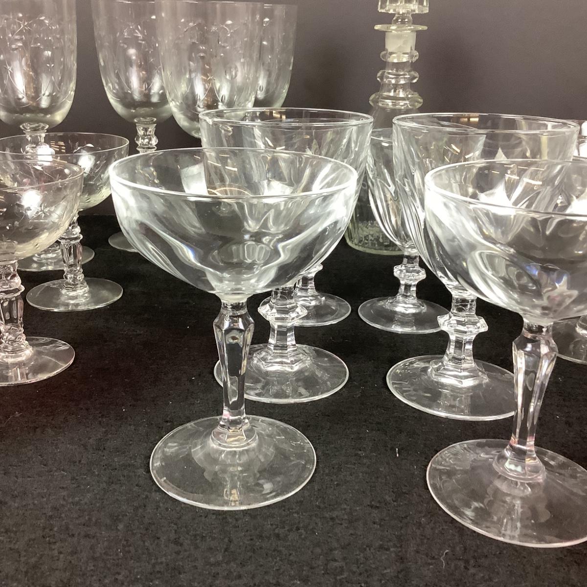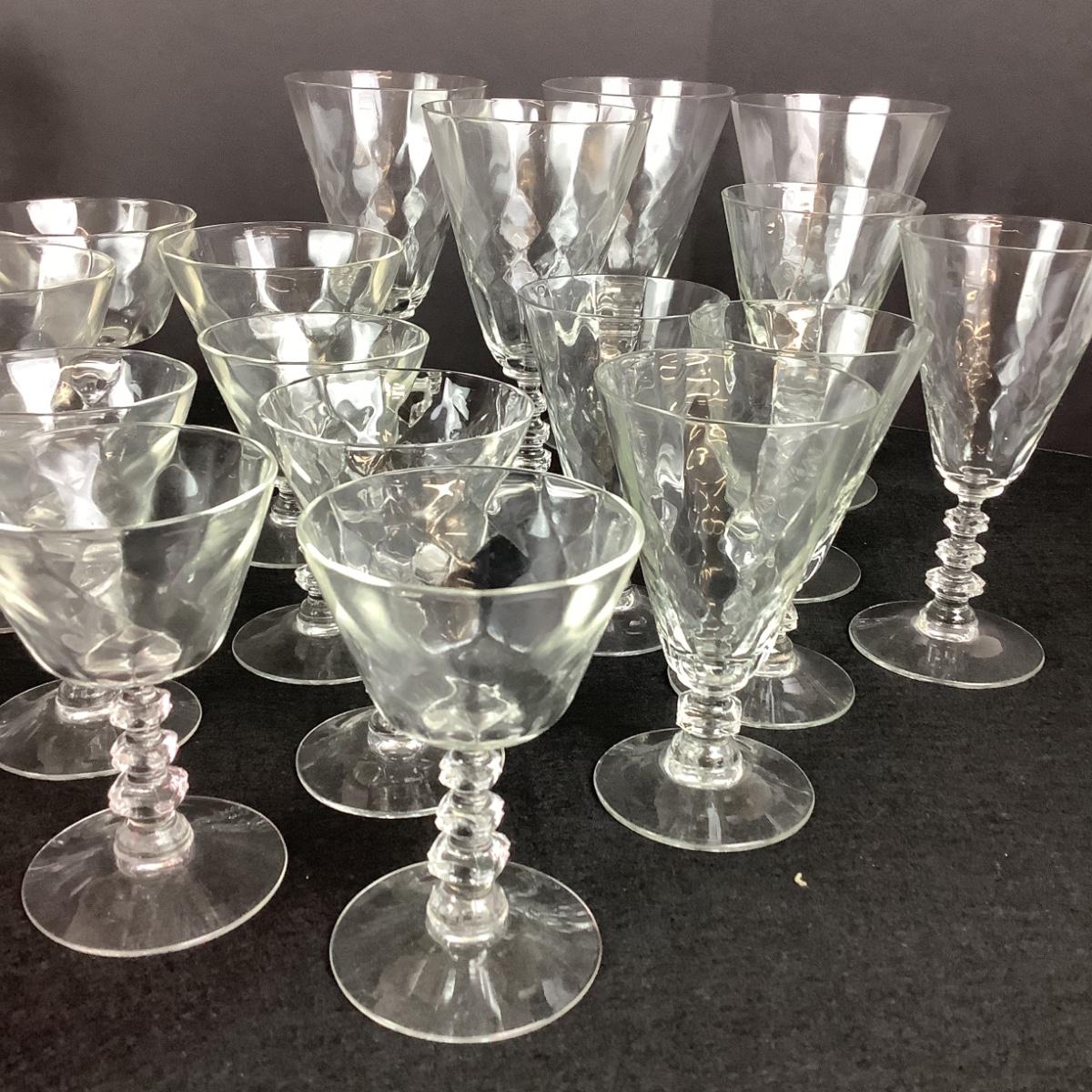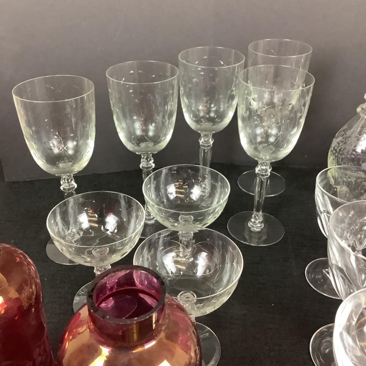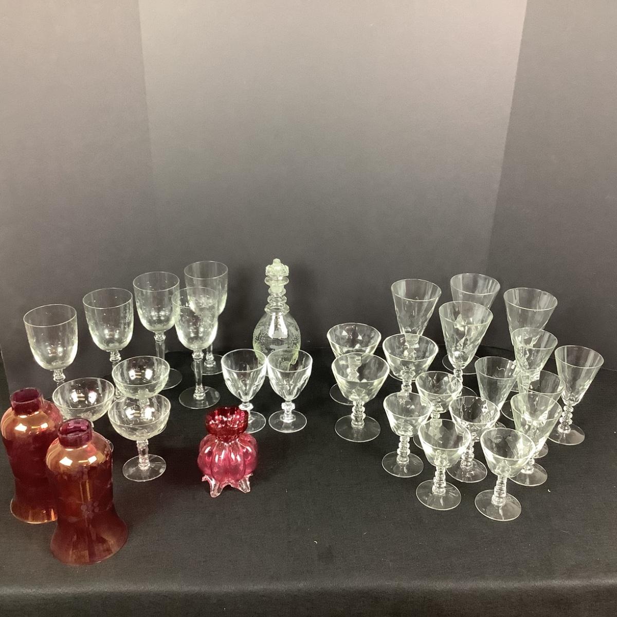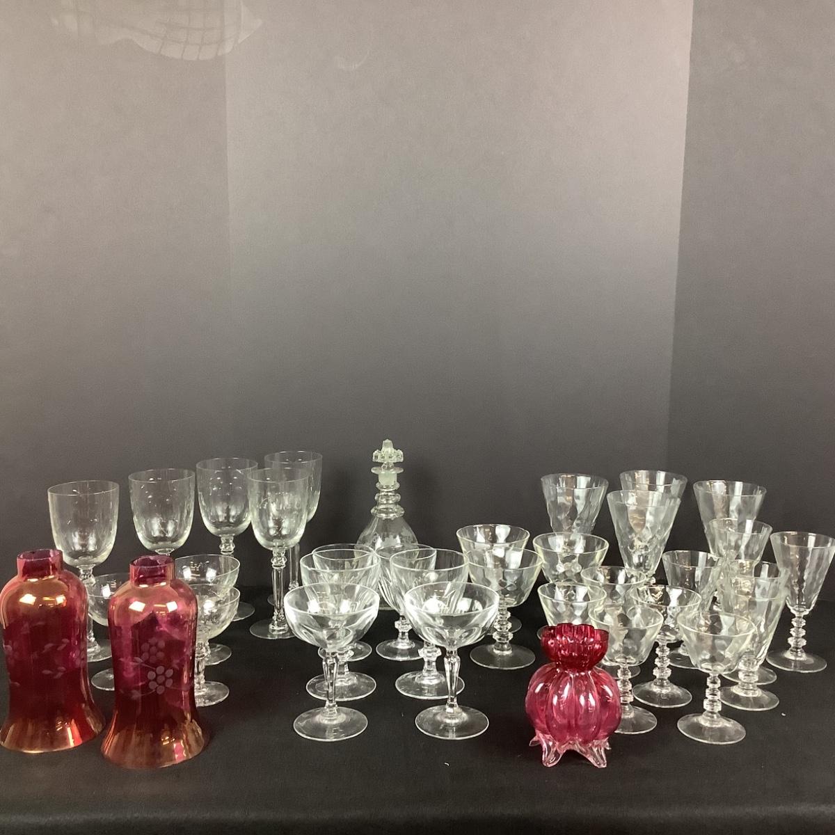31 pcs of stemware various patterns, and par of cranberry globes measuring 7.25' high with 1.5" round diameter