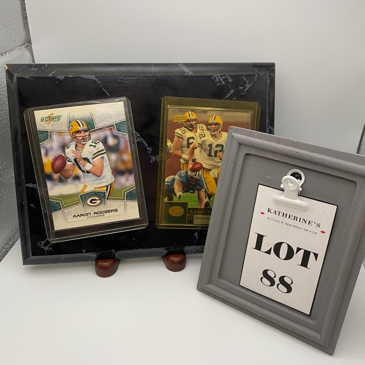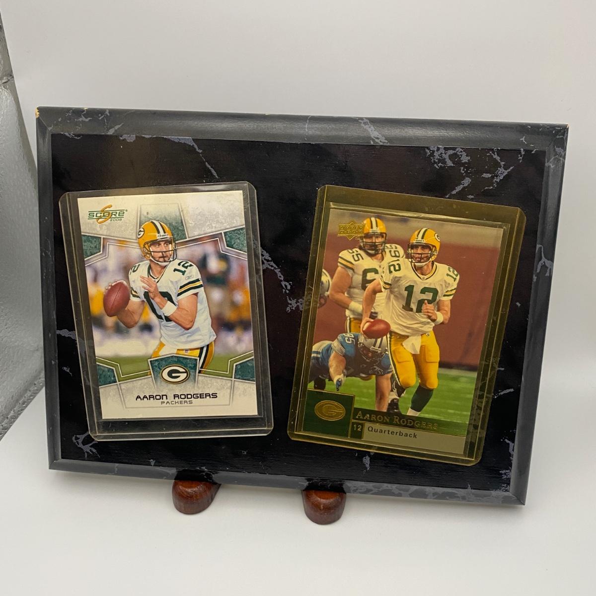 Aaron Rodgers wood plaque and double cards. Please see photos for details and condition. ::: Shipping is available on this lot. If you require shipping you must let us know at the close of the auction. We will coordinate with you after the item has been won. Shipping fees will include insurance up to or exceeding the value of all items being mailed. If you have any questions regarding this lot please contact the auctioneer either via this website, by direct email or by phone. PICK UP TIMES and other important information can be found in the TERMS and DESCRIPTION of the auction. Please take a look for pertinent information. Thanks!