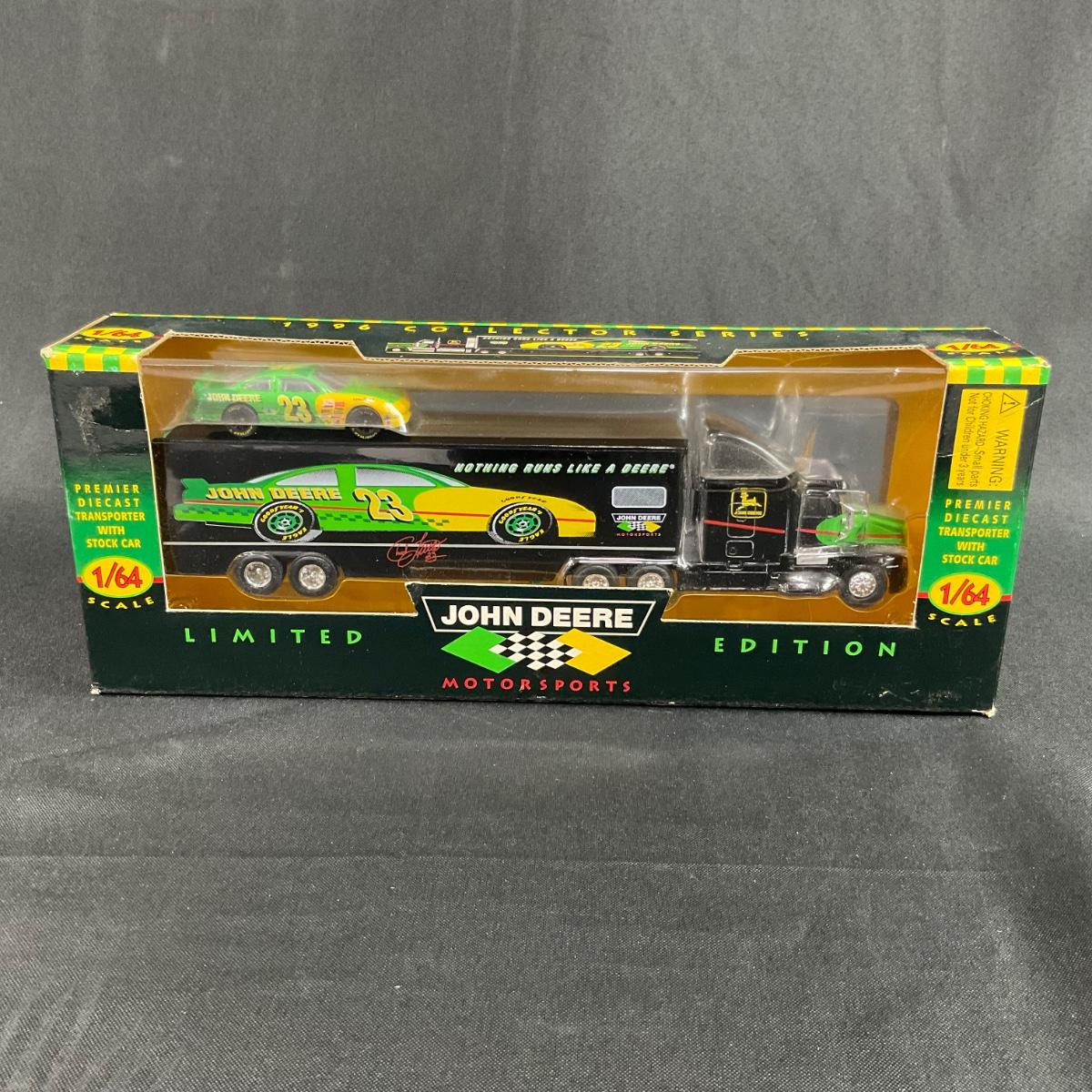 -88- JOHN DEERE | 1/64 Scale 1996 Transporter With Stock Car | New In Box