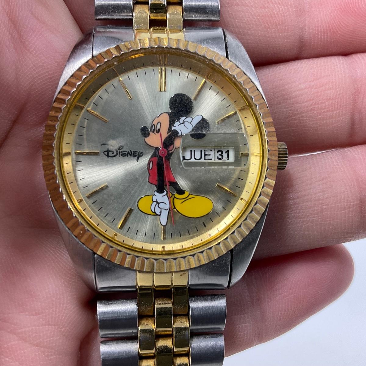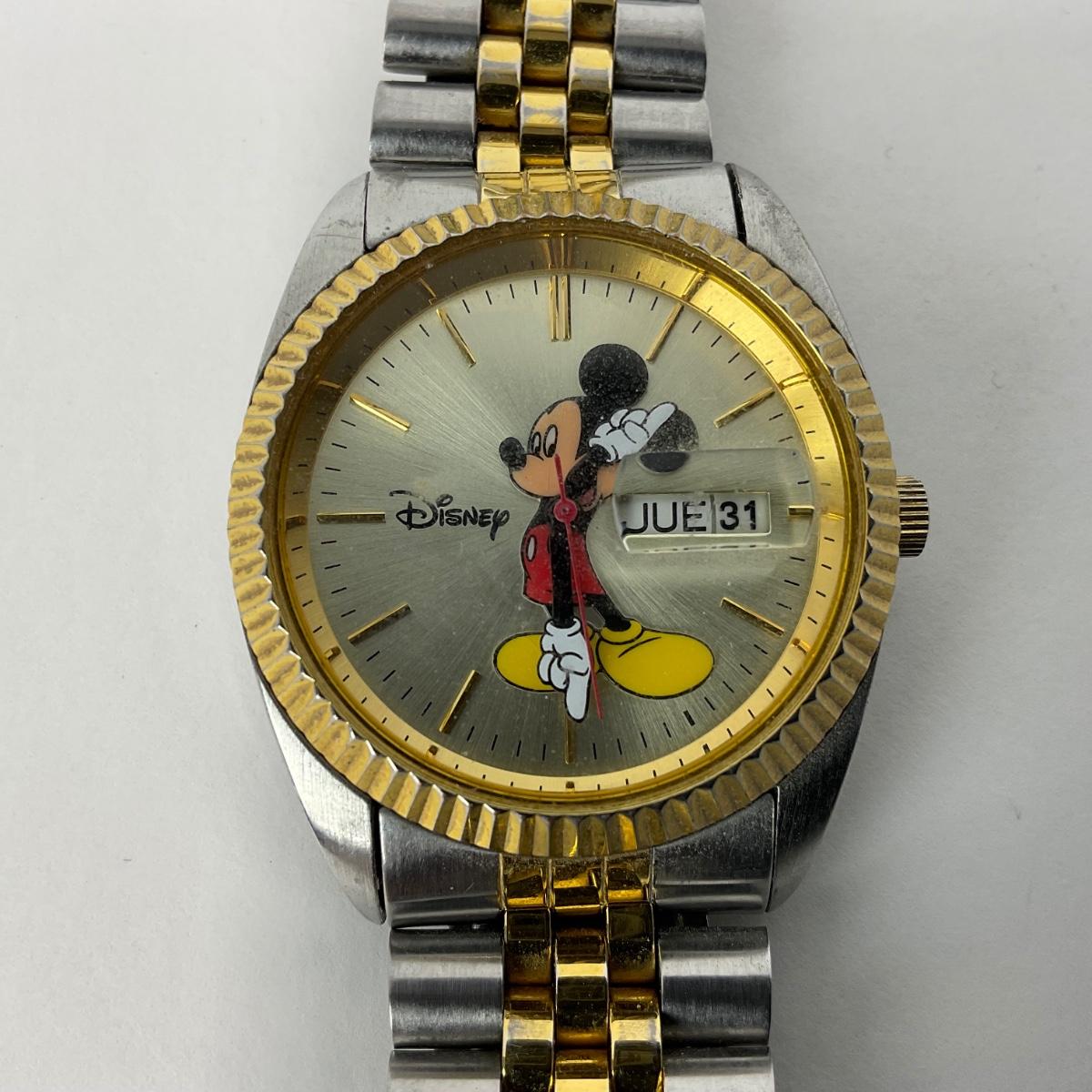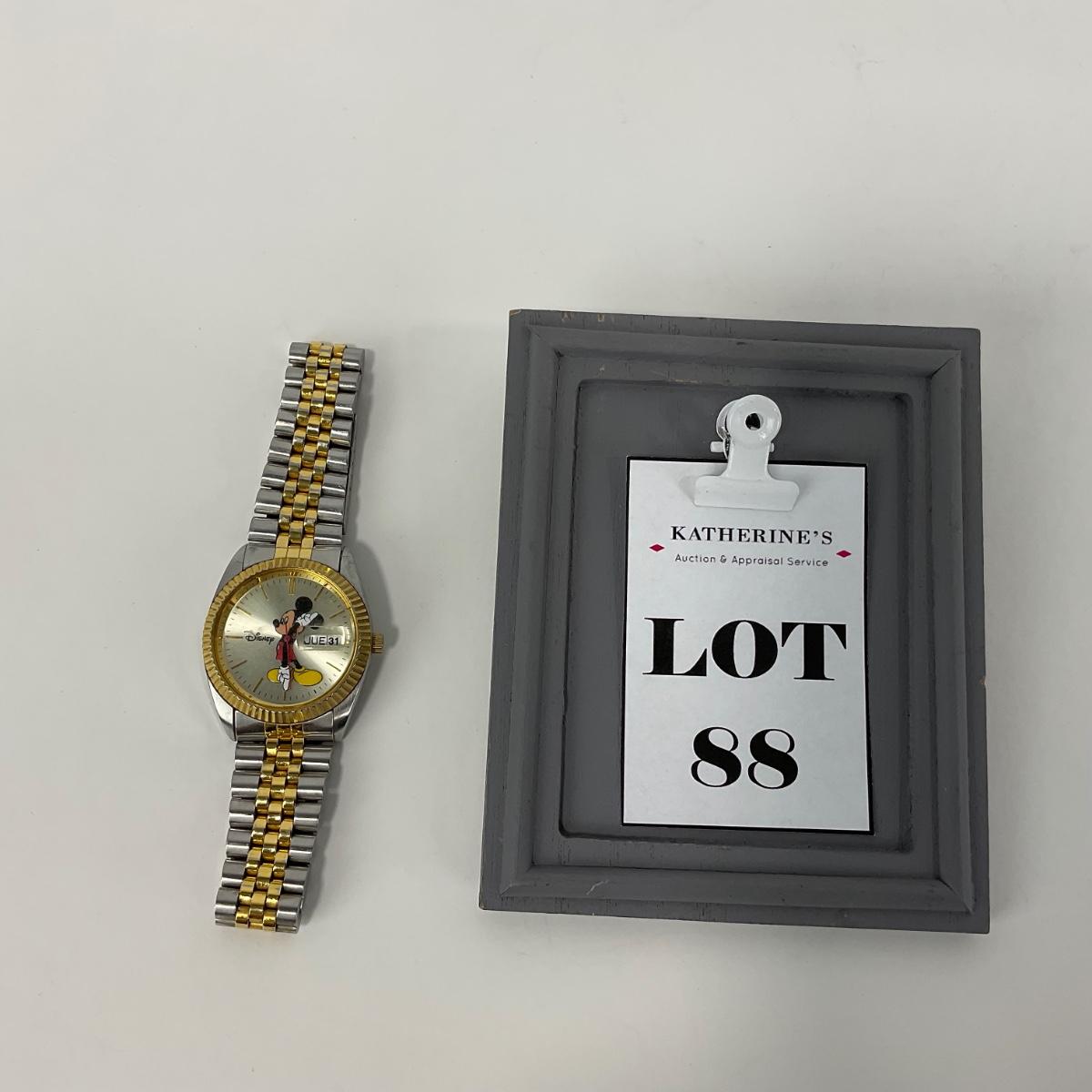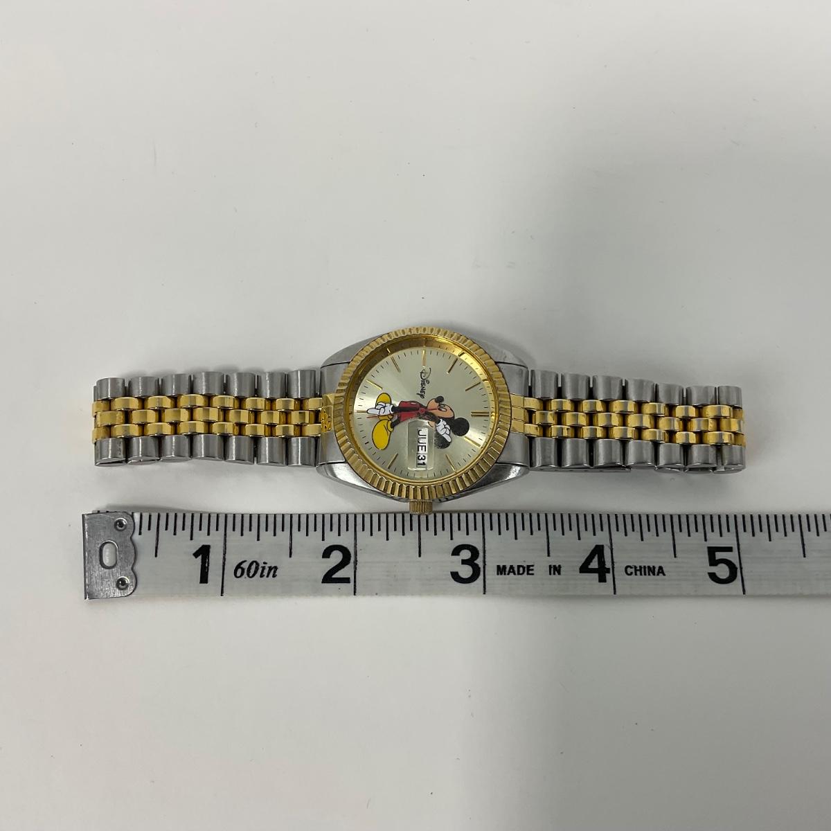 One Disney Mickey Mouse stainless and gold men’s watch. In well loved worn condition. Believed to be in working condition however untested. (May need a new battery). Please see photos for details and condition. Any condition statement is given as a courtesy to a client, is an opinion, and should not be treated as a statement of fact. Reference to condition written, oral or within a condition report shall not be regarded as a full account of condition and may not include all defects, alterations, or restorations. Absence of a condition report does not imply a lot is flawless or lacking imperfections or damage. Katherine’s Auction & Appraisal Service shall have no responsibility for any error or omission. Returns shall not be accepted on the basis of condition. ::: Shipping is available on this lot. If you require shipping you must let us know at the close of the auction. We will coordinate with you after the item has been won. Shipping fees will include insurance up to or exceeding the value of all items being mailed. If you have any questions regarding this lot please contact the auctioneer either via this website, by direct email or by phone. PICK UP TIMES and other important information can be found in the TERMS and DESCRIPTION of the auction. Please take a look for pertinent information. Thanks!