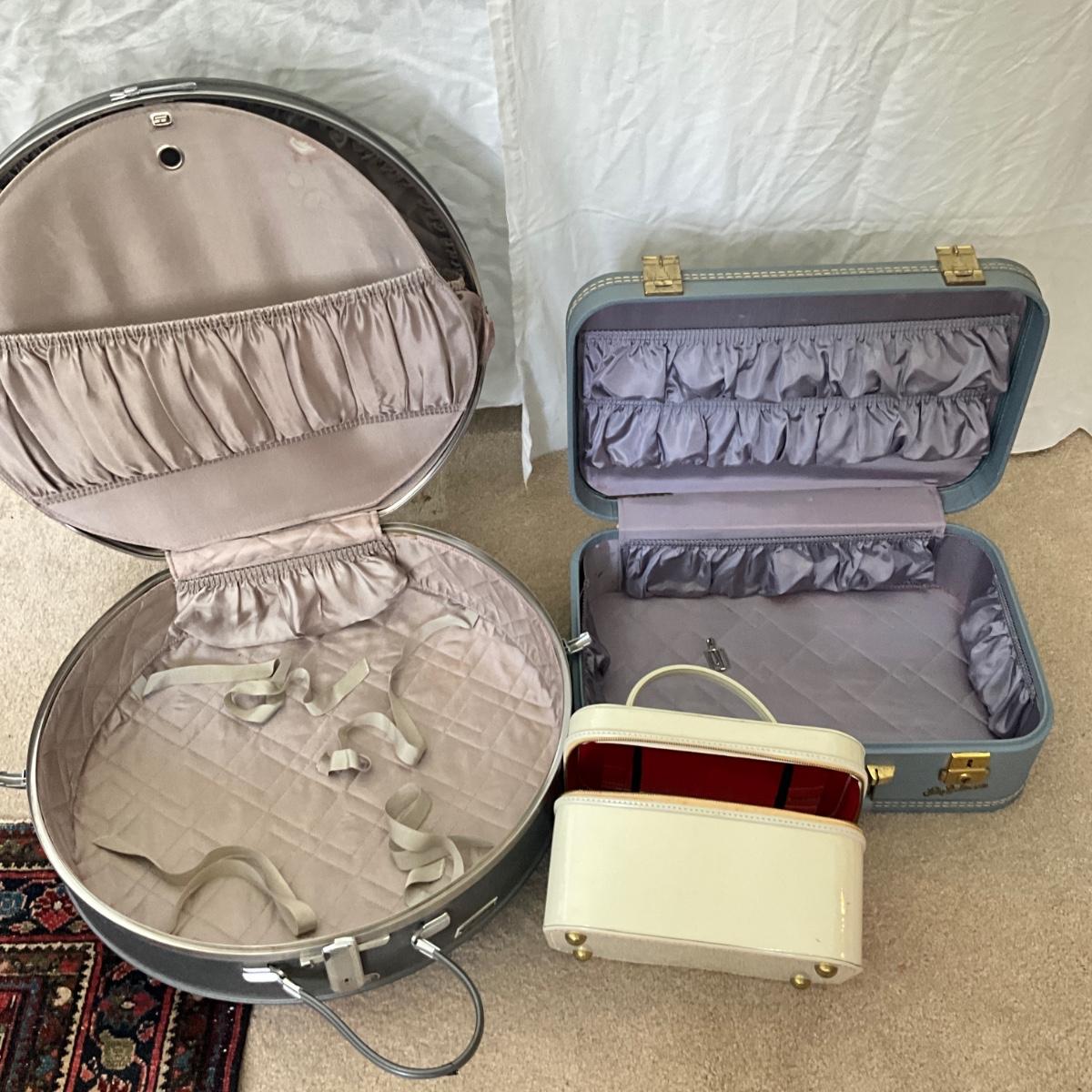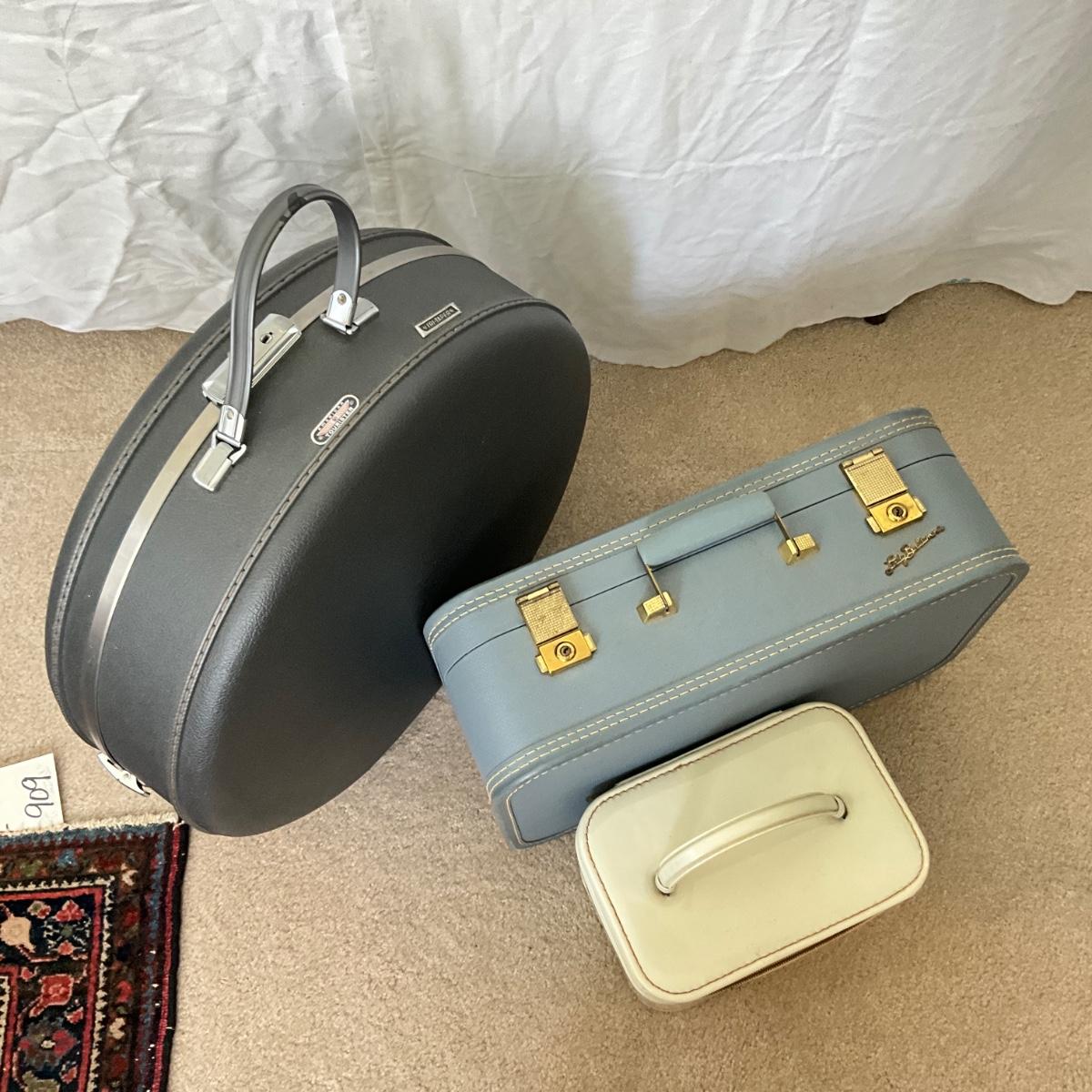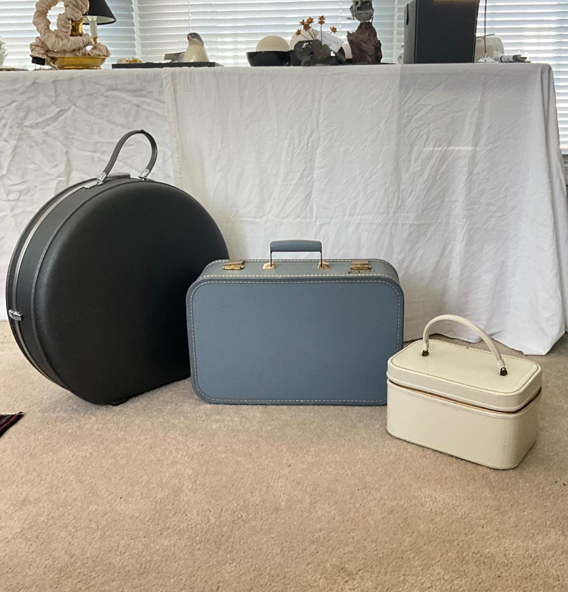 Comes with three suitcases, a Tri Taper round American tourist suitcase, a lady Baltimore suitcase, and one small white suitcase.