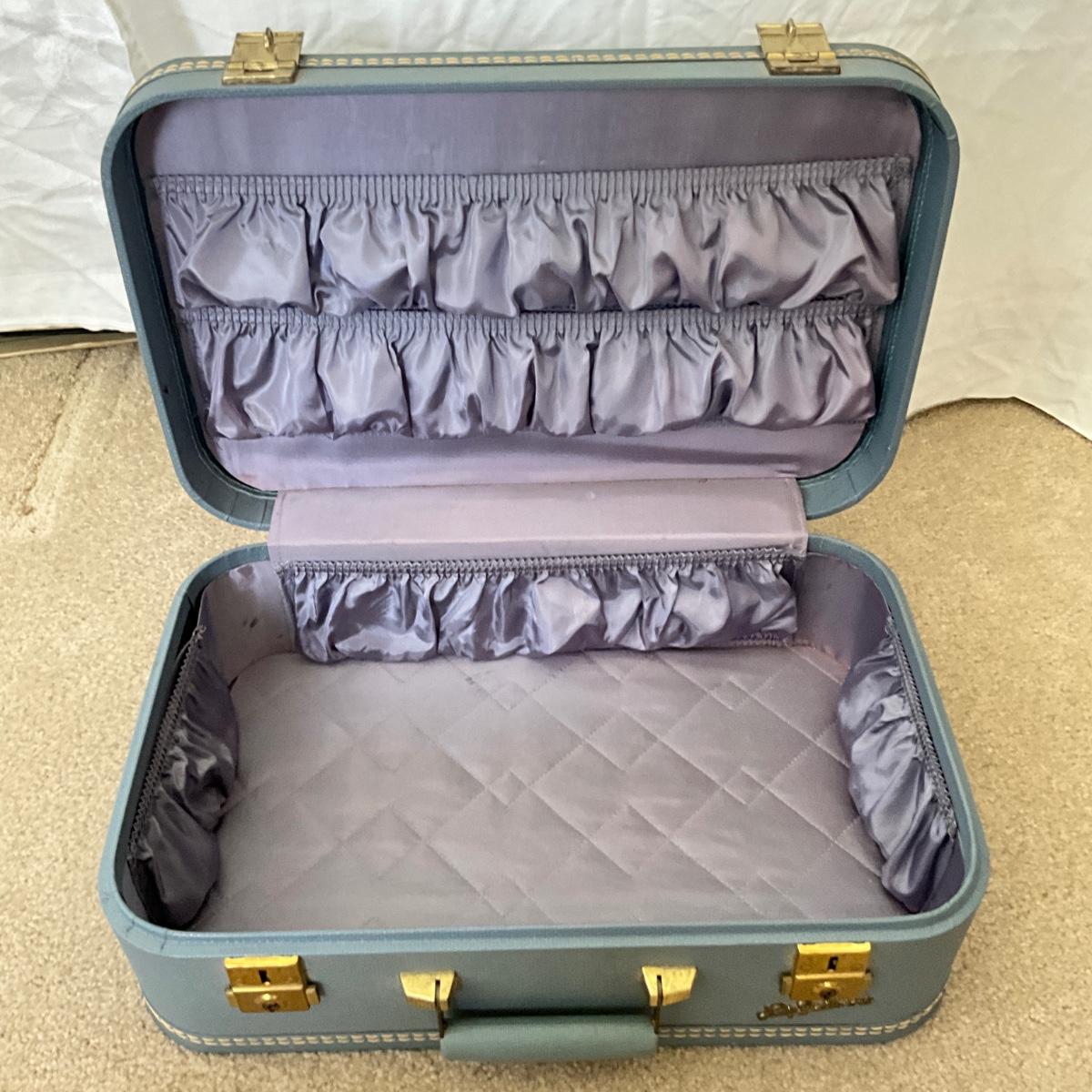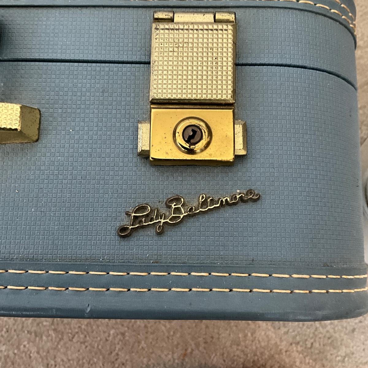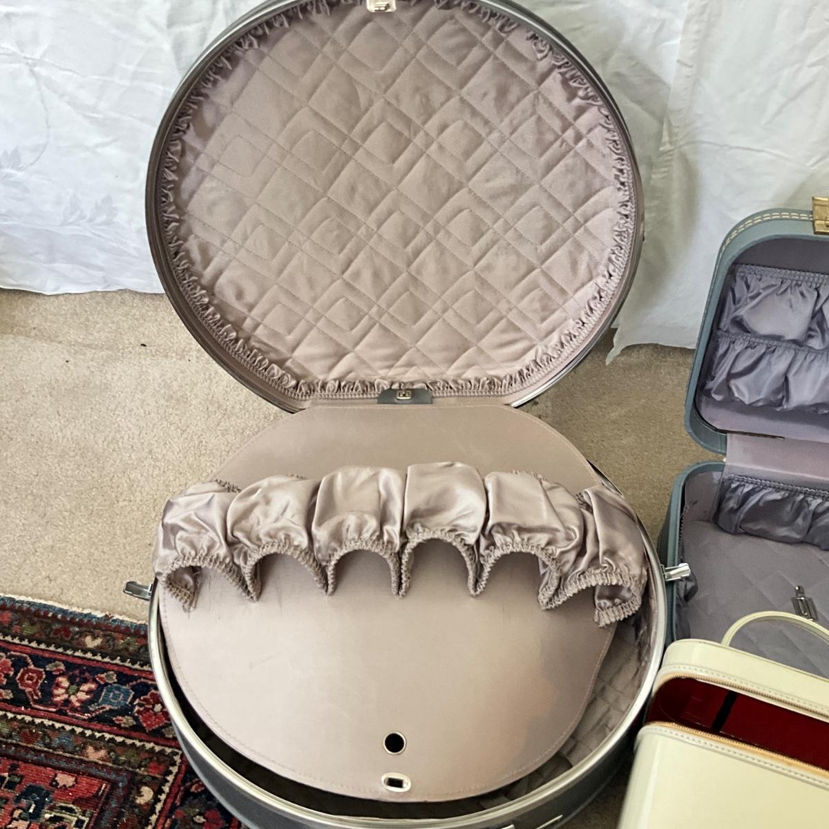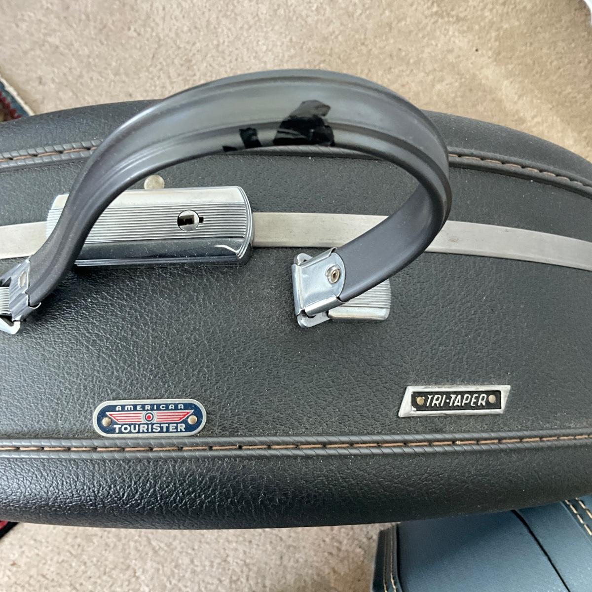 Comes with three suitcases, a Tri Taper round American tourist suitcase, a lady Baltimore suitcase, and one small white suitcase.