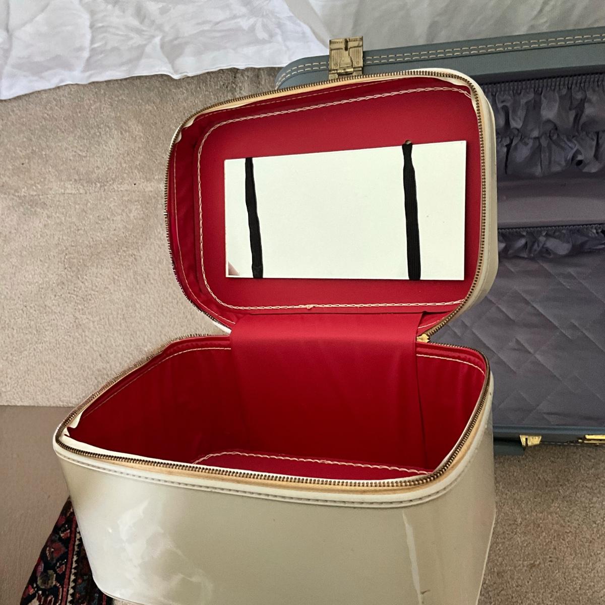 white suitcase is 10.5" in width, 7" in depth, 6" in height