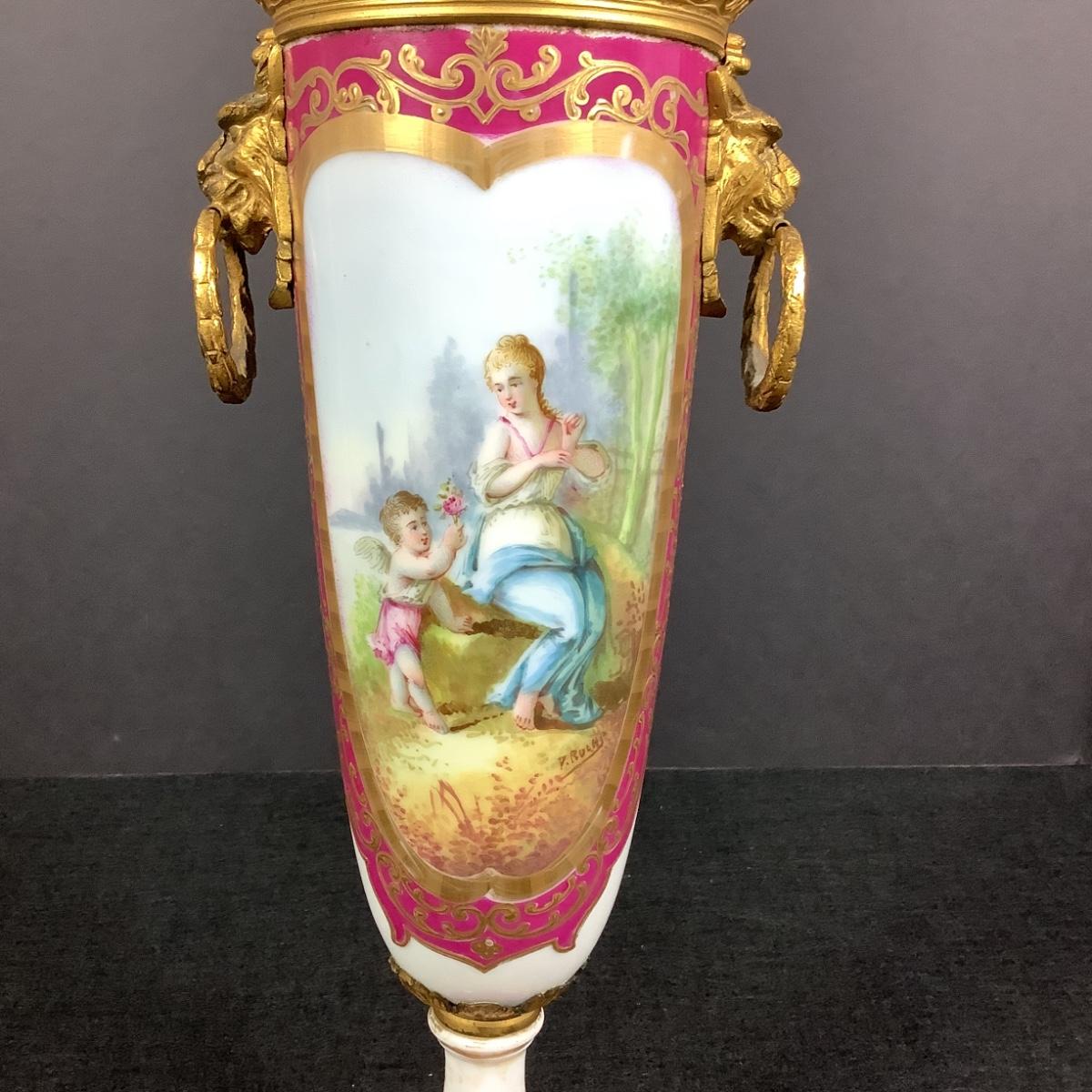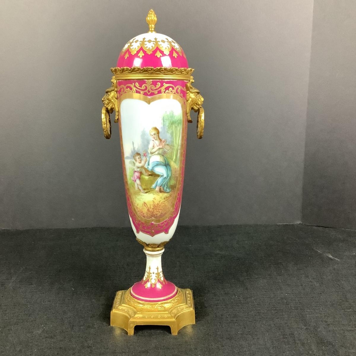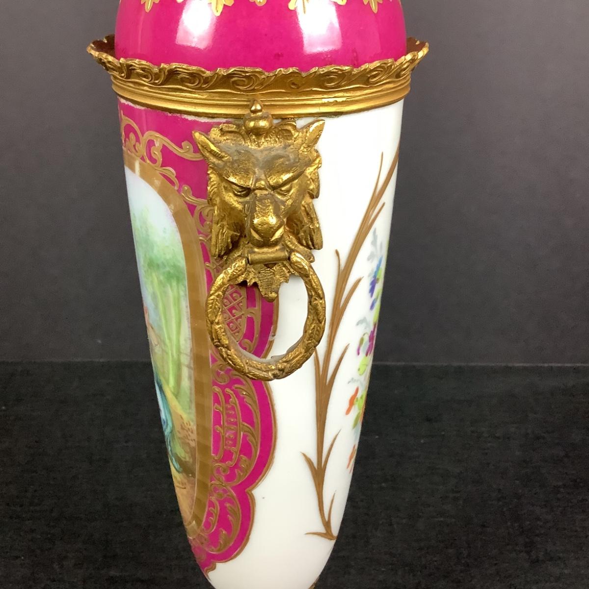 881 Antique French Serves Bronze Mounted Handpainted Porcelain Urn