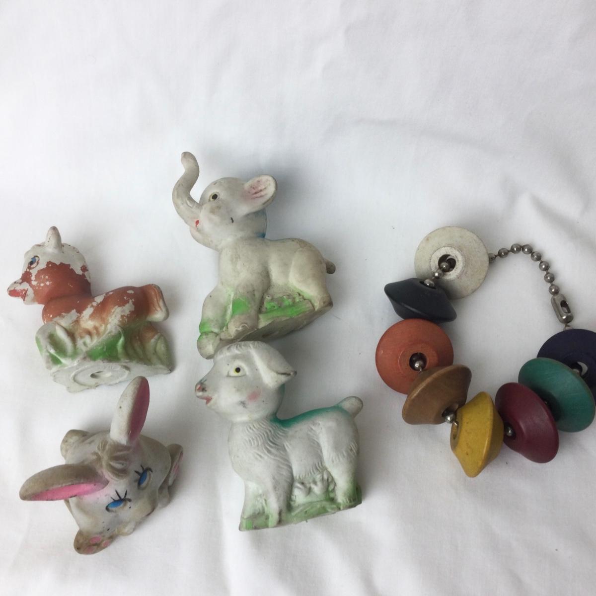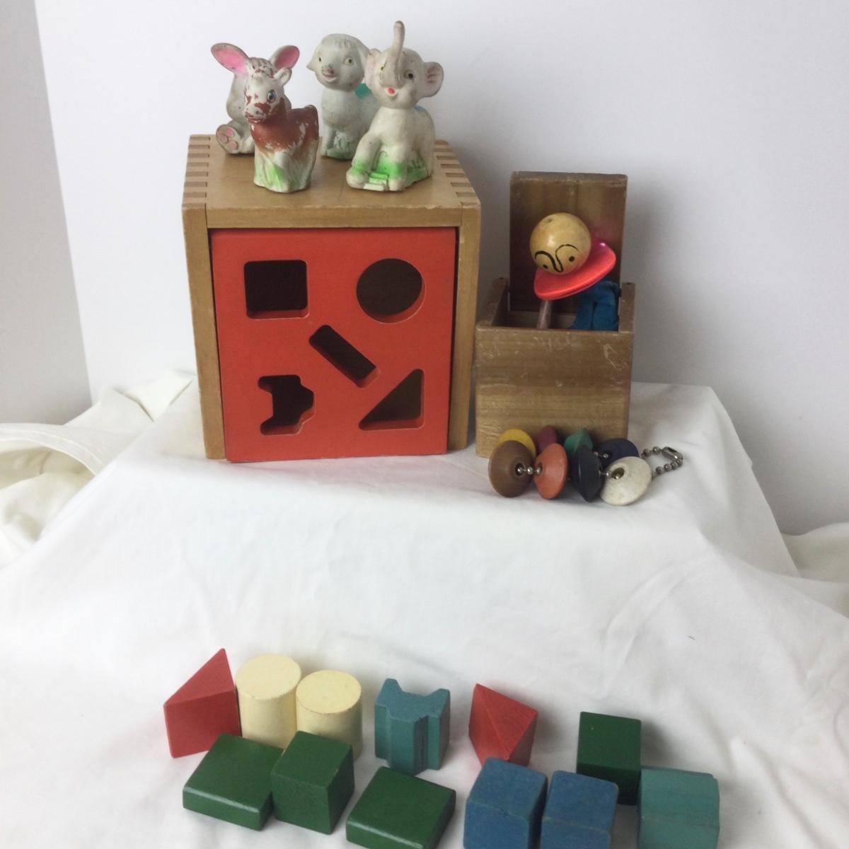 Wooden shape sort with shapes, primitive jack in the box, color bead texture toy and 4 early plastic toys.