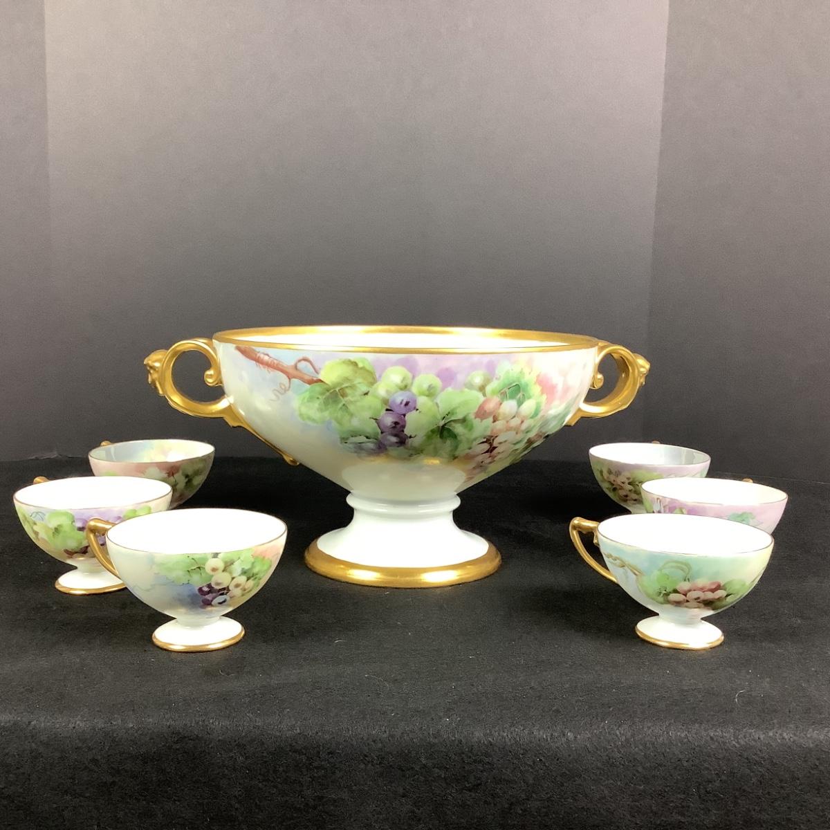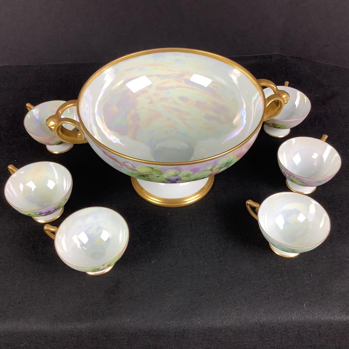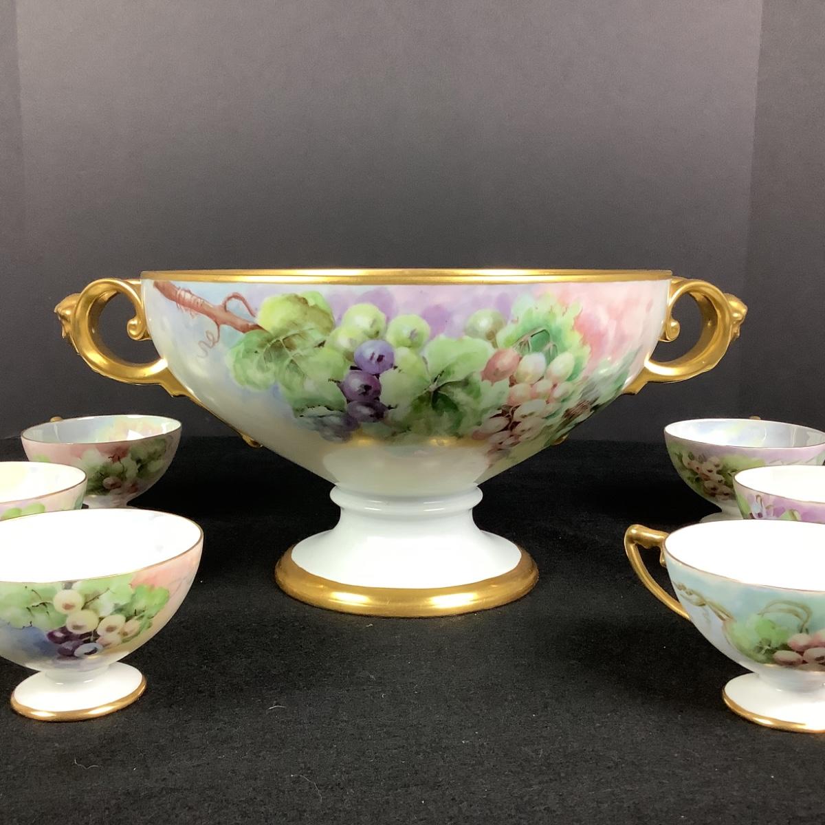 883 Antique Handpainted Signed Rosenthal Bavarian Handled Punch Bowl with cups
