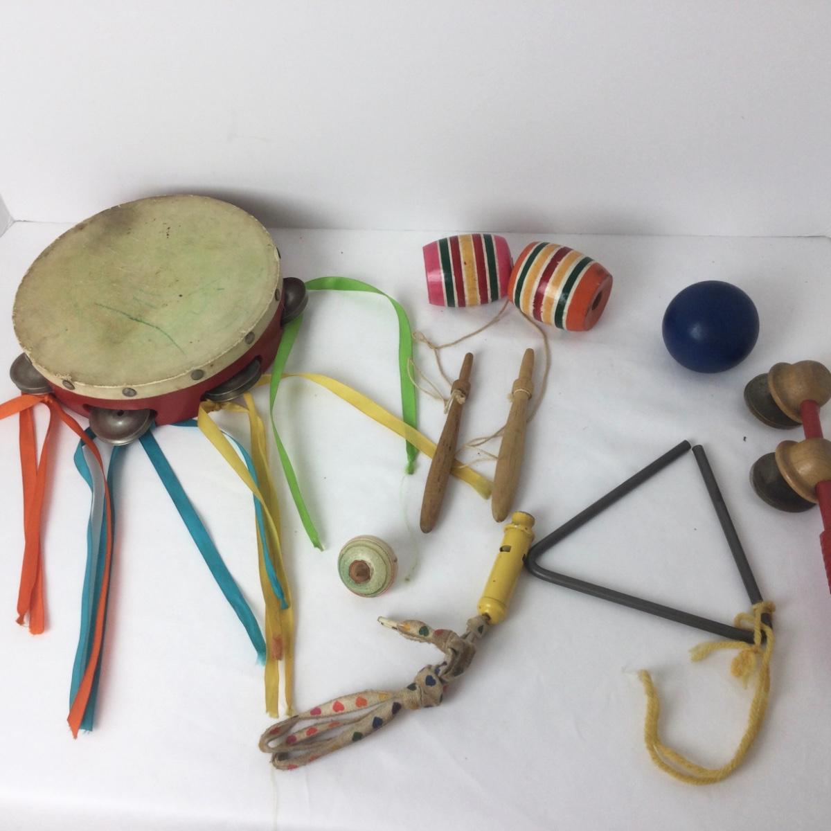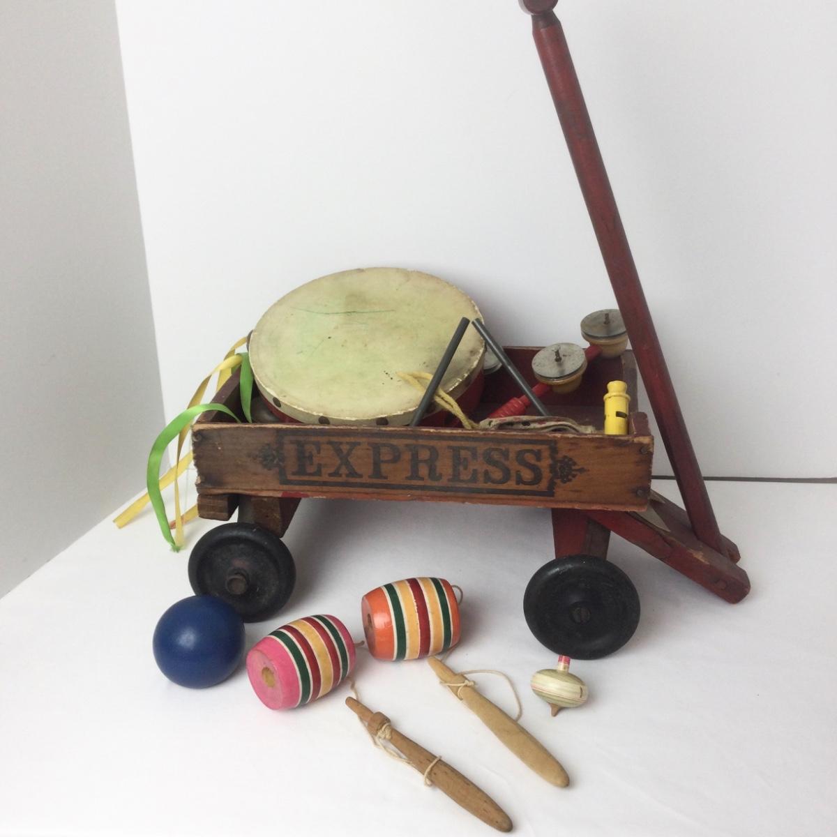 Wagon is solid wood with damage-the front 2 wheels are no longer attached to the wagon, there are assorted children’s vintage musical instruments and toys.