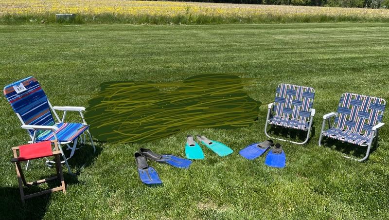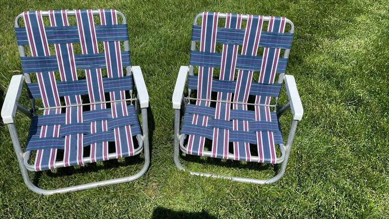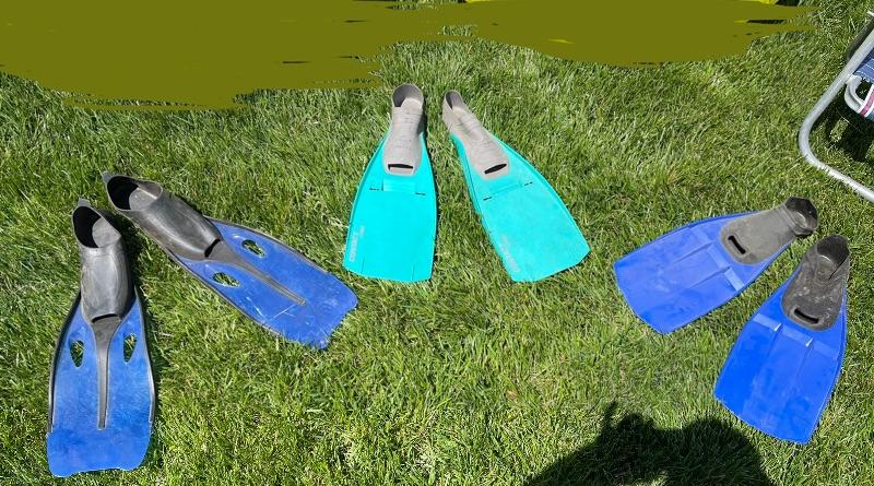 Qty (4) beach folding chairs, qty (3) pairs of swimming flippers- (1) pair size 10. (2) pairs size 8-9.