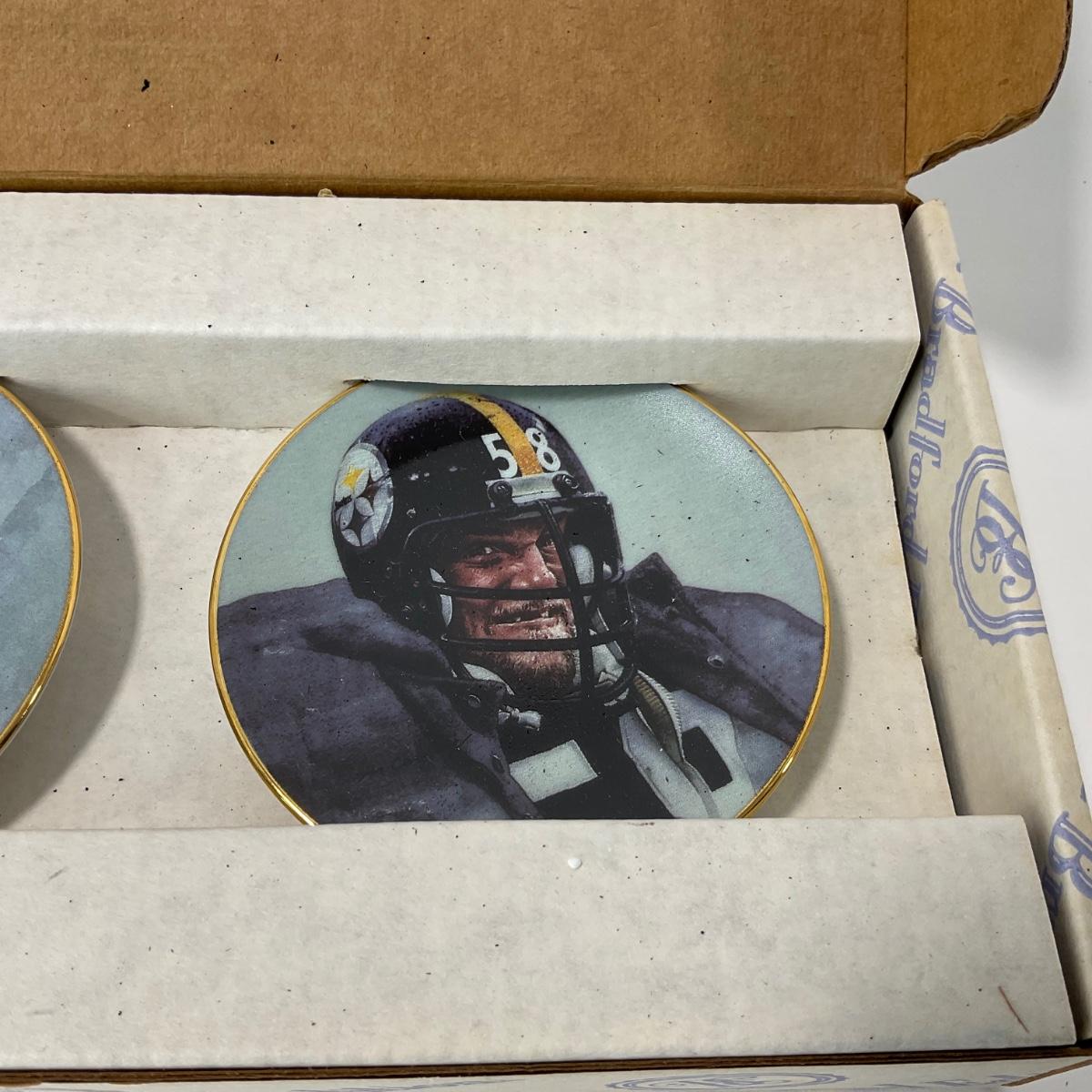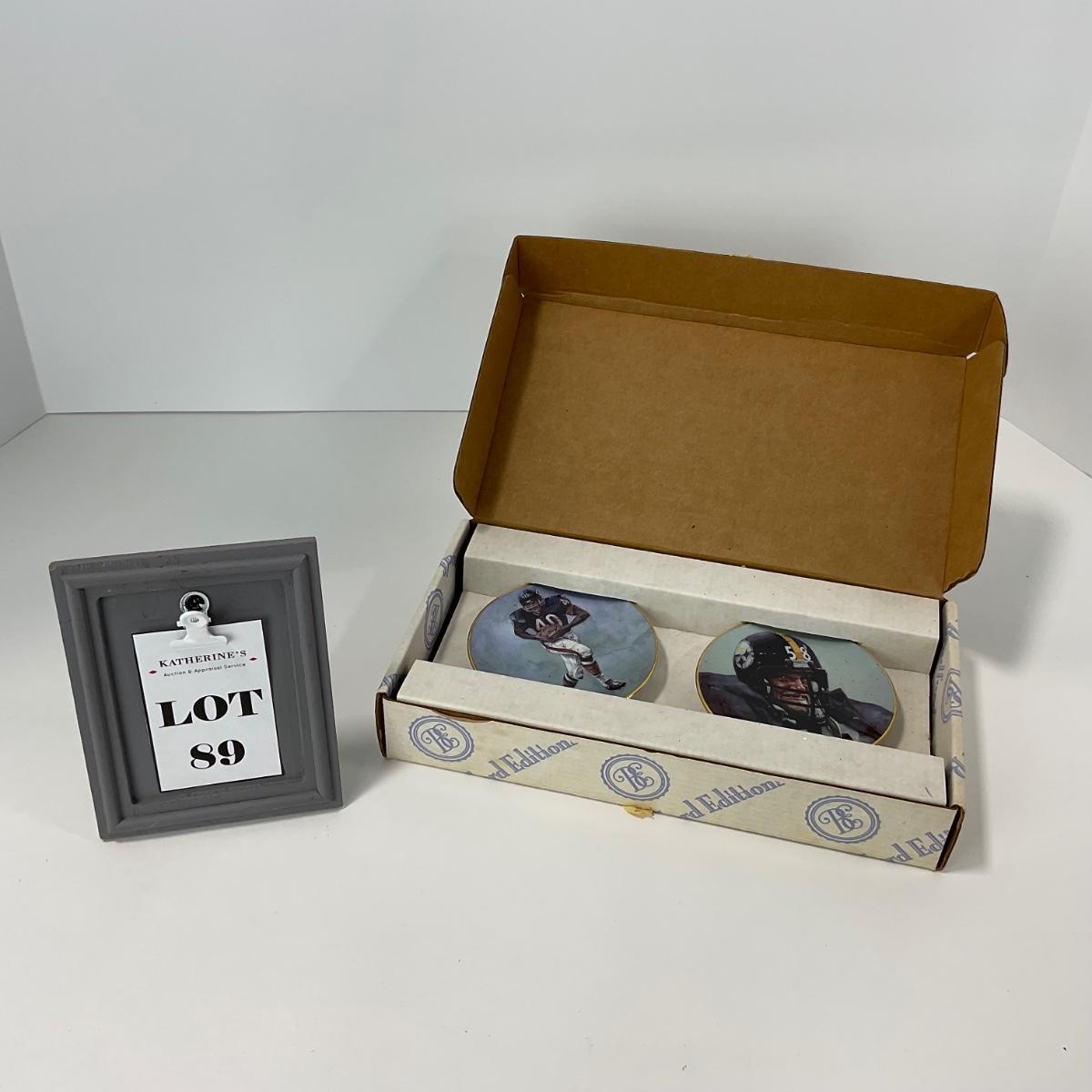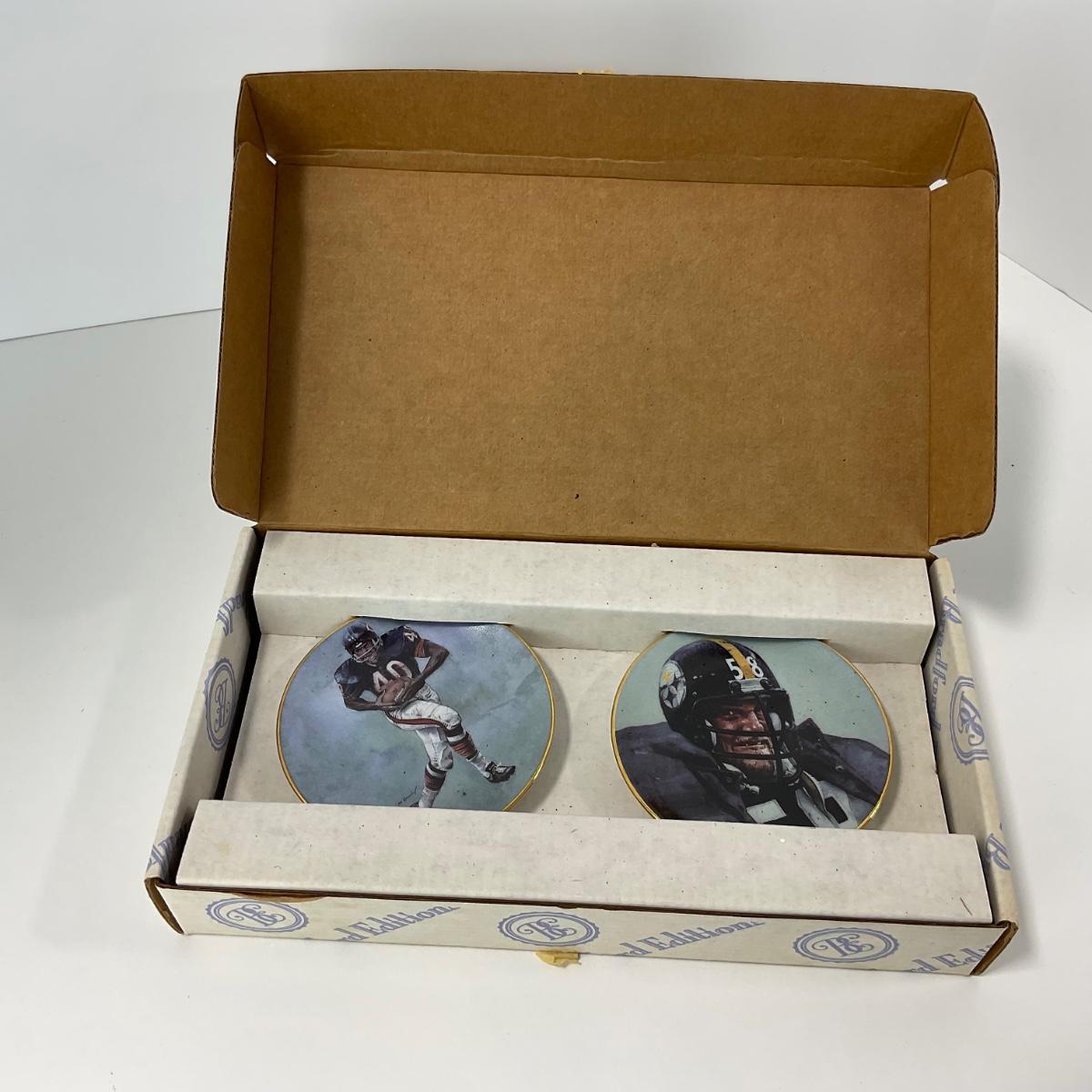 Bradford Exchange NFL 75th Anniversary All Time Team Plates 1995 with players Gale Sayers and Jack Lambert. No certificate, in box. Please see photos for details and condition. ::: Shipping is available on this lot. If you require shipping you must let us know at the close of the auction. We will coordinate with you after the item has been won. Shipping fees will include insurance up to or exceeding the value of all items being mailed. If you have any questions regarding this lot please contact the auctioneer either via this website, by direct email or by phone. PICK UP TIMES and other important information can be found in the TERMS and DESCRIPTION of the auction. Please take a look for pertinent information. Thanks!
