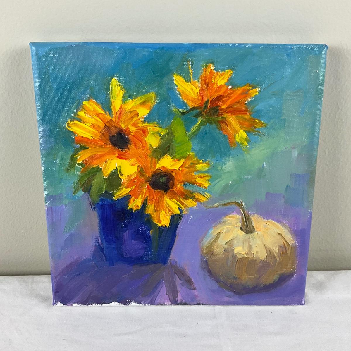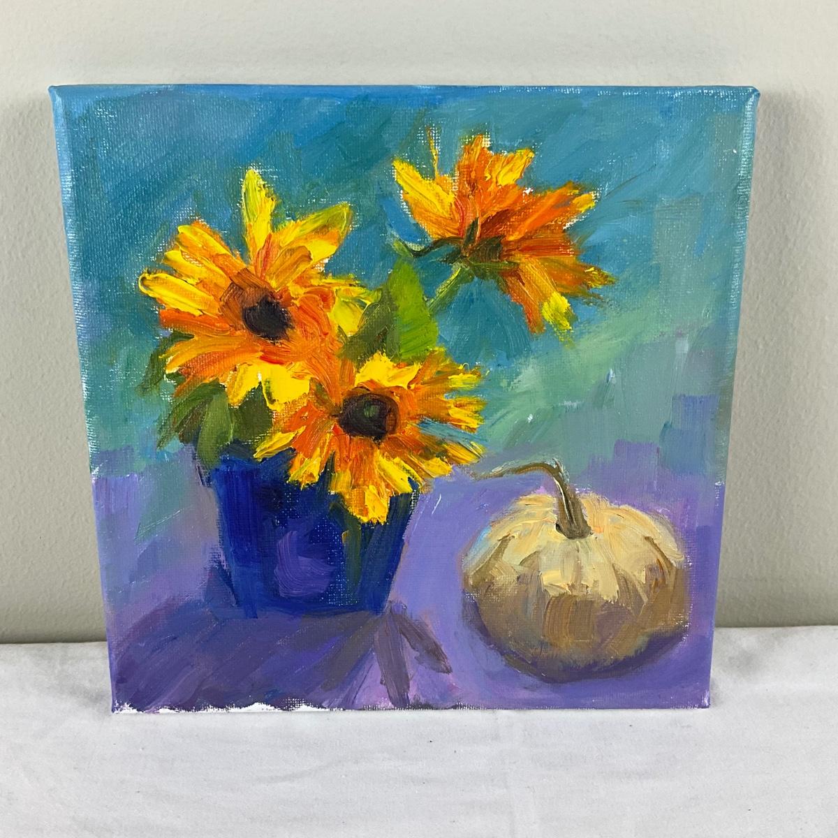 89 Original Oil painting Still Life of Pumpkin and Sunflowers by Kathie Rogers