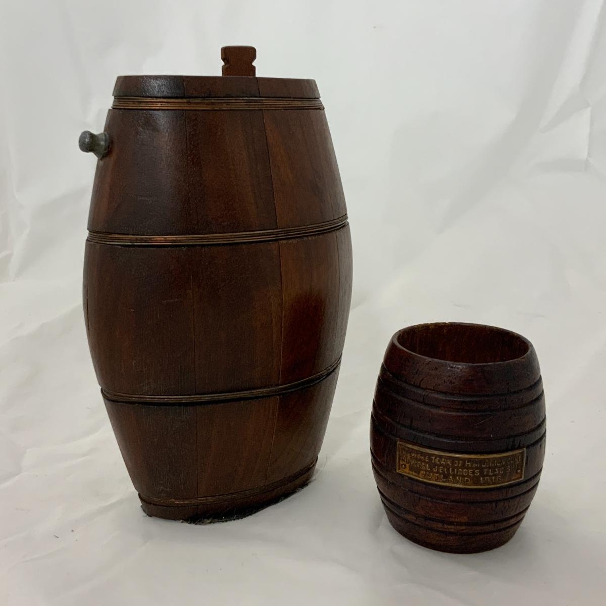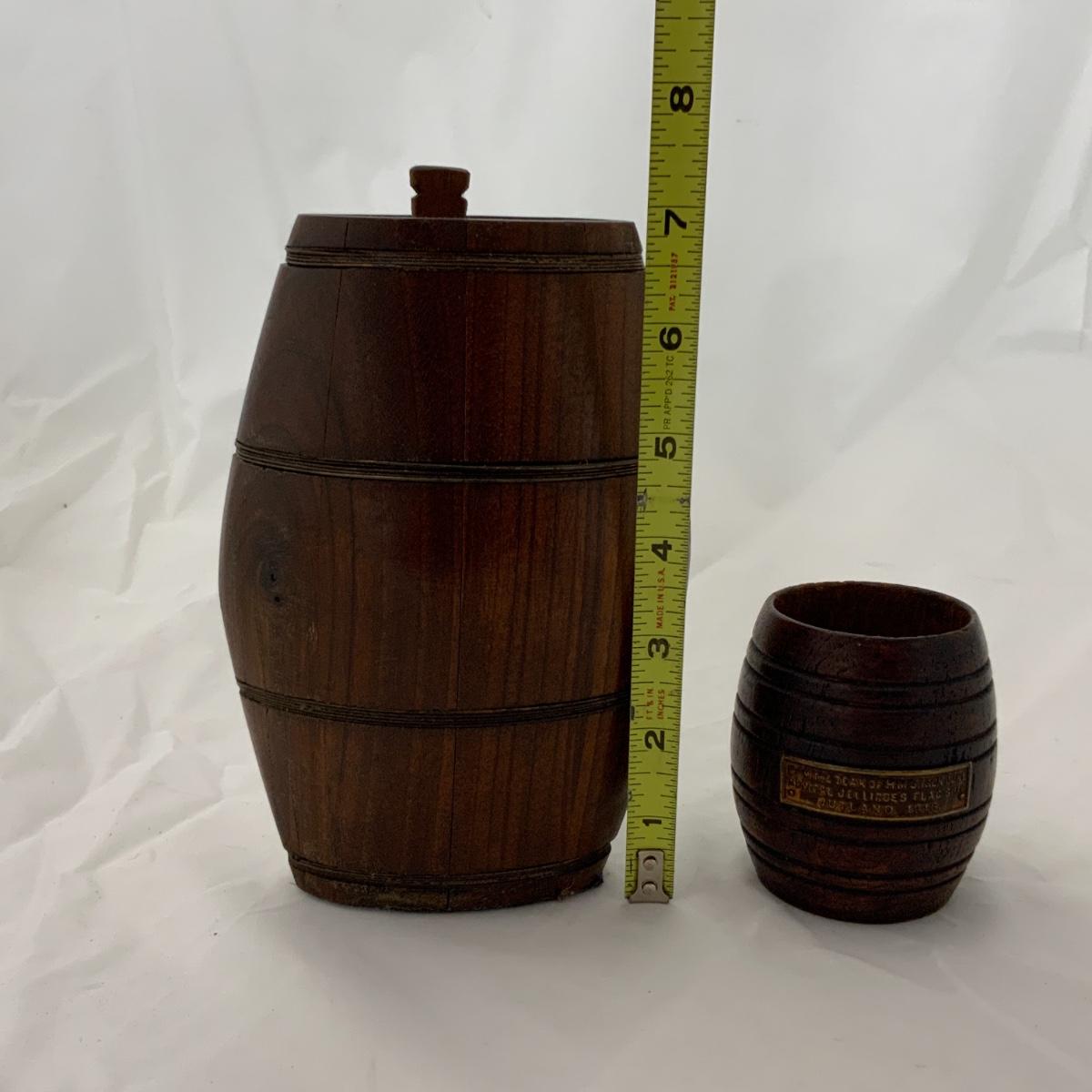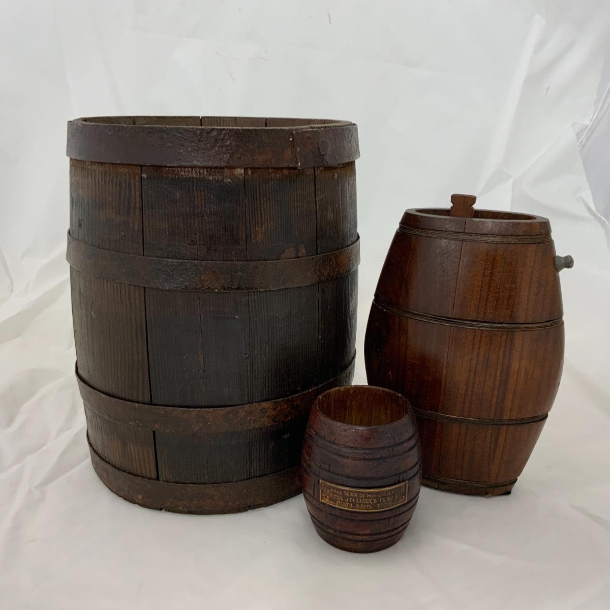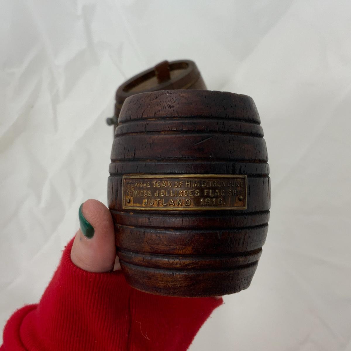 From the Estate of Peter Radovanovich: Small Wood Barrels. The smallest barrel is the size of a dice cup and has a plaque on it that says “From the Teak of the HMS Iron Duke Admiral Jellincoe’s Flag Ship Jutland 1916. Please see photos for details and condition. ::: Shipping is available on this lot. If you require shipping you must let us know at the close of the auction. We will coordinate with you after the item has been won. Shipping fees will include insurance up to or exceeding the value of all items being mailed. If you have any questions regarding this lot please contact the auctioneer either via this website, by direct email or by phone. PICK UP TIMES and other important information can be found in the TERMS and DESCRIPTION of the auction. Please take a look for pertinent information. Thanks!
