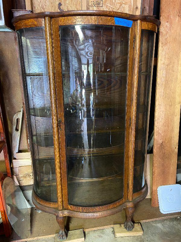 Tiger oak, claw foot, bow Front China Cabinet. *Please review all photos for condition and contents of lot.