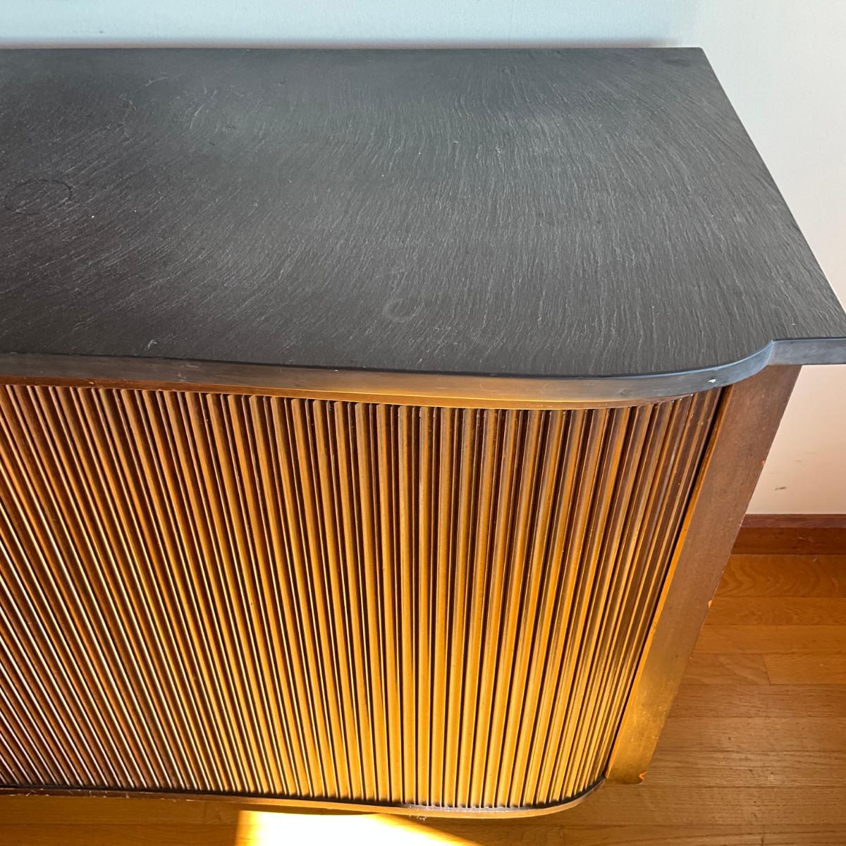 Has adjustable shelves, has damage to front right and left corner, top is solid slate