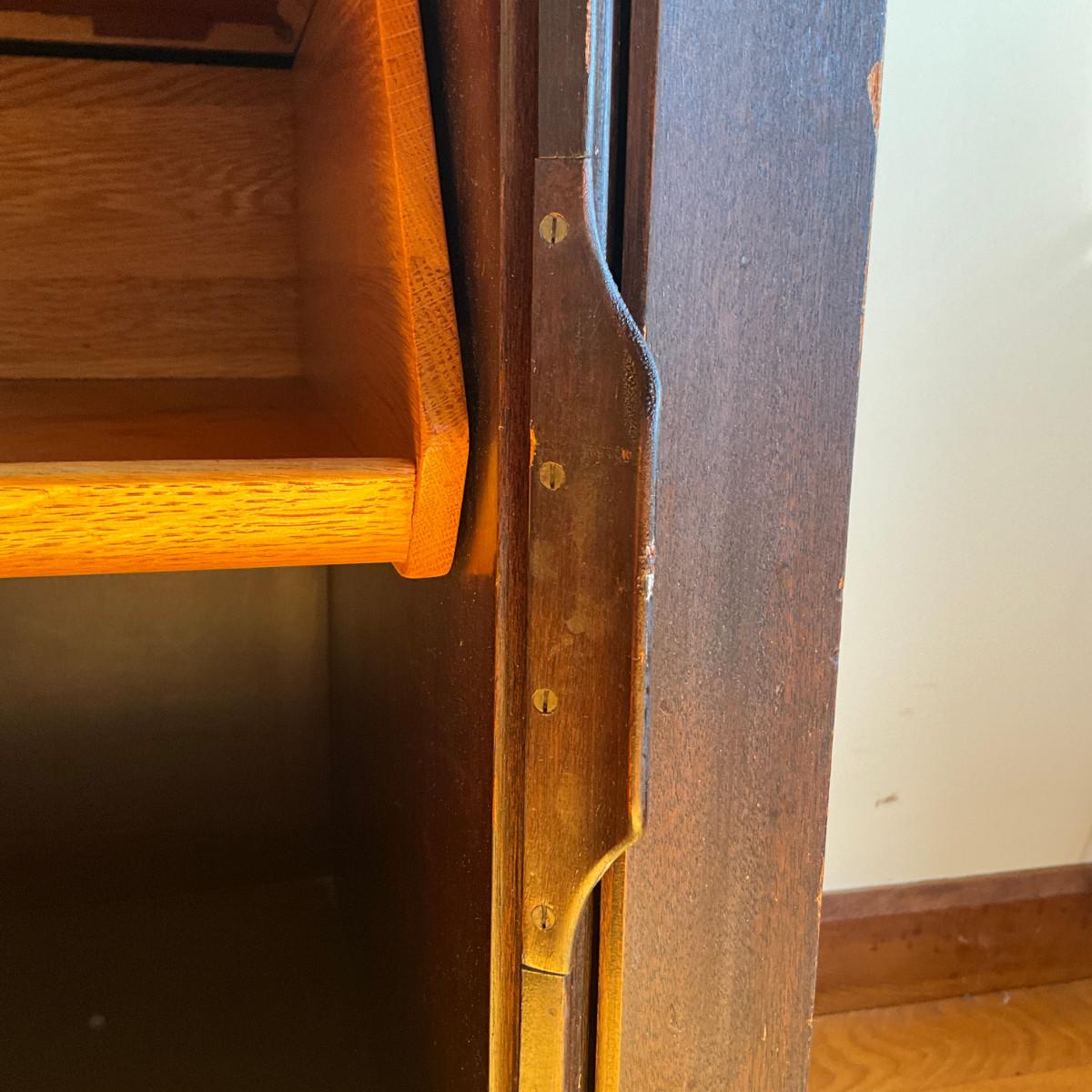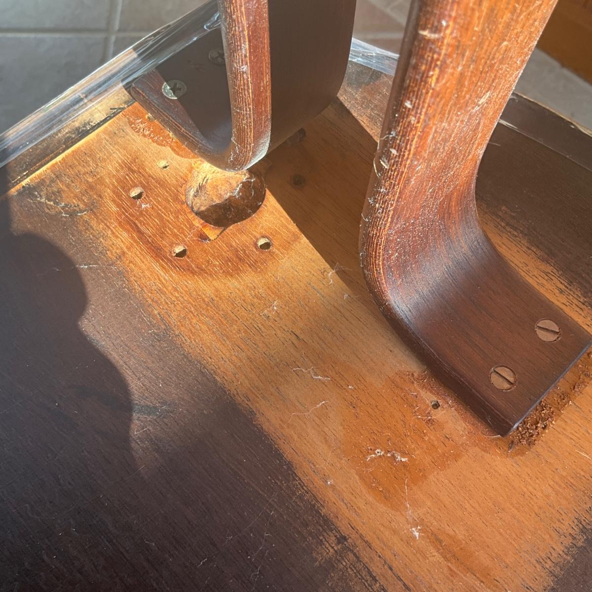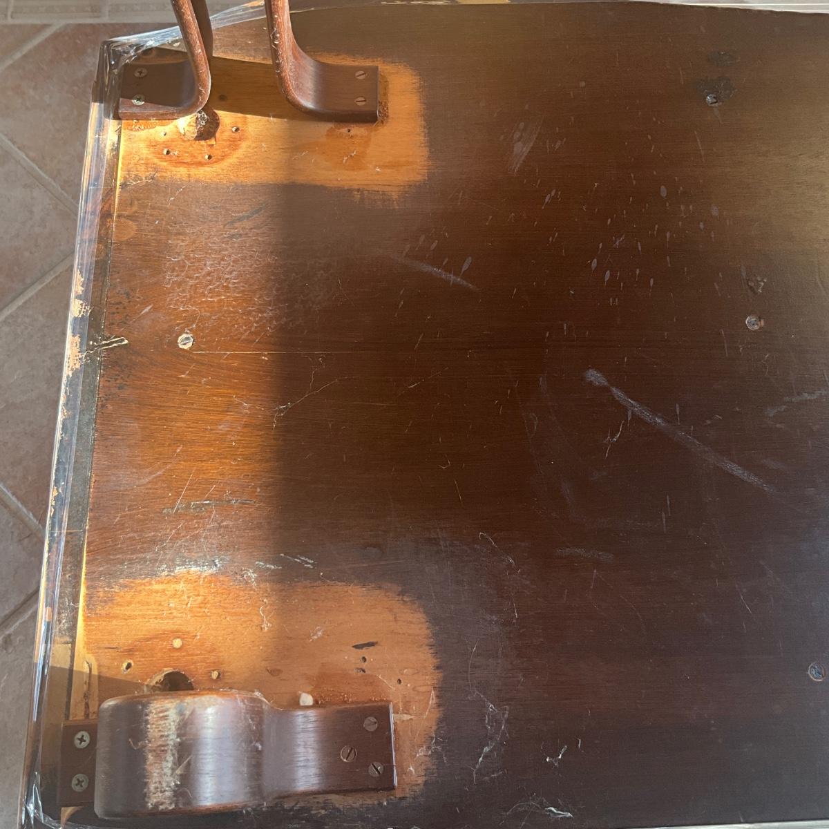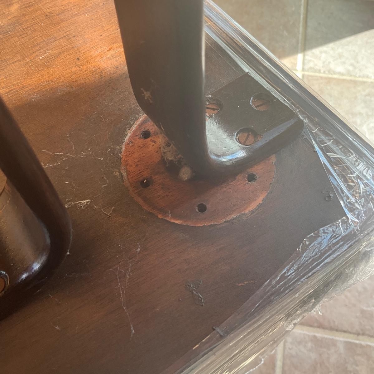Piece of veneer on the left bottom corner is coming off and it seems the feet have been replaced and are the original. Please refer to photos.