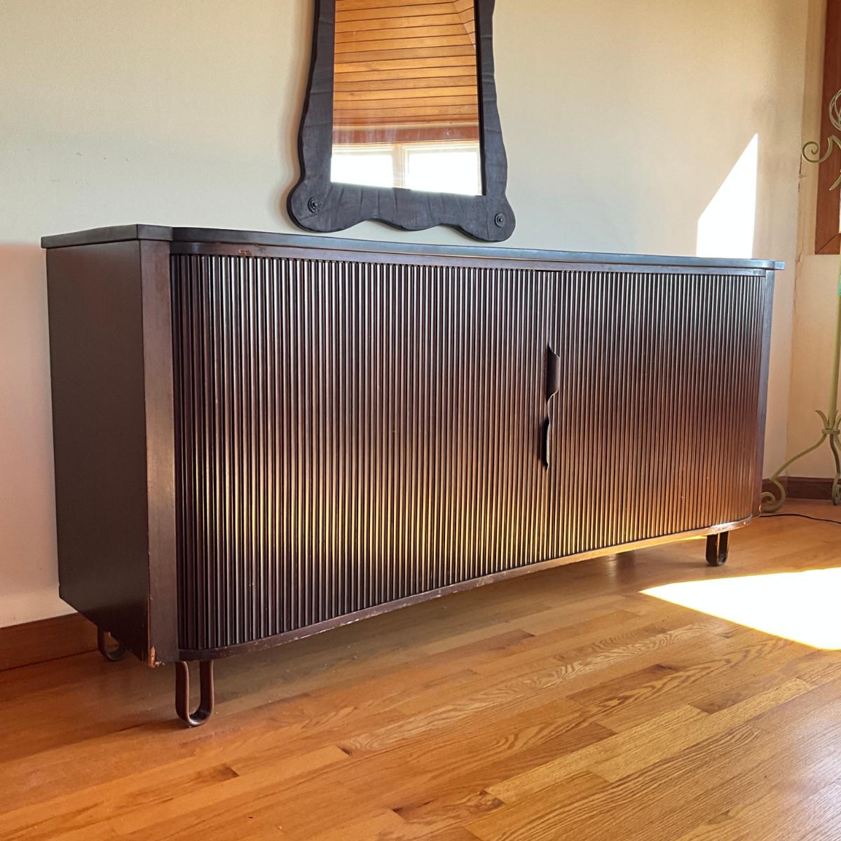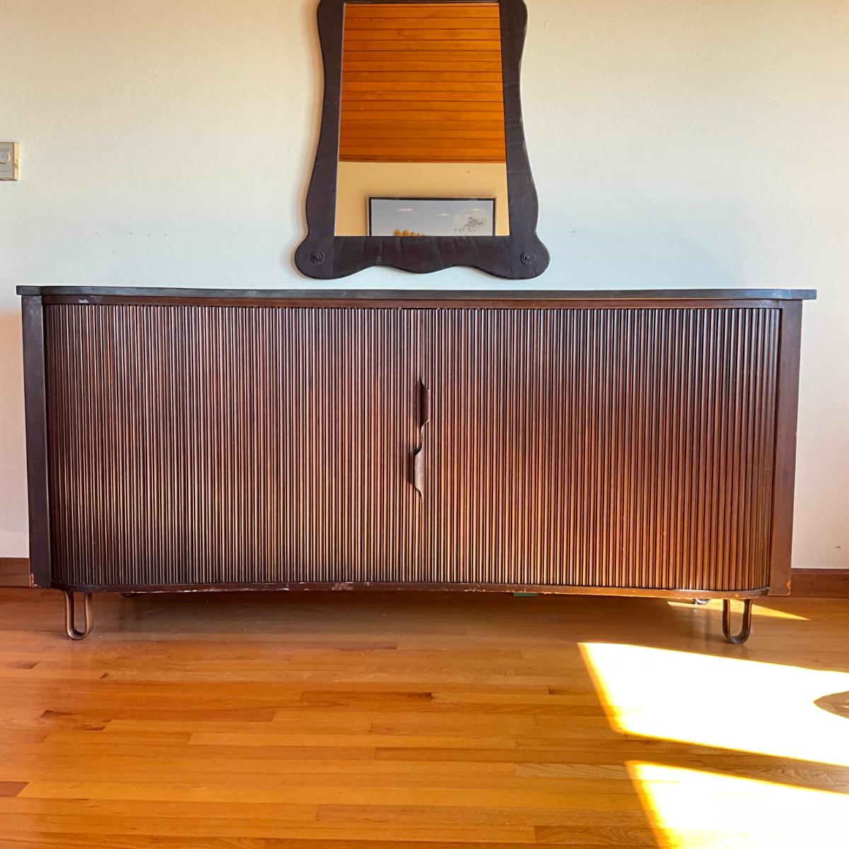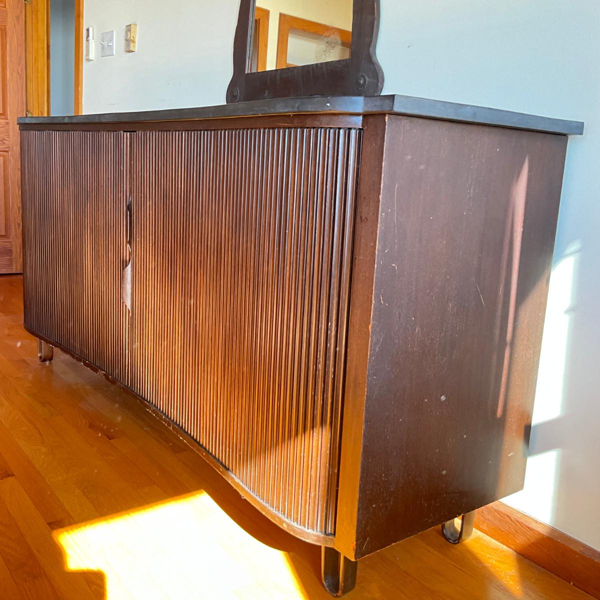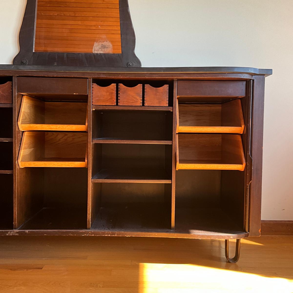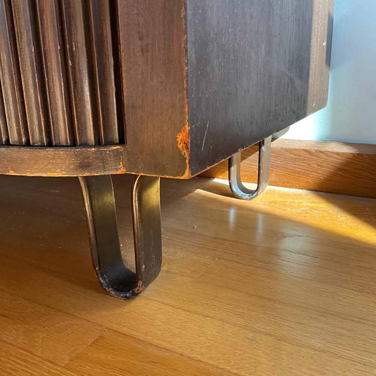 Piece of veneer on the left bottom corner is coming off and it seems the feet have been replaced and are the original. Please refer to photos.