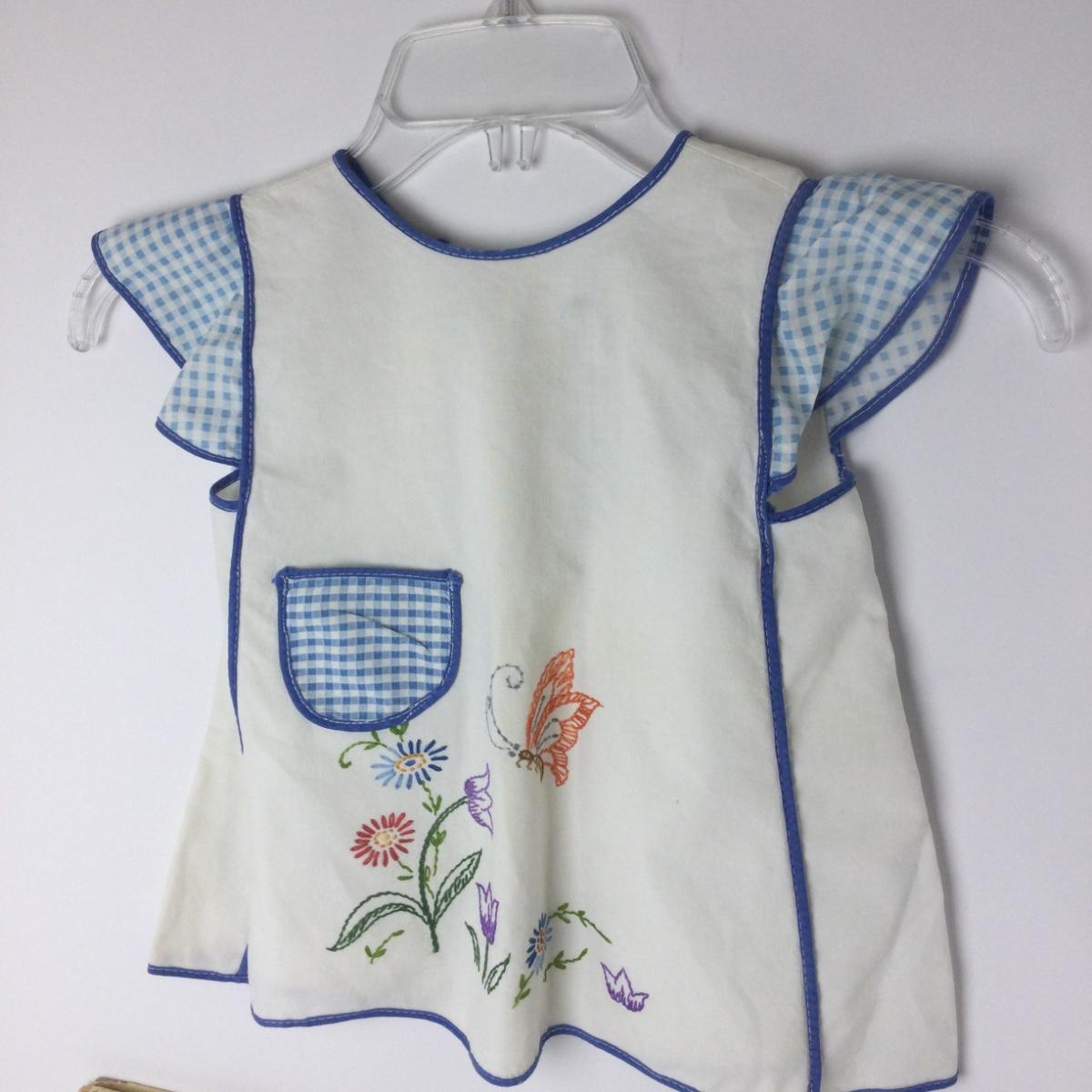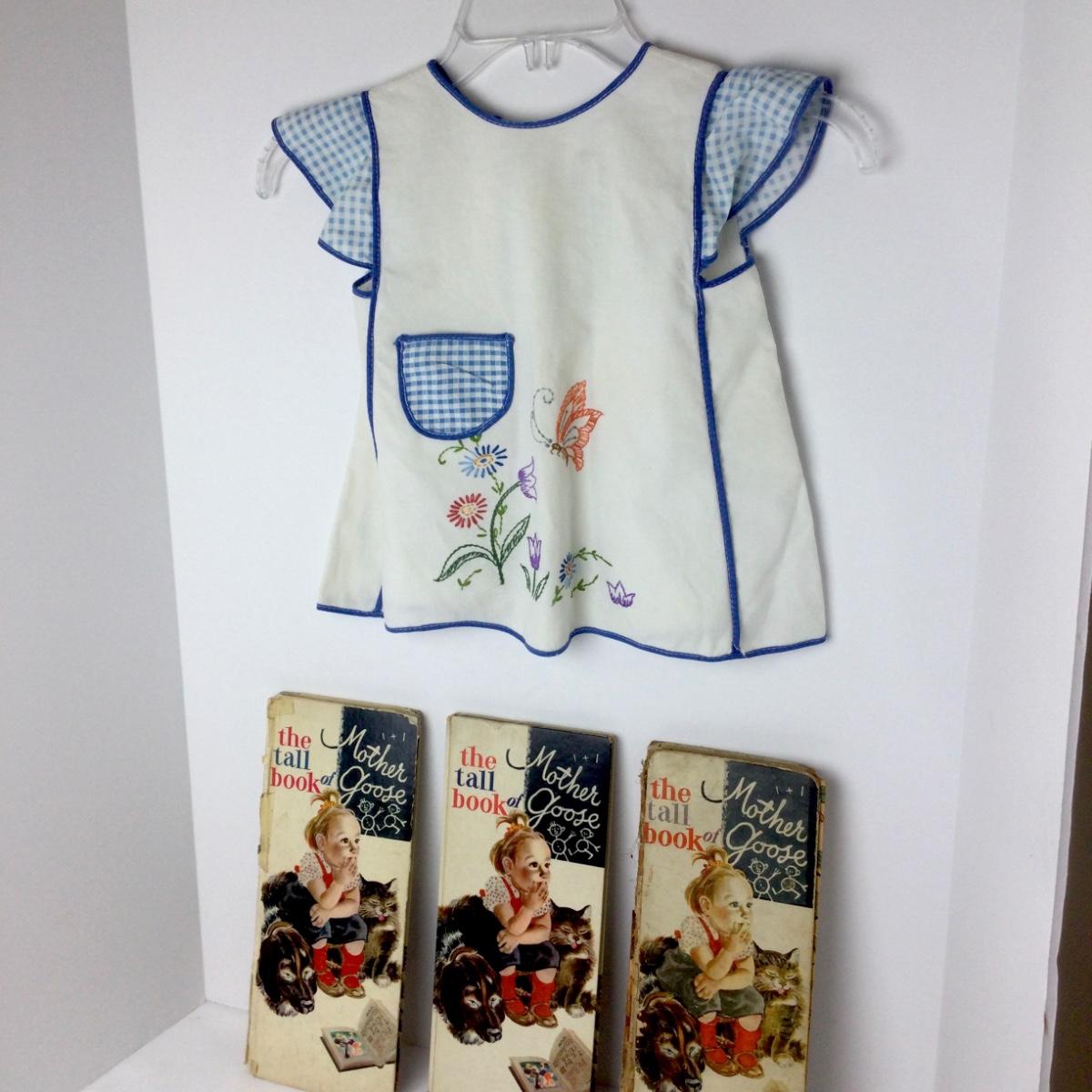 The smock/dress is in excellent condition and ties at the back-Toddler size (16” long x 9” from armpit to armpit). The books are duplicates of the same in various conditions-the best edition of the book is first edition.