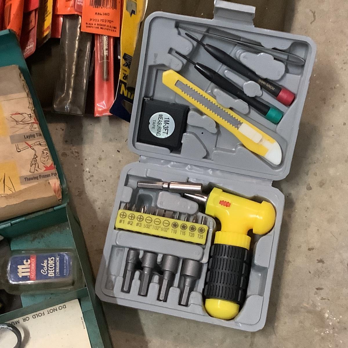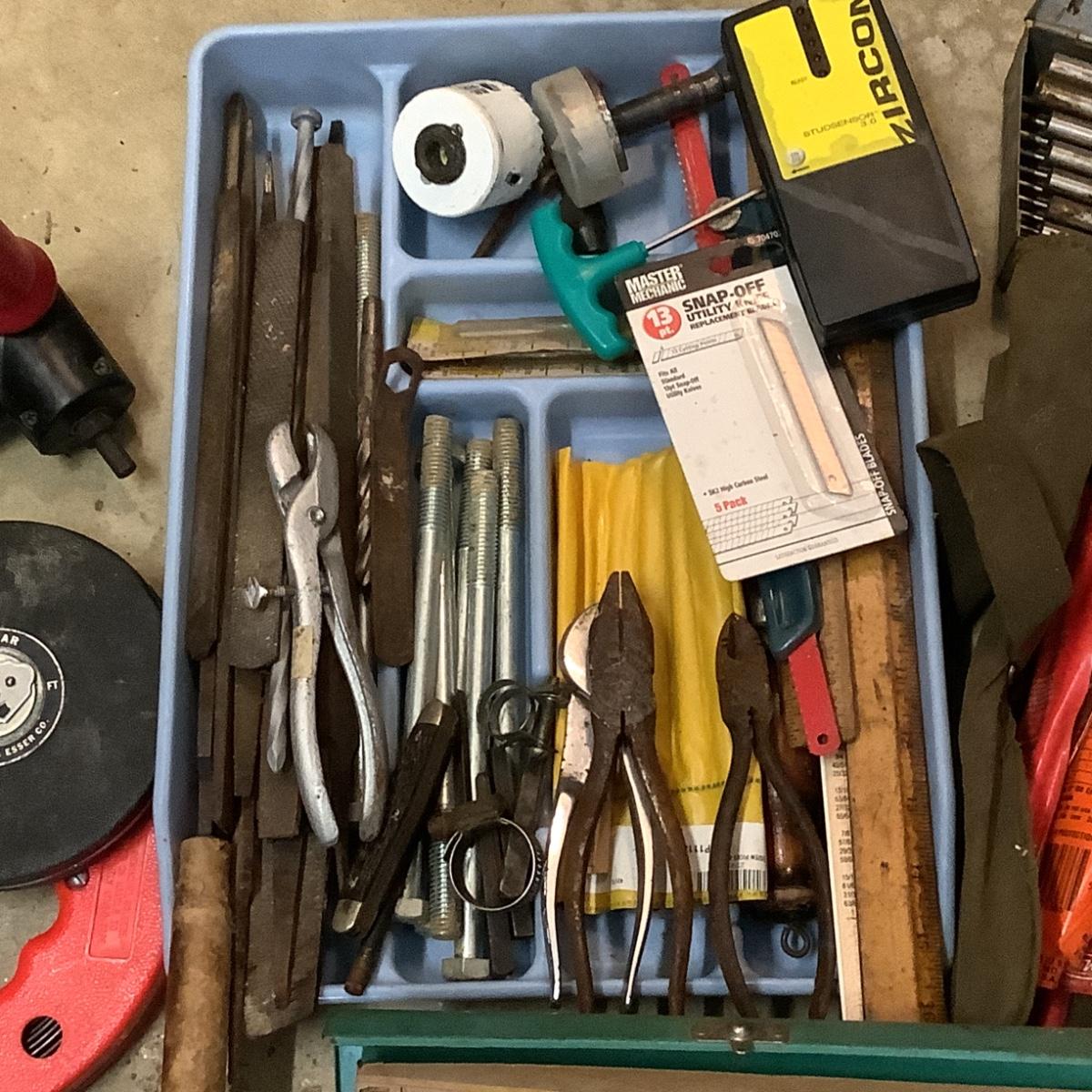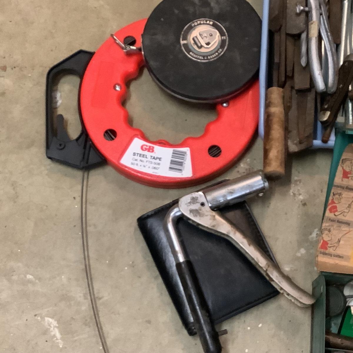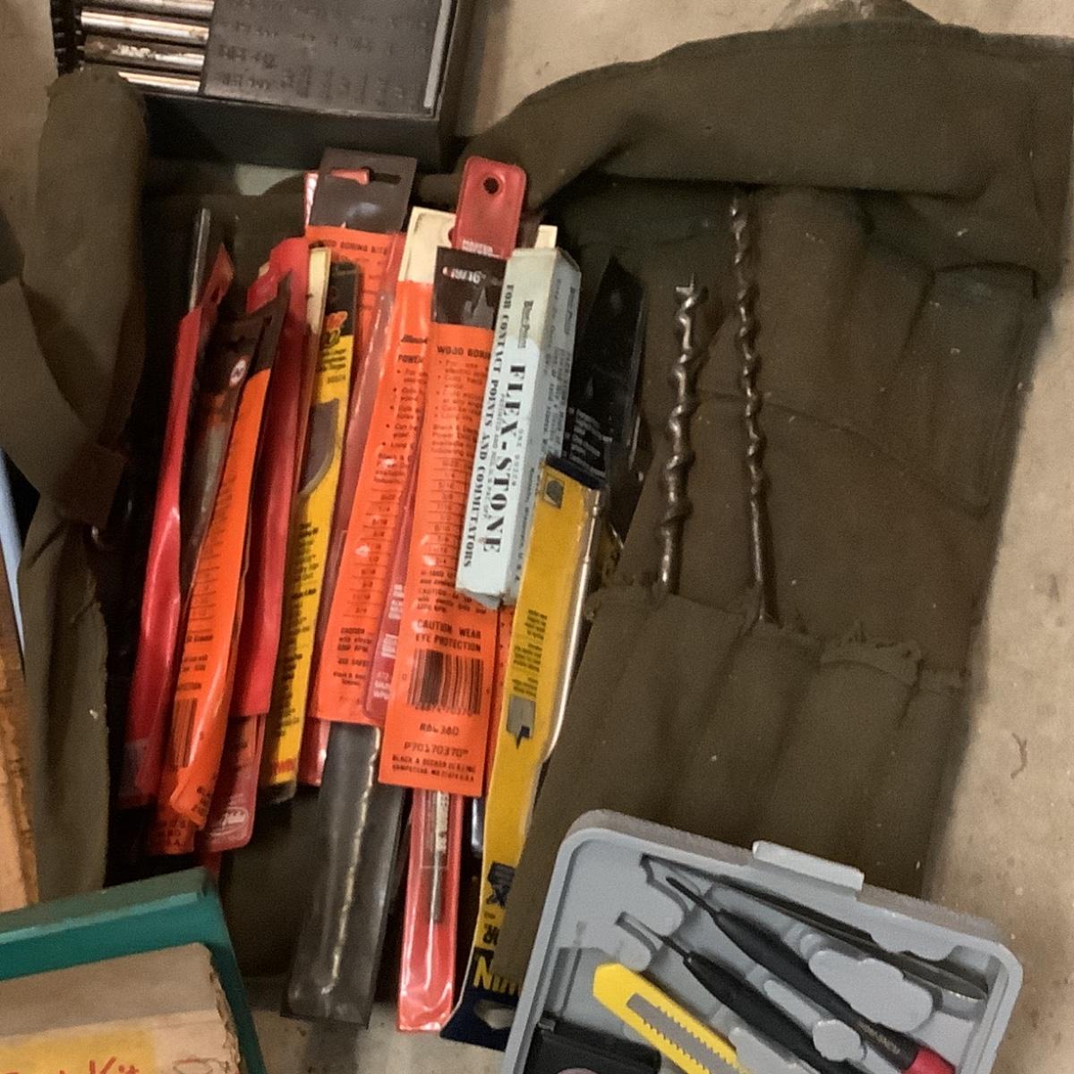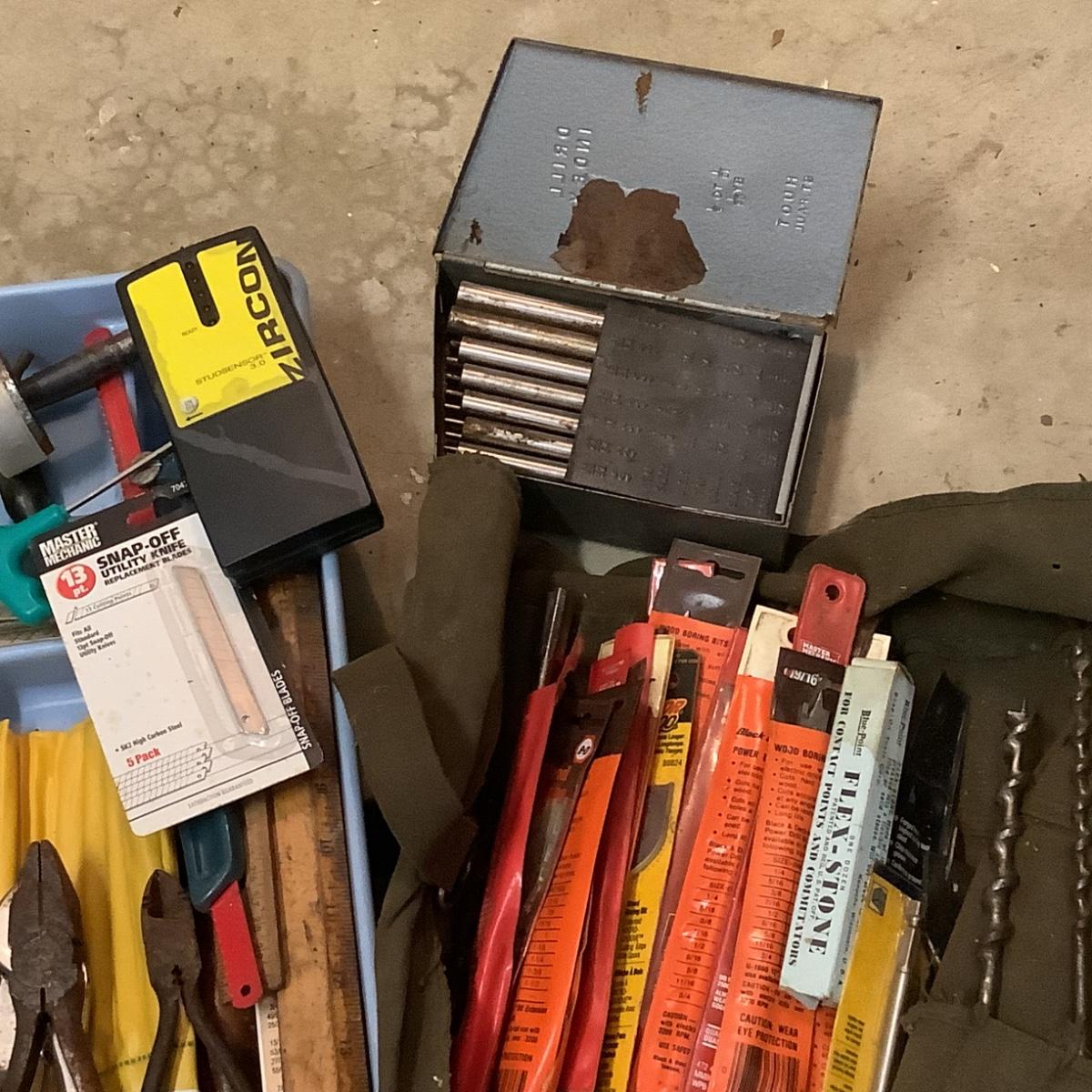 895 Lot of Misc. Tools , Steel Tape, Drill Bits, Pliers, Benz -O-Matic and more