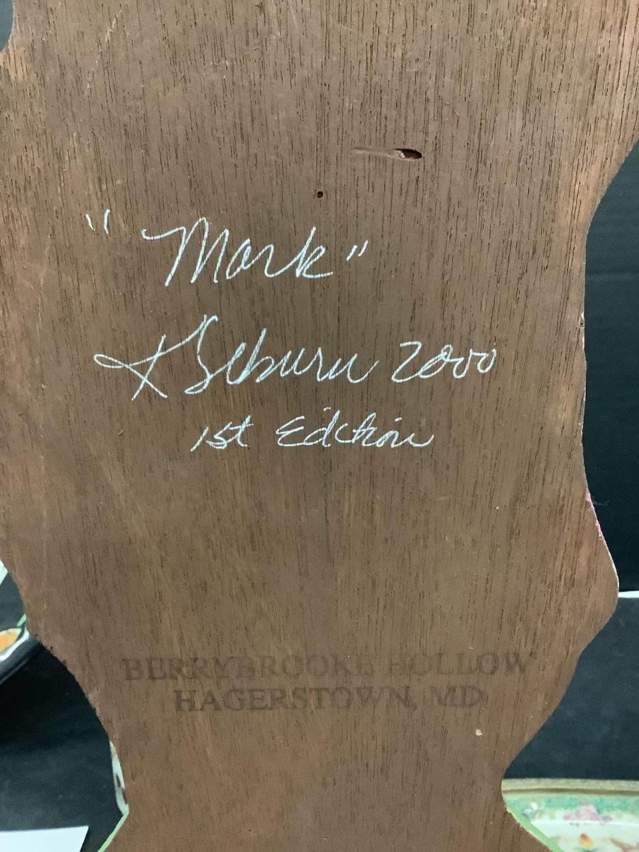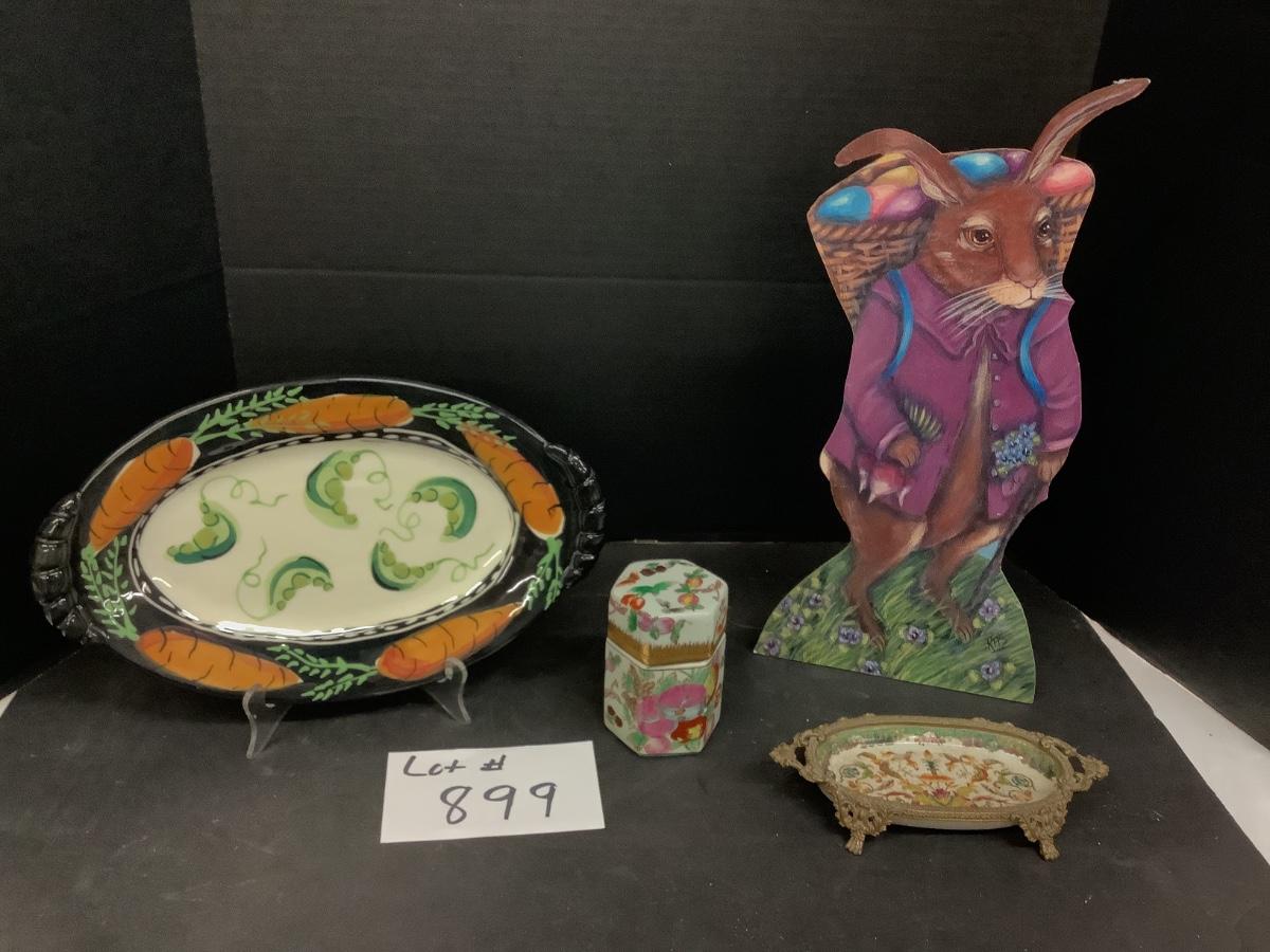 Signed & hand painted wood bunny decor, carrot serving plate, small porcelain container and tray. Wooden Bunny 16"