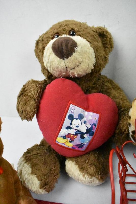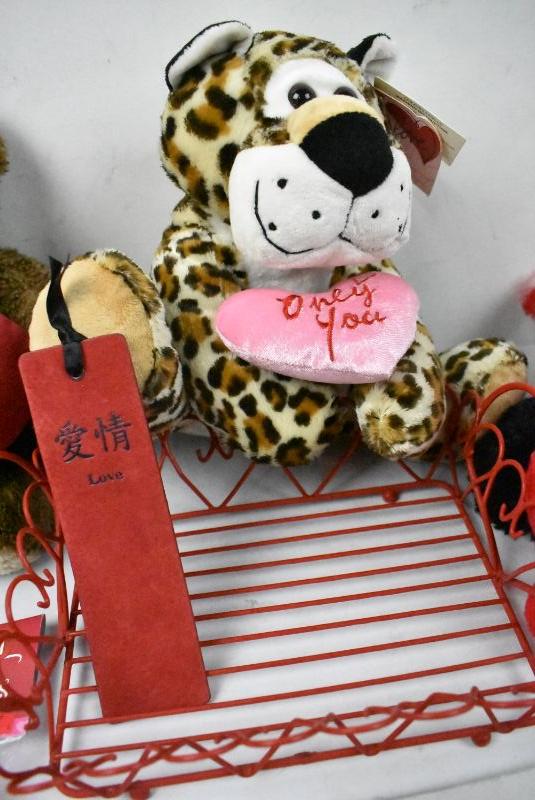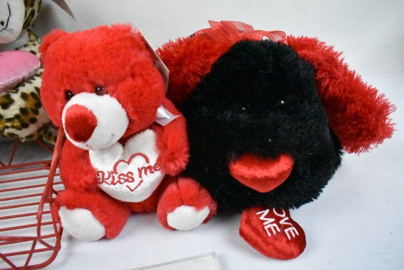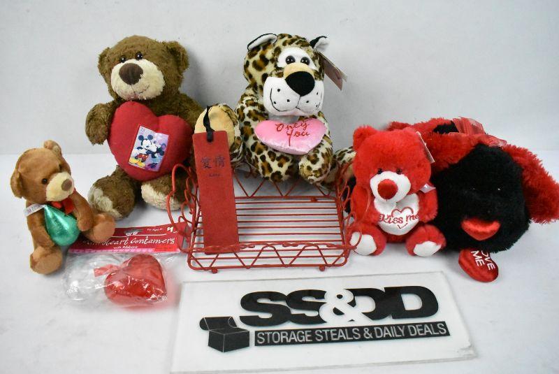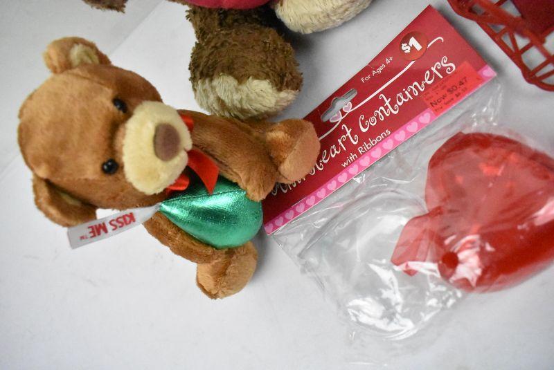 8 pc Valentine's Day Lot: 5 Stuffed Animals, Set of Plastic Containers, 1 Tray/Basket, 1 Leather Bookmark
