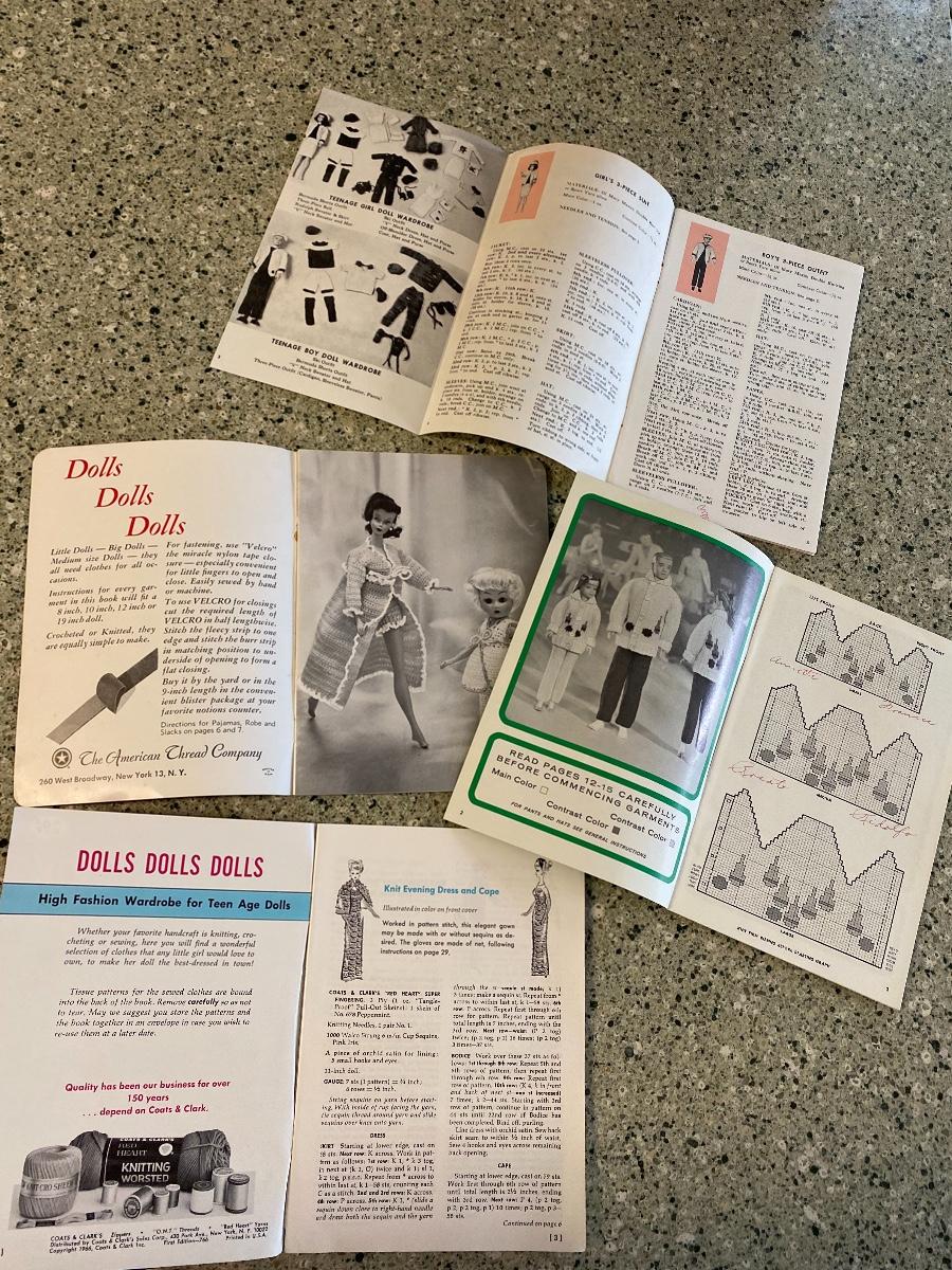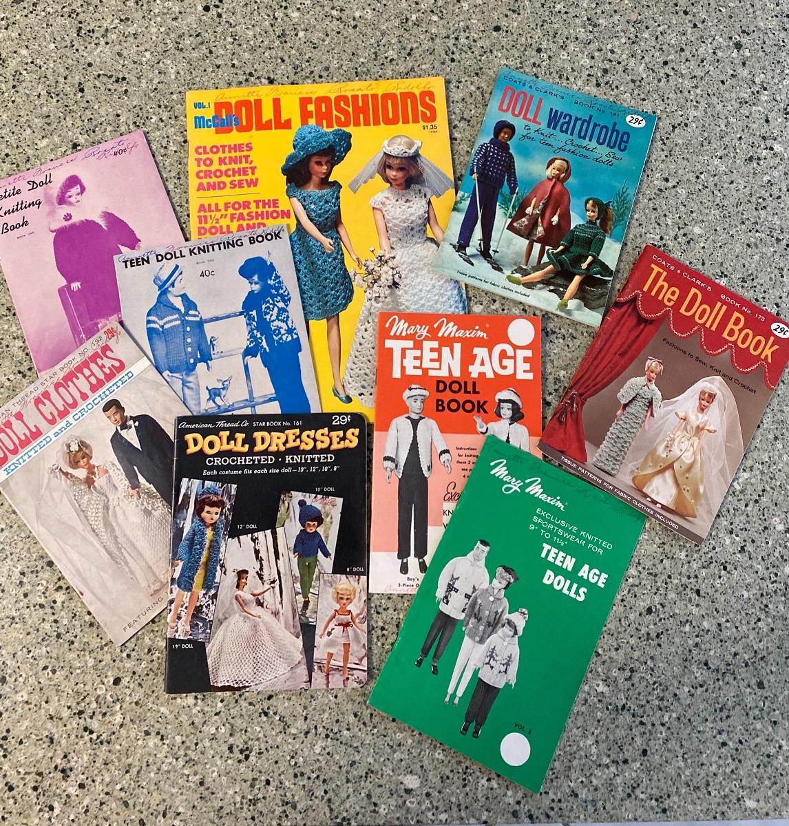 Lot of 9 assorted vintage knitting and crocheting doll clothes magazines for Barbie sized dolls.