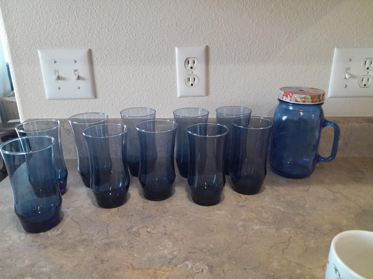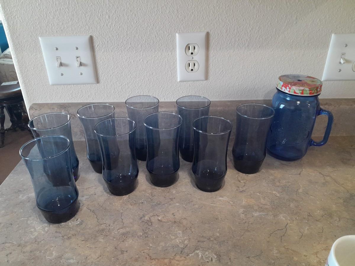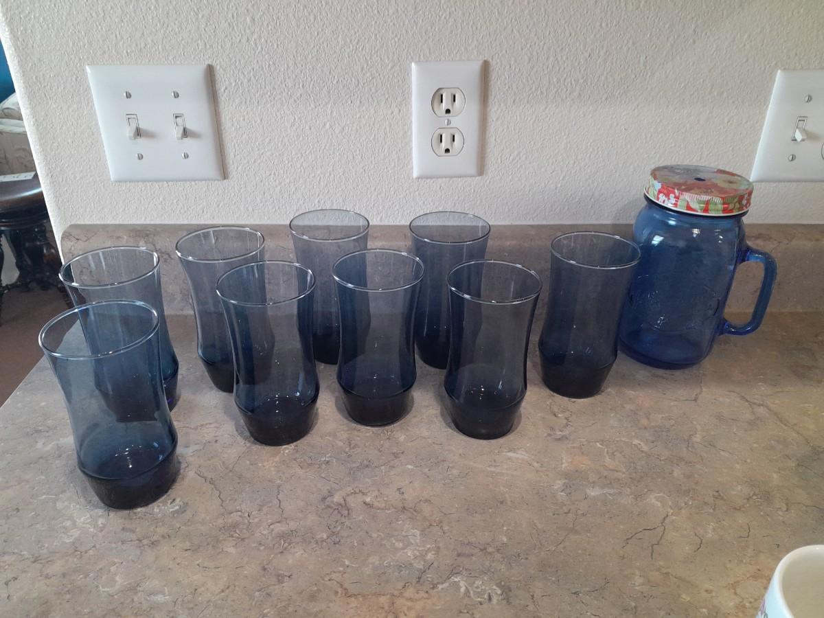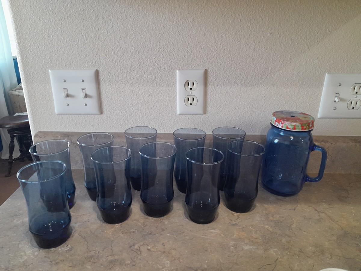 9 BLUE DRINKING GLASSES AND A LARGE JAR DRINKING GLASS