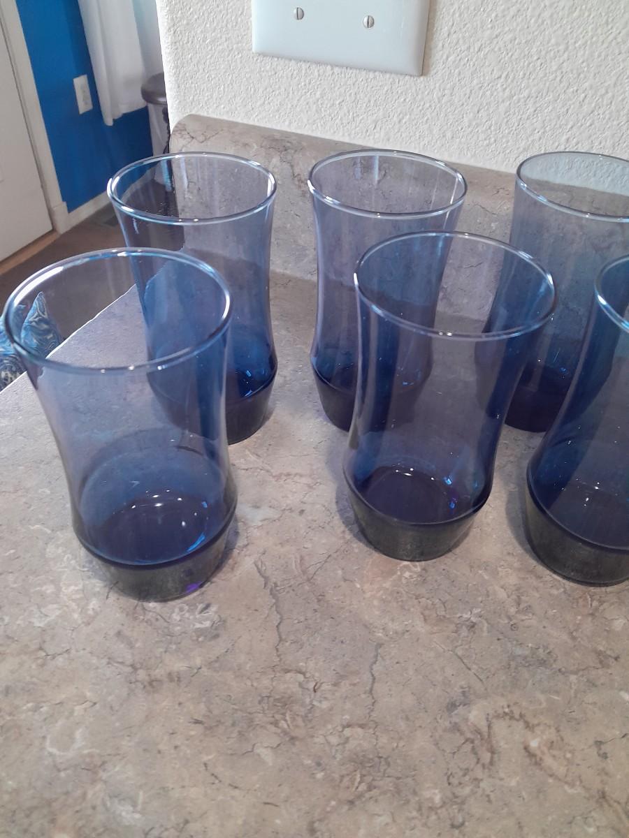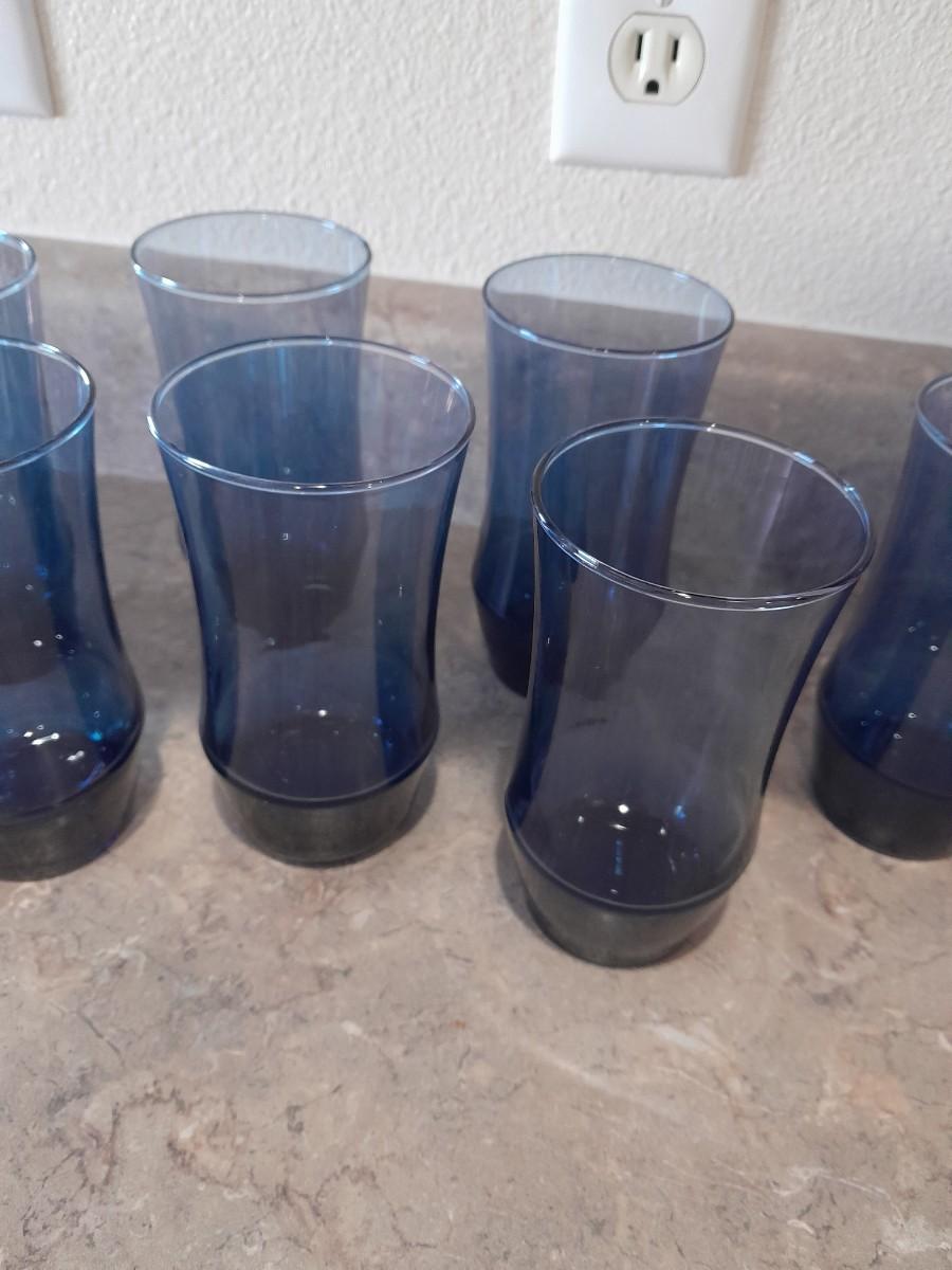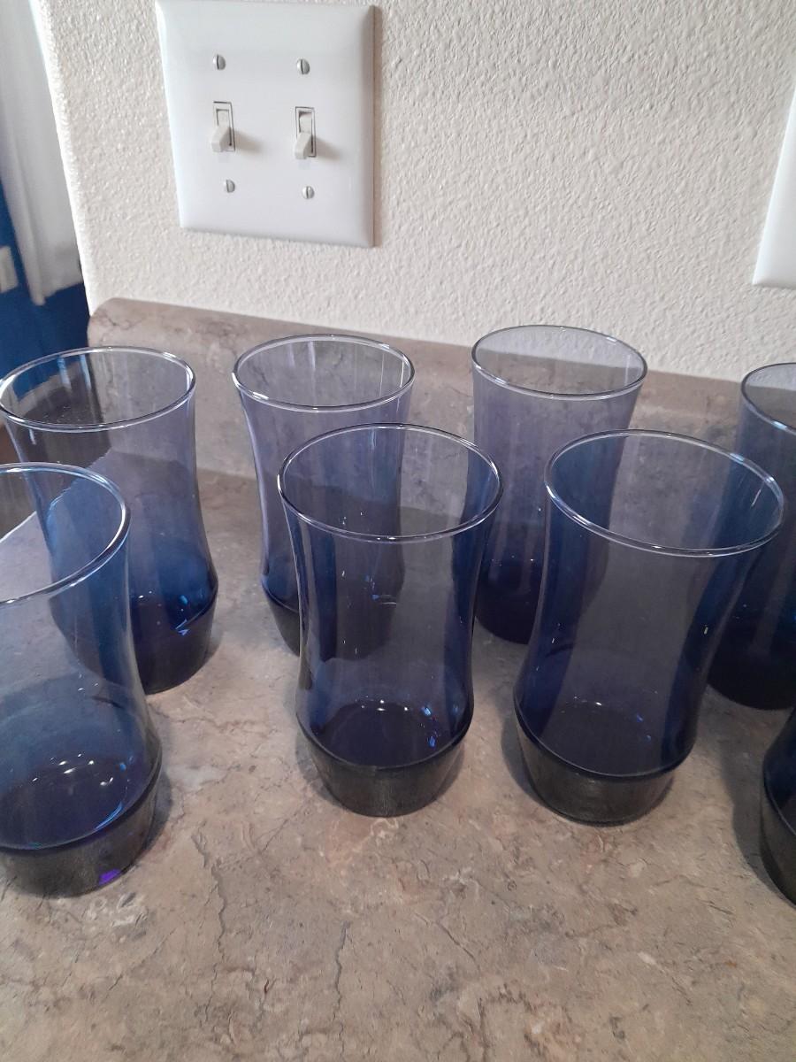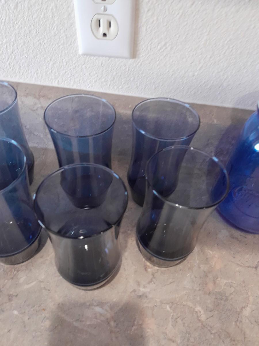 9 BLUE DRINKING GLASSES AND A LARGE JAR DRINKING GLASS