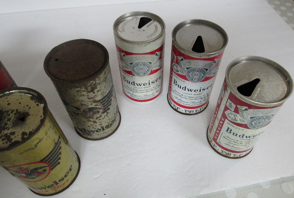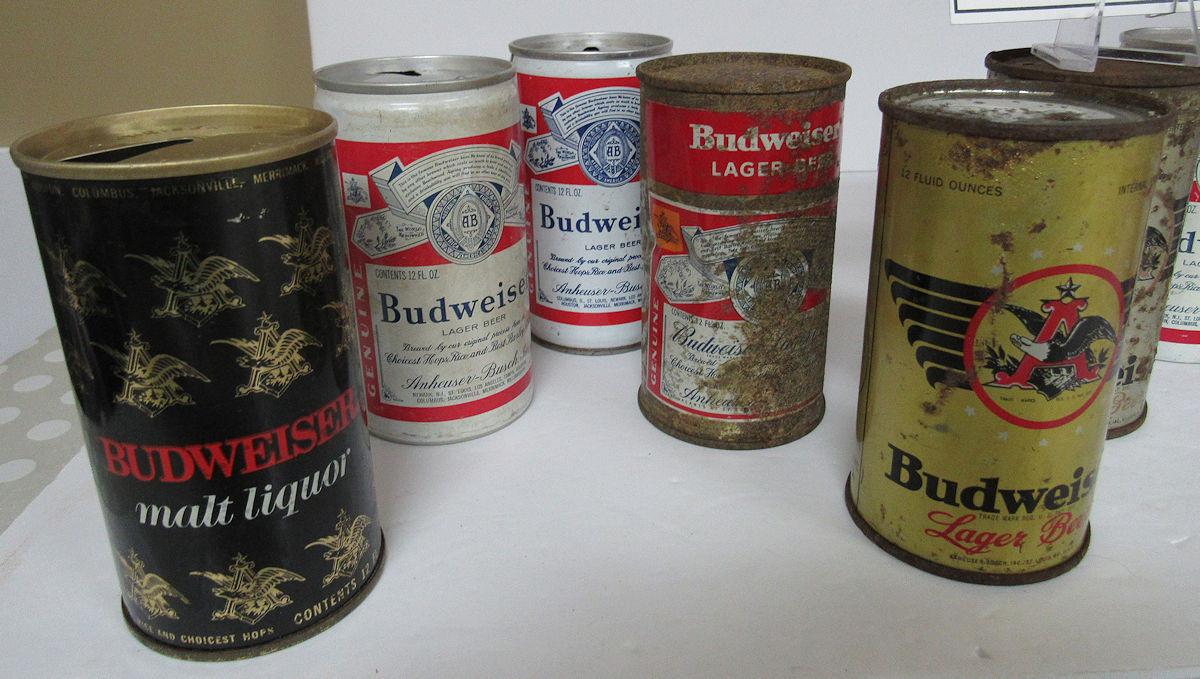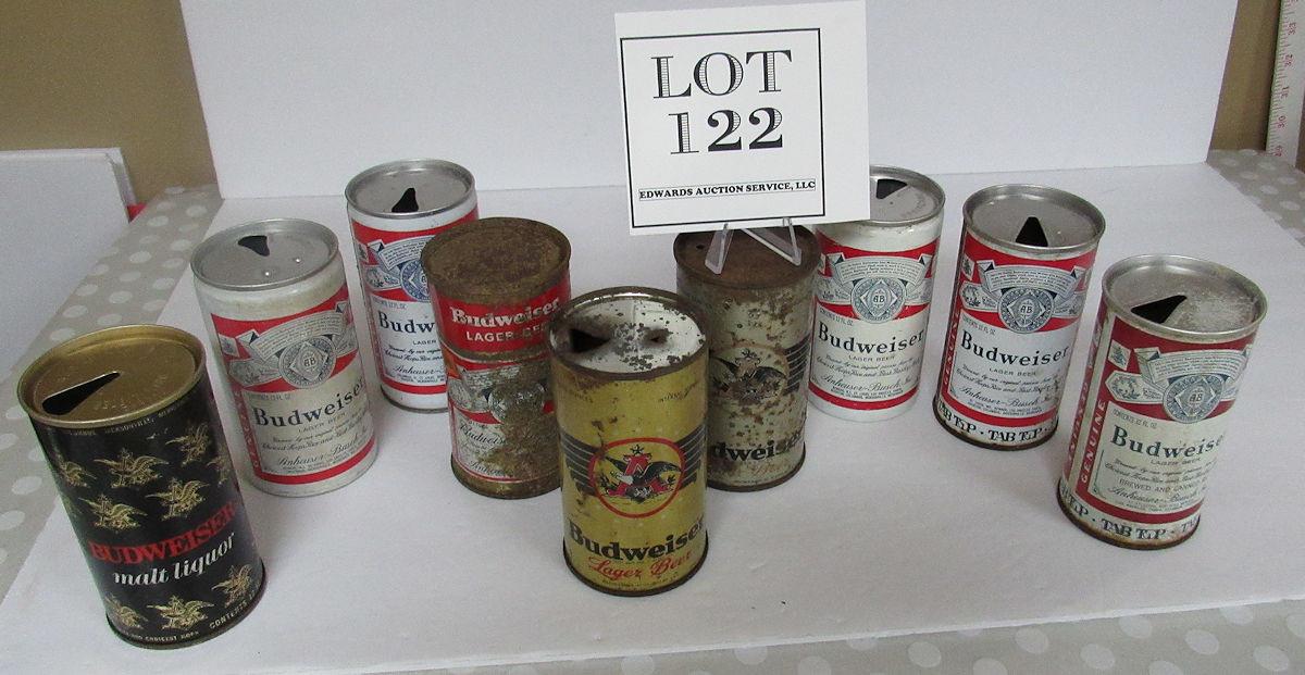 9 Different Budweiser Vintage Beer Cans some Flat Tops. Read description for more info