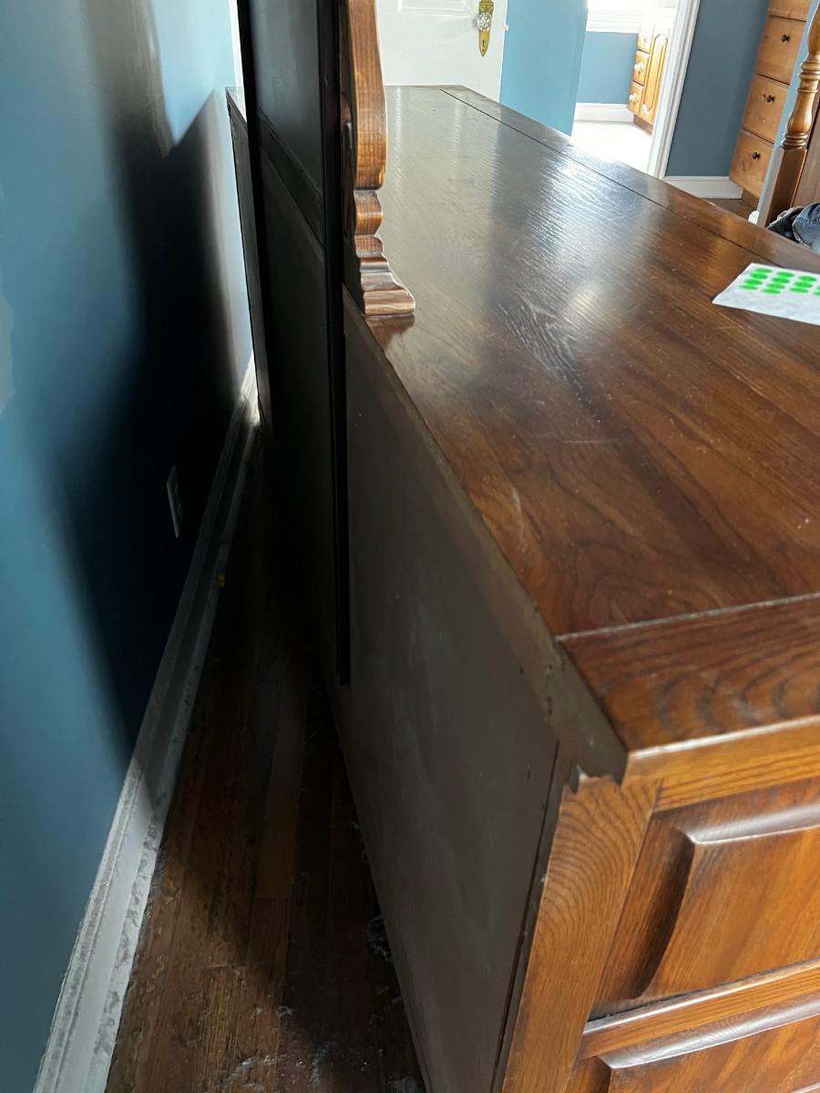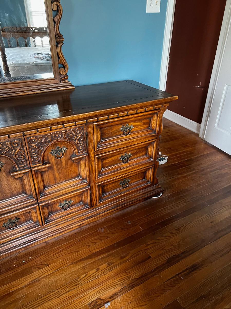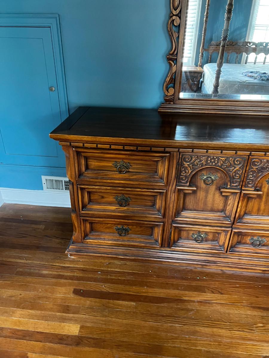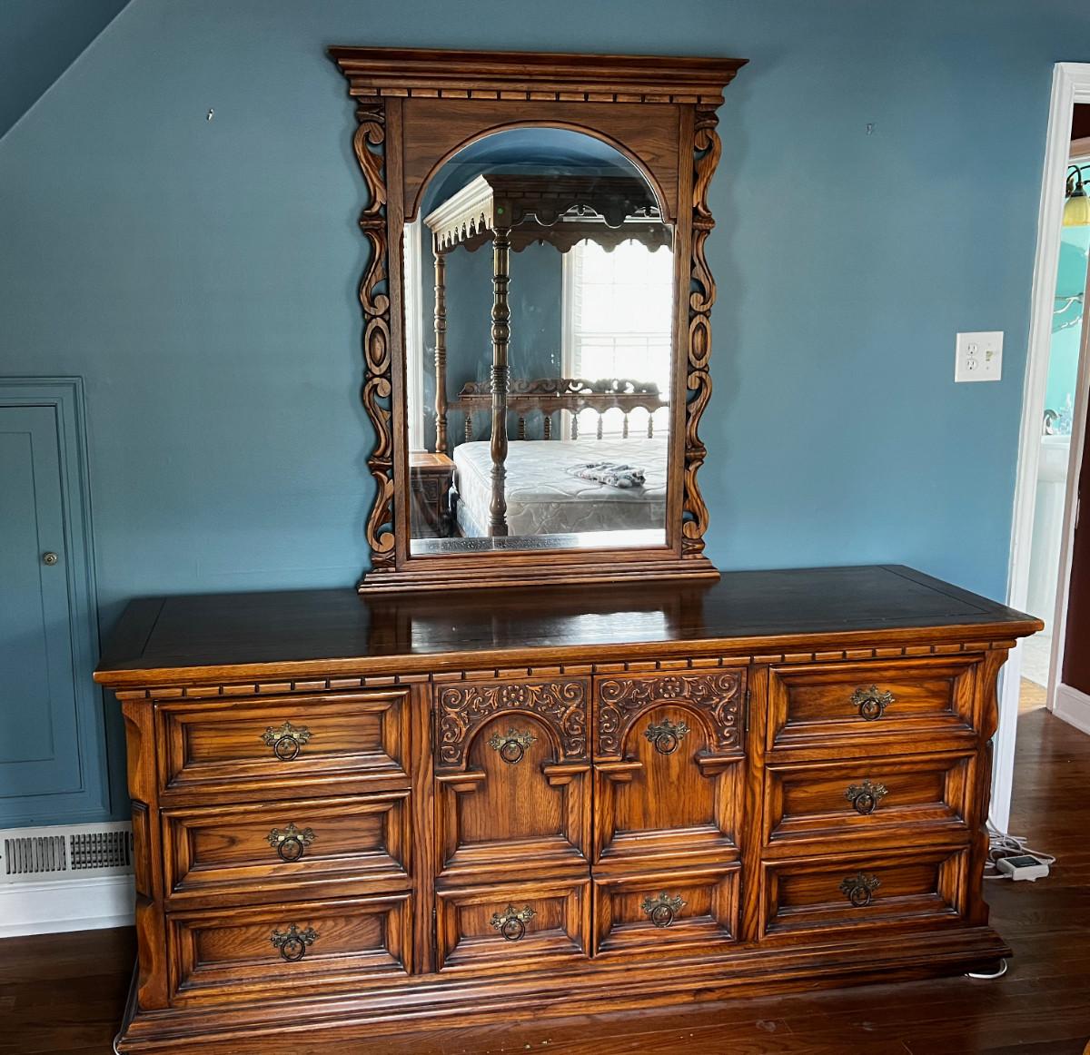76" Long x 22 x 32" Tall, Good Condition with Mirror included. 38 x 48" Must Bring Help to carry down the stairs