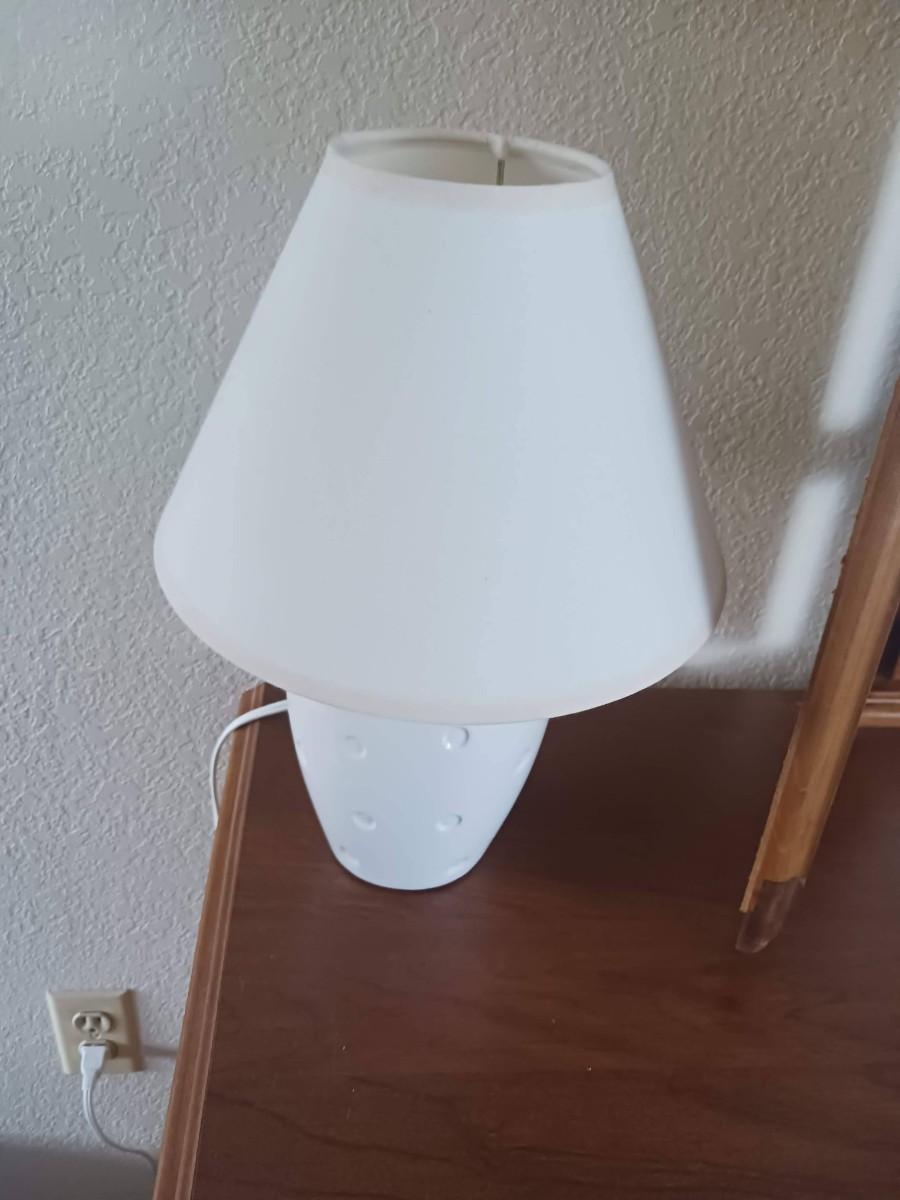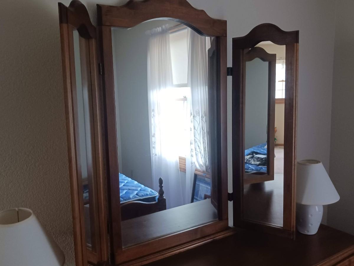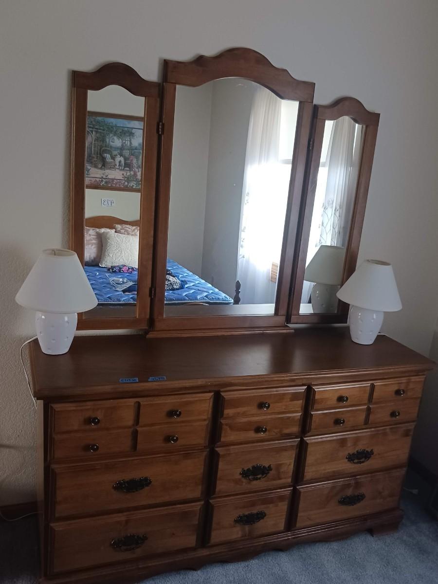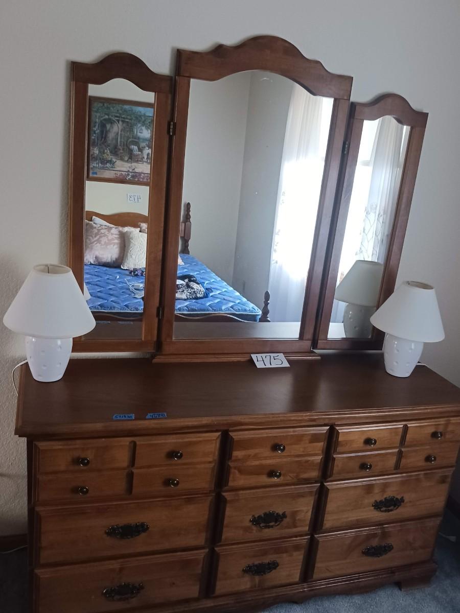 9 DRAWER DRESSER WITH HINGED MIRROR AND 2 SMALL LAMPS