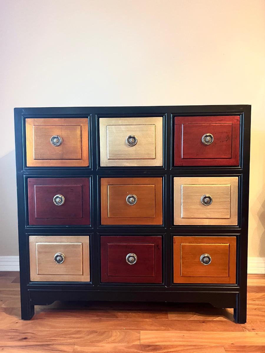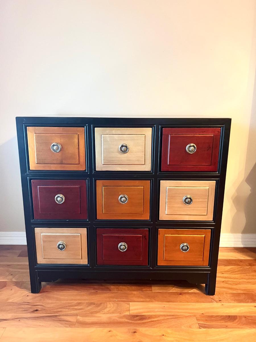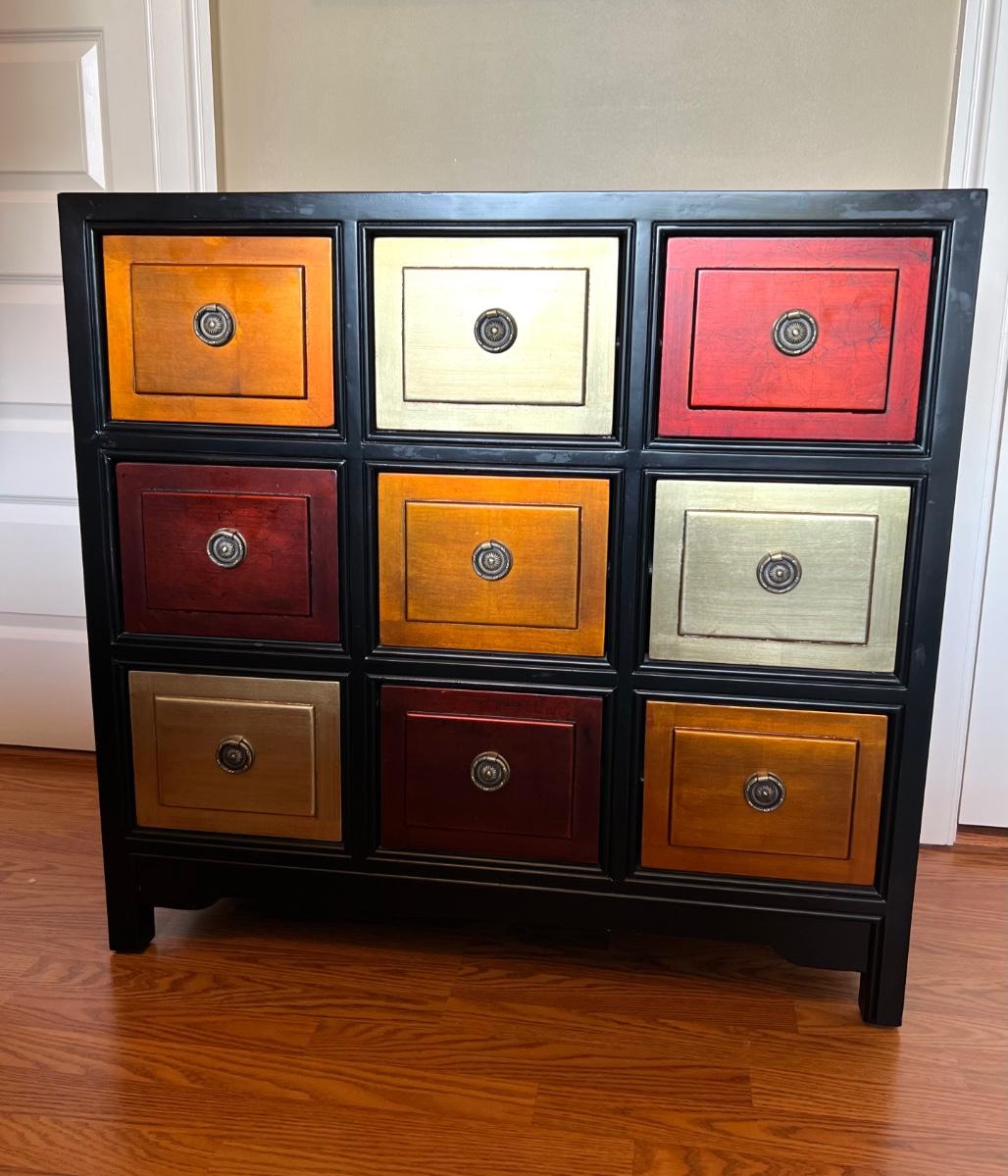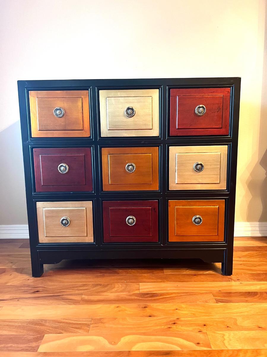 9 Drawer Multi Colored accent table. Measures 35 inches tall, 36 1/2 wide and 18 1/2 inches deep.
