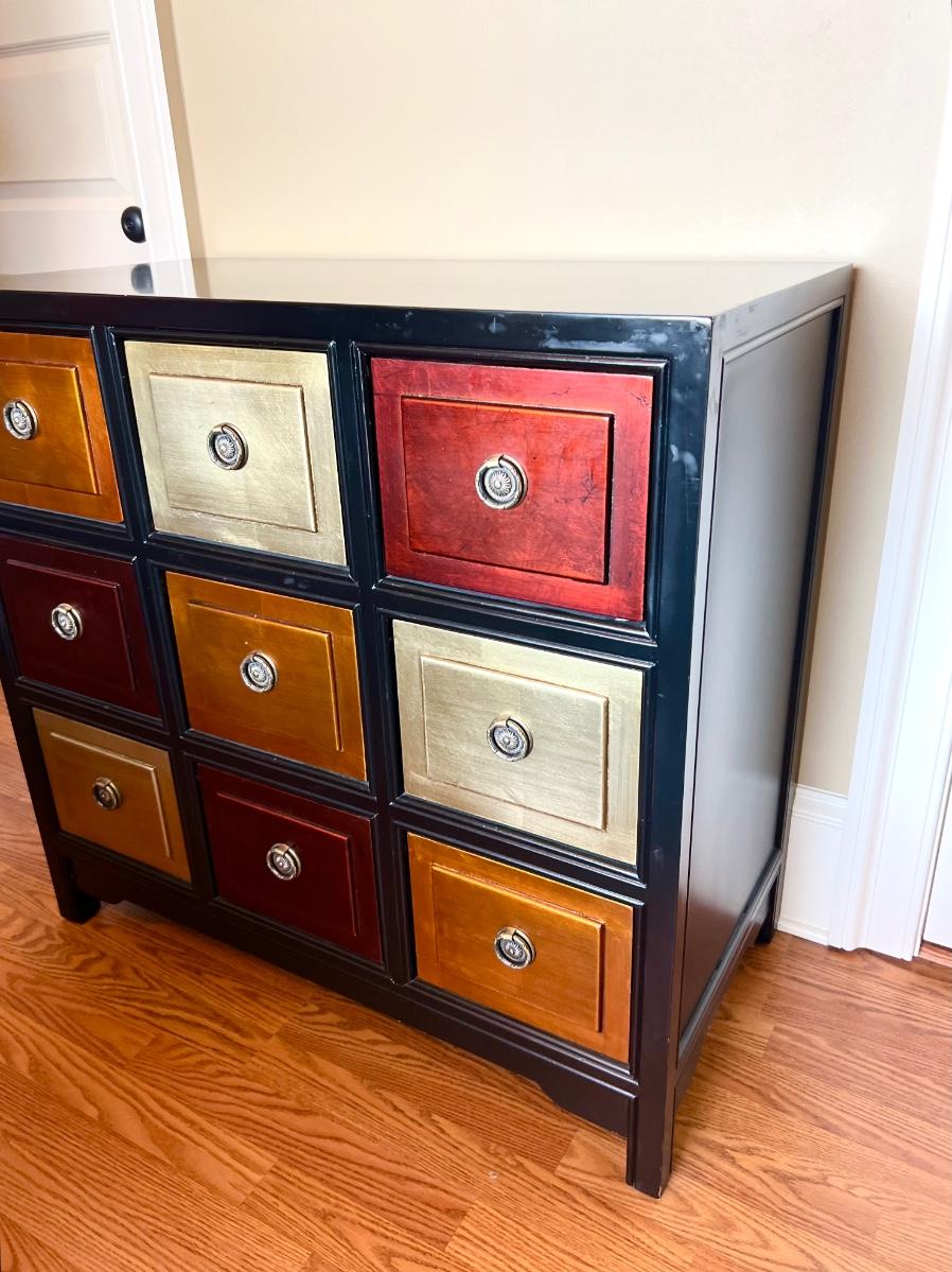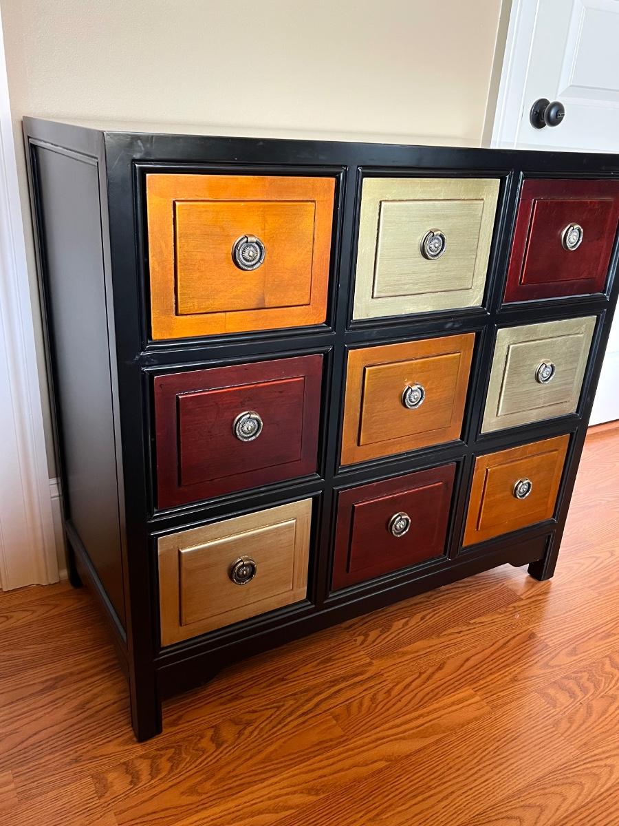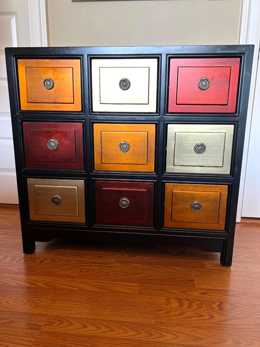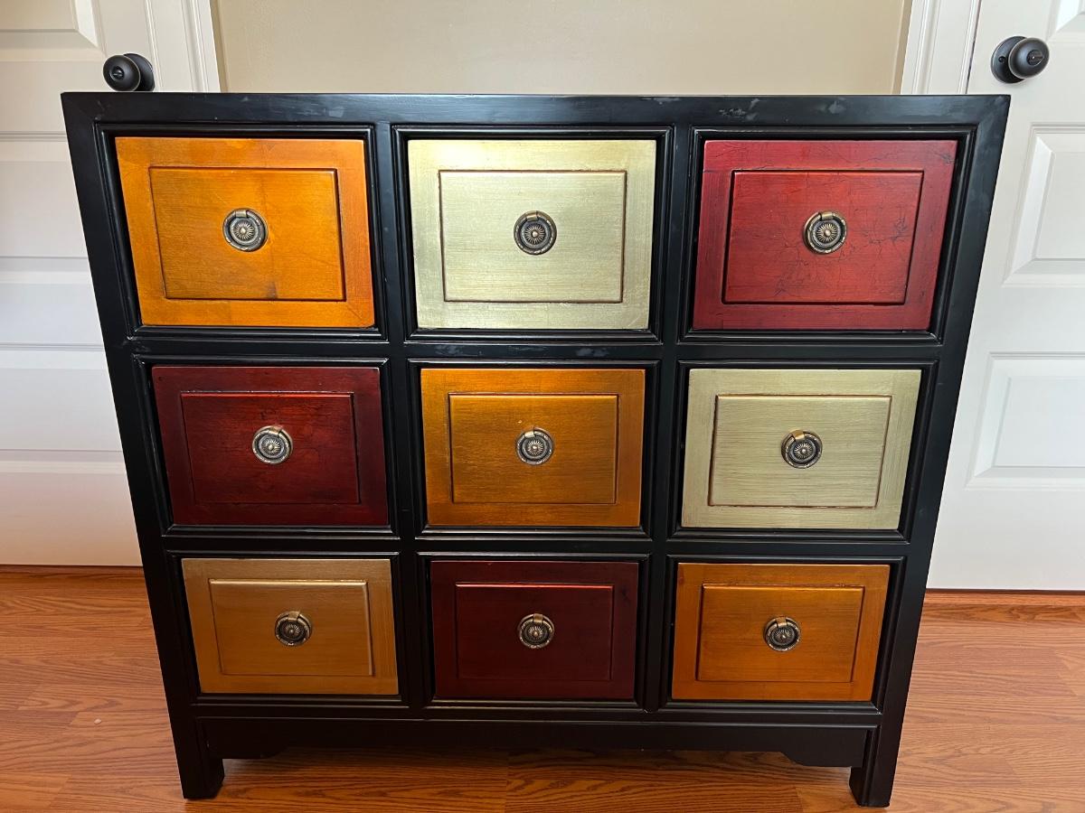 9 Drawer Multi Colored accent table. Measures 35 inches tall, 36 1/2 wide and 18 1/2 inches deep.