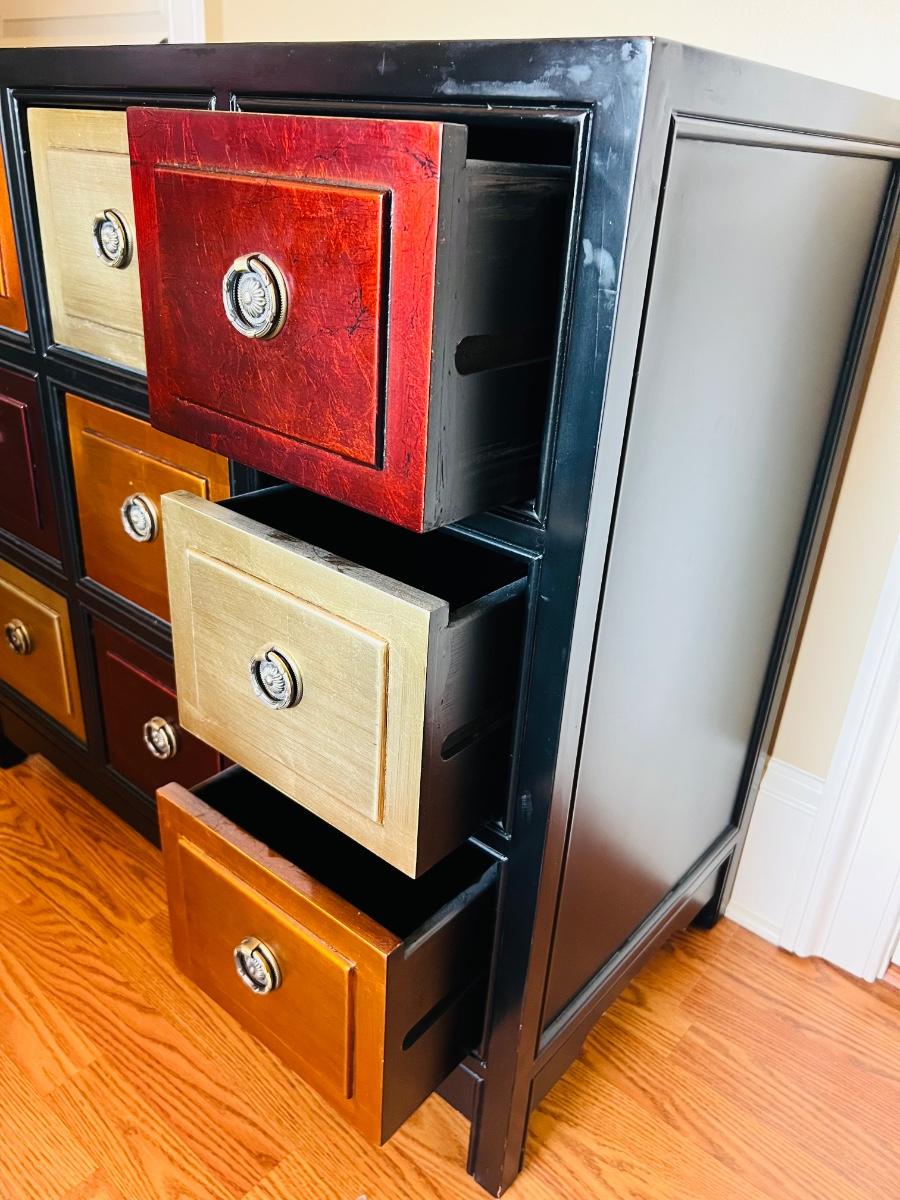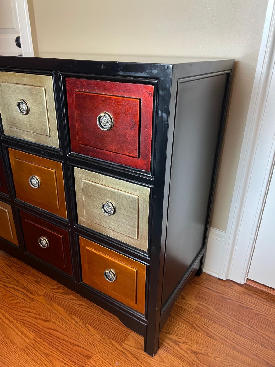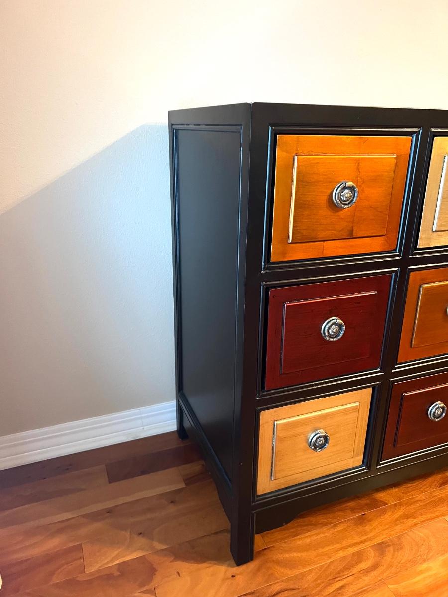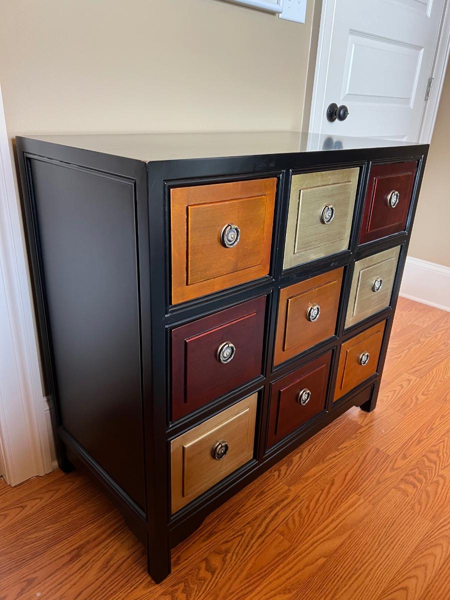 9 Drawer Multi Colored accent table. Measures 35 inches tall, 36 1/2 wide and 18 1/2 inches deep.