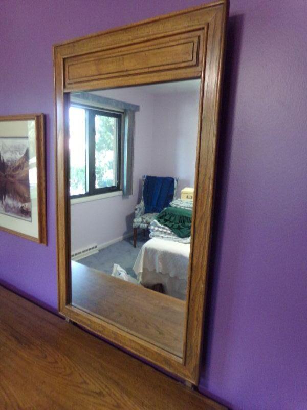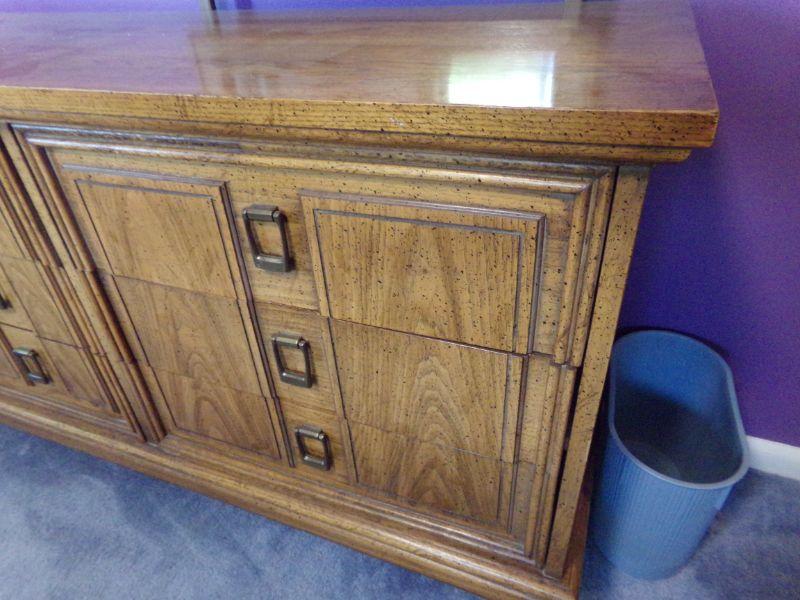 9 DRAWER WOODEN DRESSER WITH MIRROR. THE DRESSER MEASURES 30-1/2"H x 66-1/4"W x 18-1/2"D, WITH THE MIRROR ON IT ADDS ANOTHER 44 INCHES IN HEIGHT. SO THE TOTAL HEIGHT WITH DRESSER AND MIRROR IS 74-1/2". ALSO INCLUDES A PICTURE.